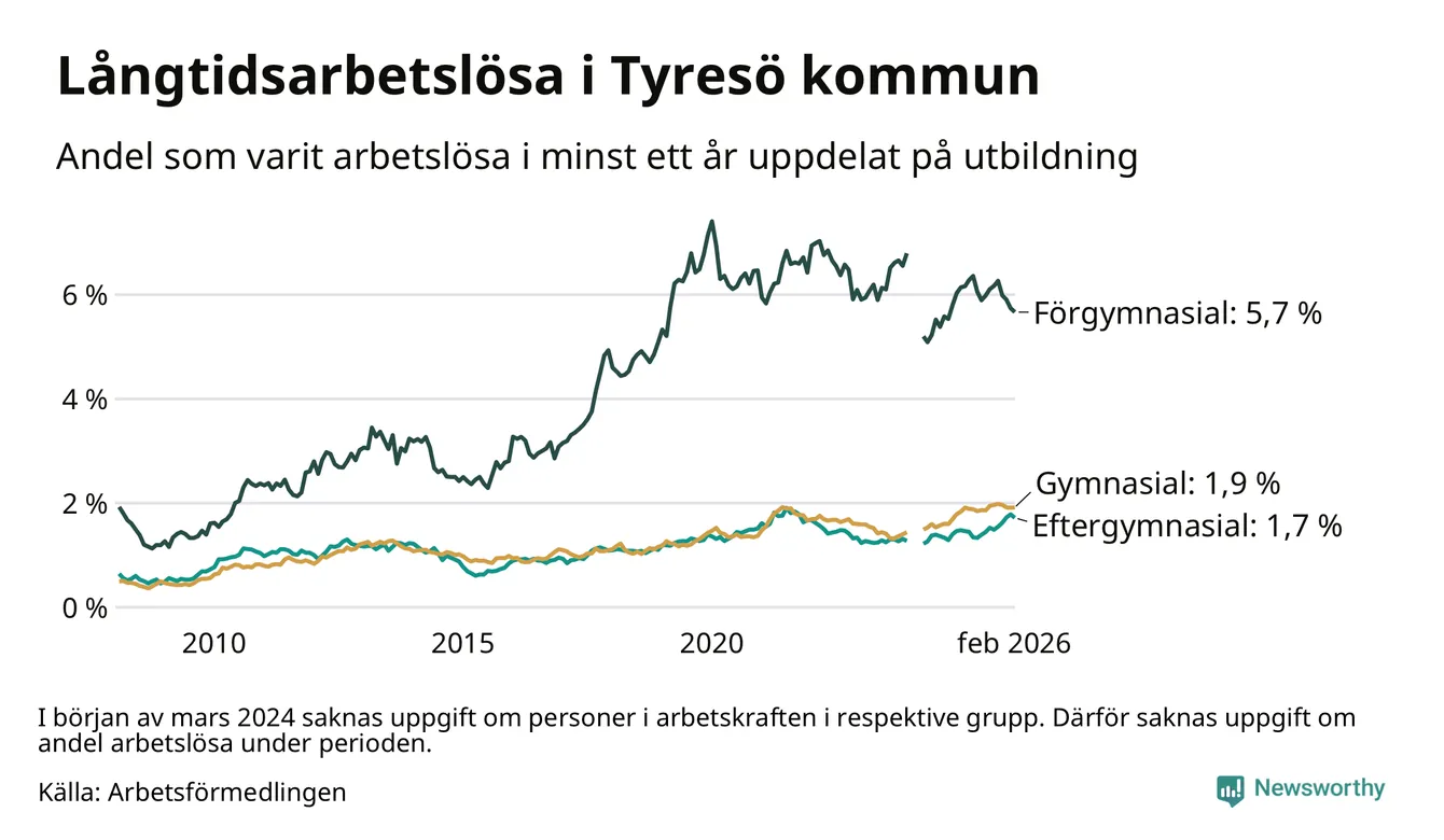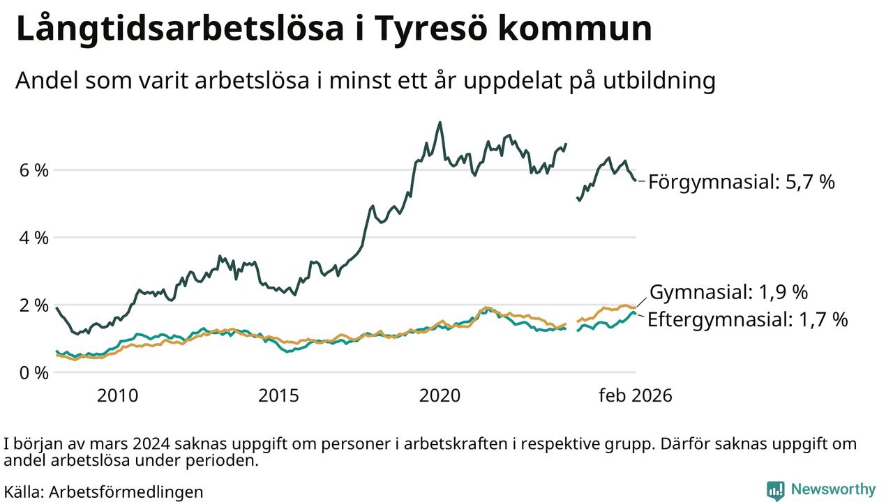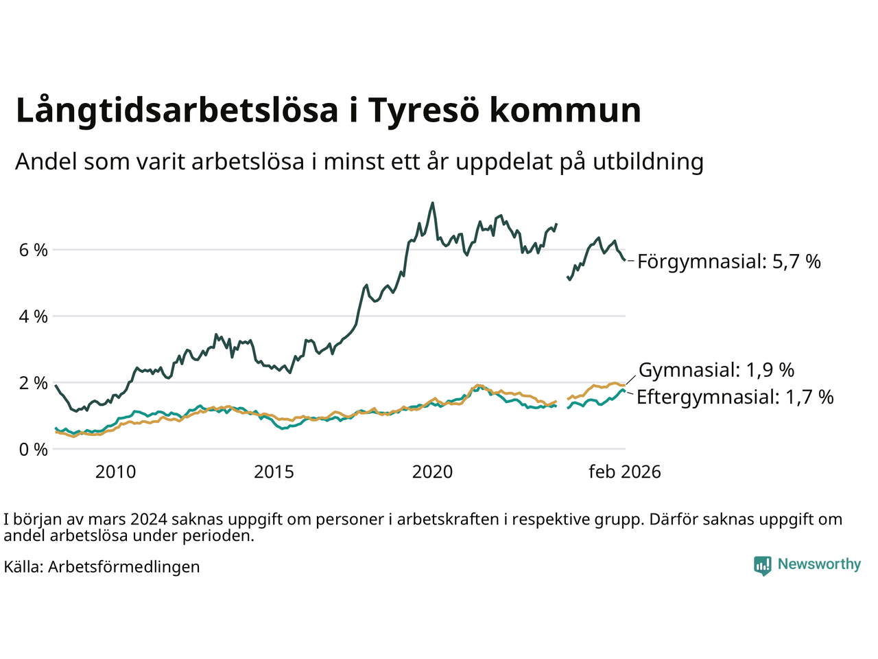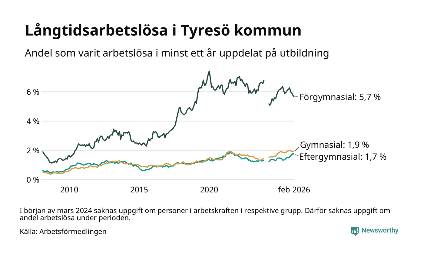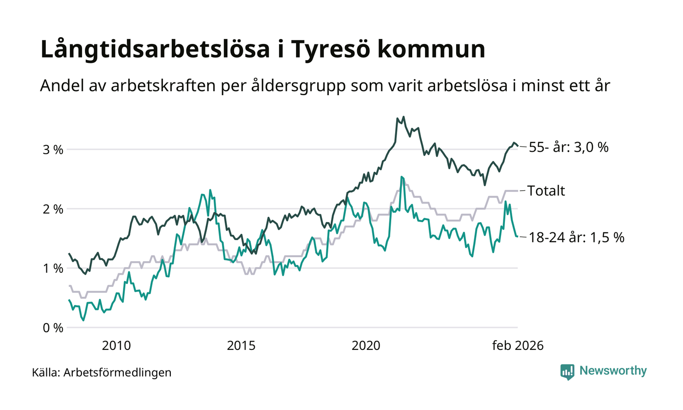 I februari hade 578 Tyresöbor varit arbetslösa i minst ett år, vilket är nio färre än månaden innan. 578 personer motsvarar 2,3 procent av arbetskraften i kommunen – andelen långtidsarbetslösa är ungefär på samma nivå som för ett år sedan.