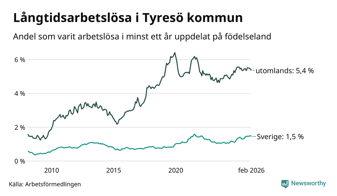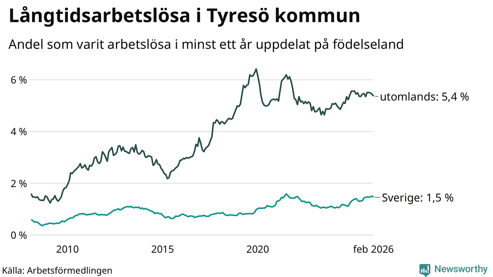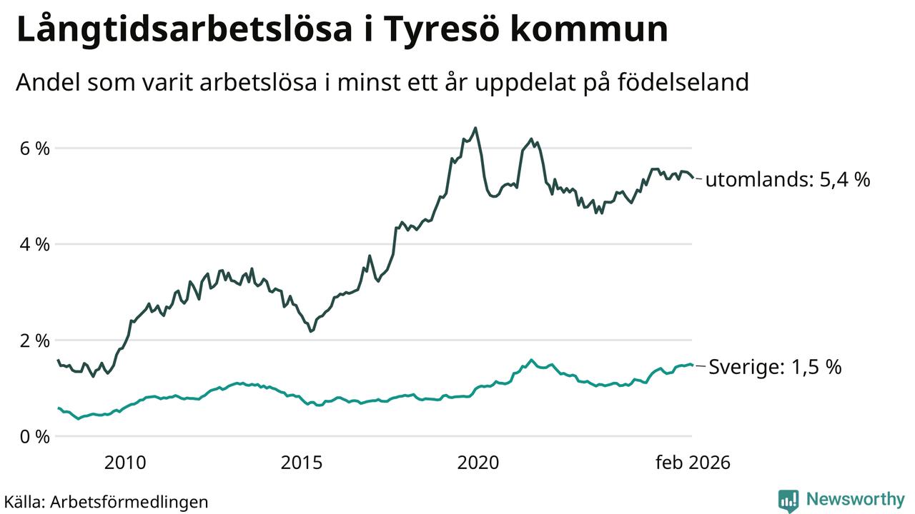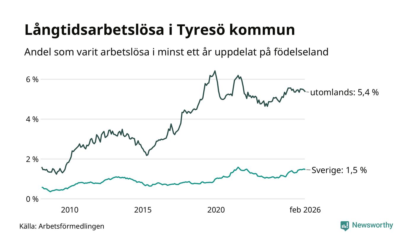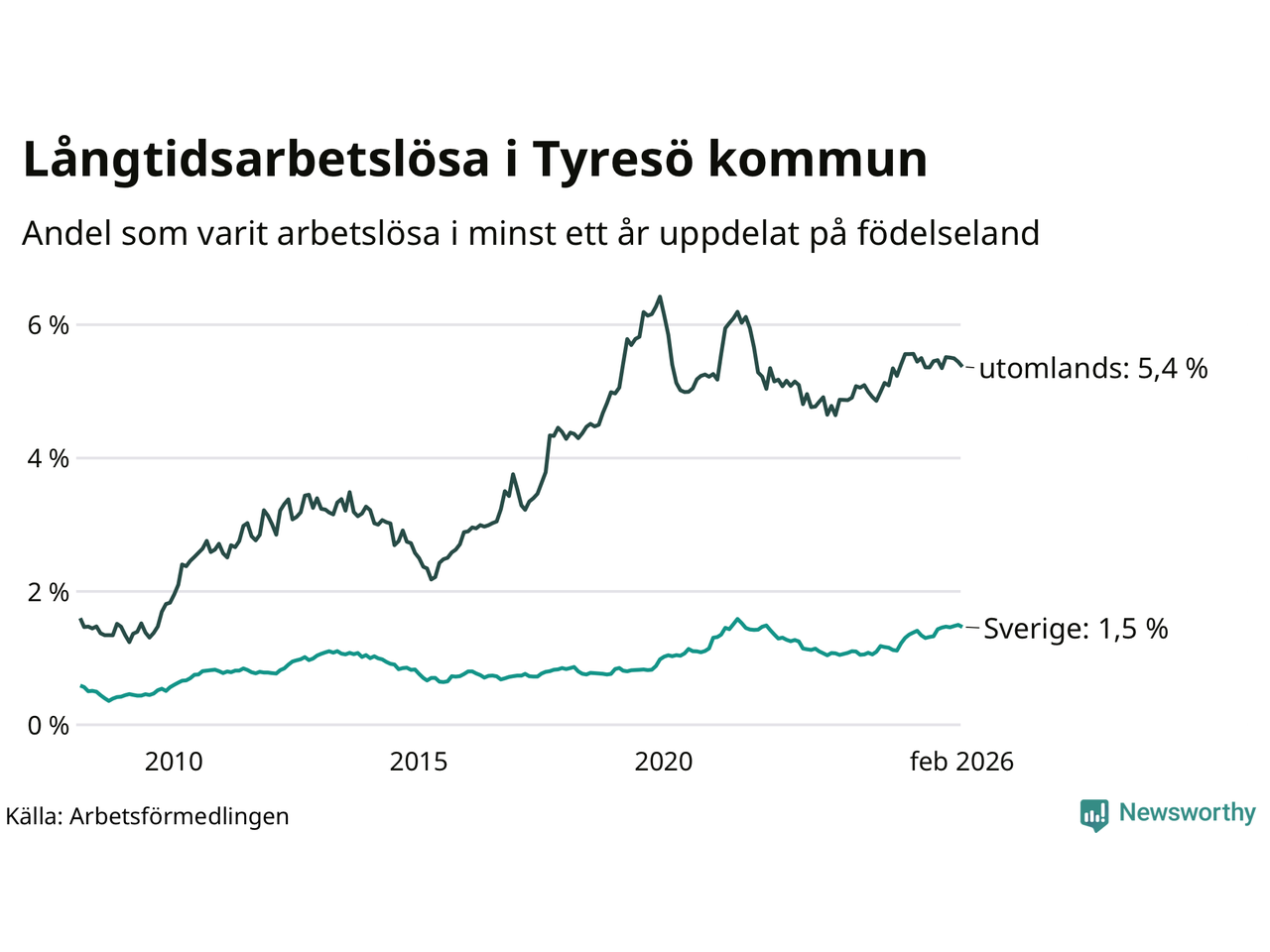 296 av de långtidsarbetslösa i Tyresö är födda i Sverige, medan 282 är födda utomlands. Det innebär att långtidsarbetslösheten bland Sverigefödda är 1,5 procent, medan den är fyra gånger så hög – 5,4 procent – bland födda utomlands. Även i riket som helhet är arbetslösheten högre bland utrikesfödda.