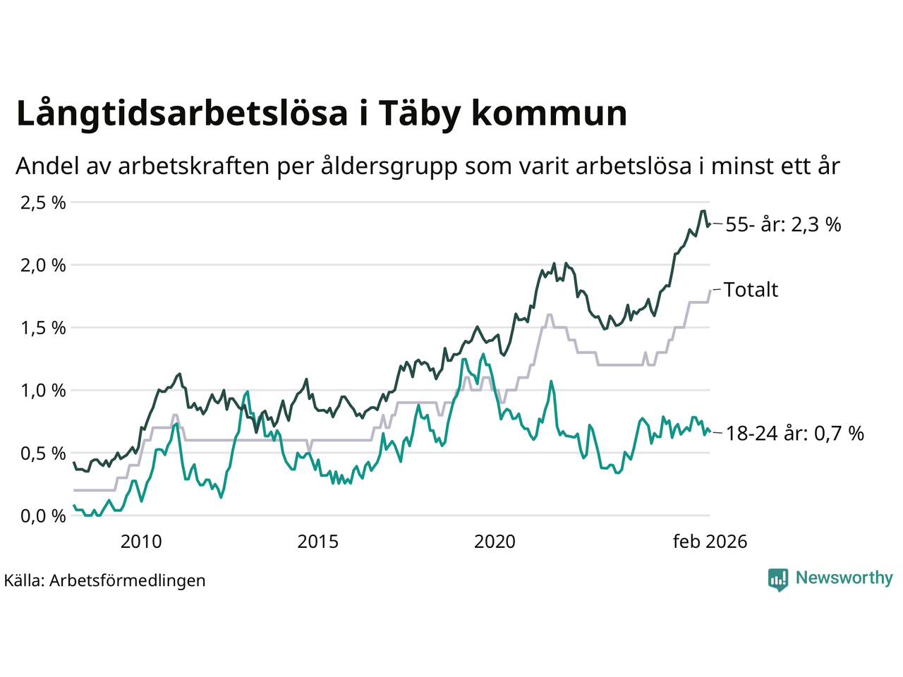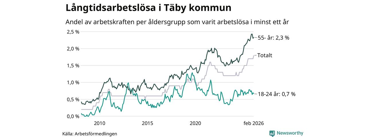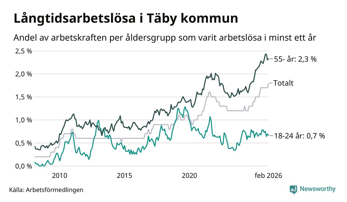 Av de 689 personerna som varit arbetslösa i mer än ett år i Täby kommun är 200 personer mellan 55 och 661 år och 25 är mellan 18 och 24 år. För den äldre gruppen är andelen arbetslösa 2,3 procent medan den i den yngre gruppen är 0,7 procent. Även i riket som helhet är långtidsarbetslösheten högre i gruppen äldre.