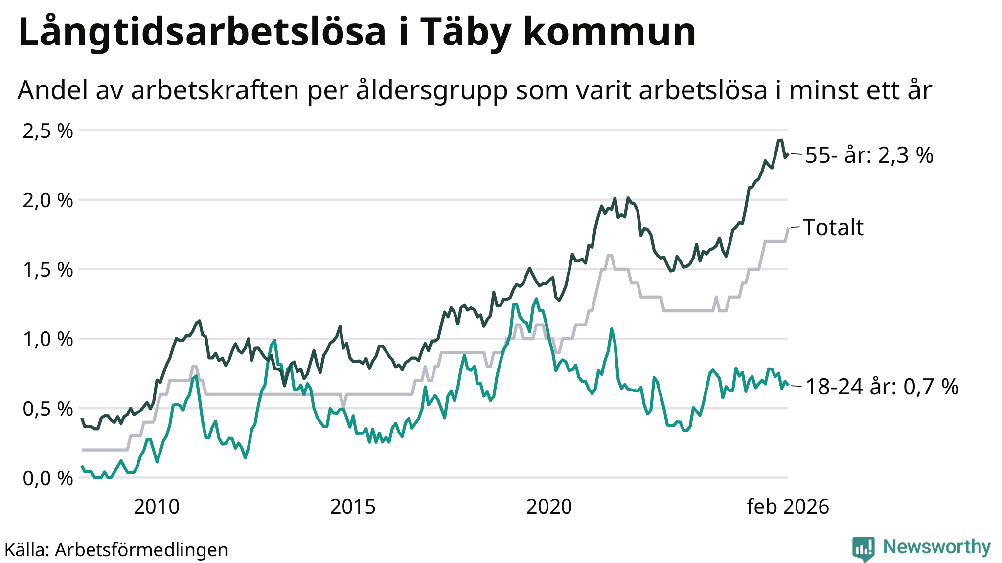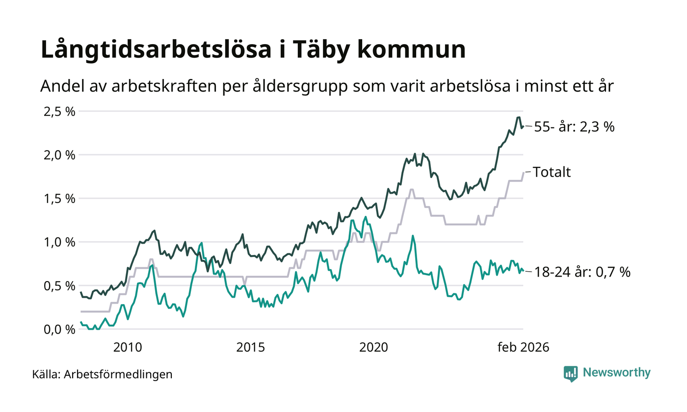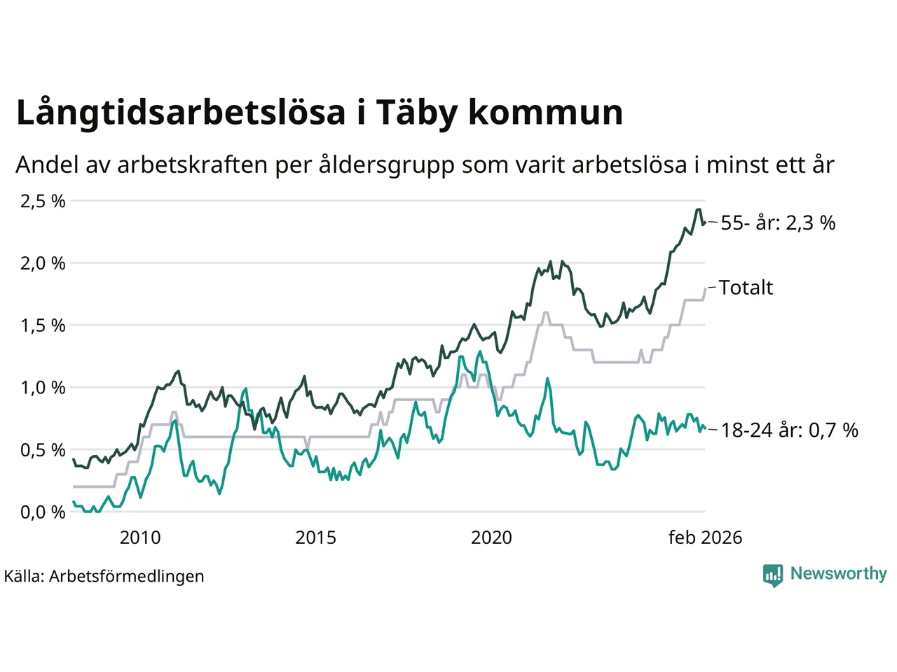 Av de 689 personerna som varit arbetslösa i mer än ett år i Täby kommun är 200 personer mellan 55 och 661 år och 25 är mellan 18 och 24 år. För den äldre gruppen är andelen arbetslösa 2,3 procent medan den i den yngre gruppen är 0,7 procent. Även i riket som helhet är långtidsarbetslösheten högre i gruppen äldre.