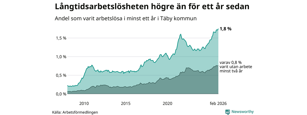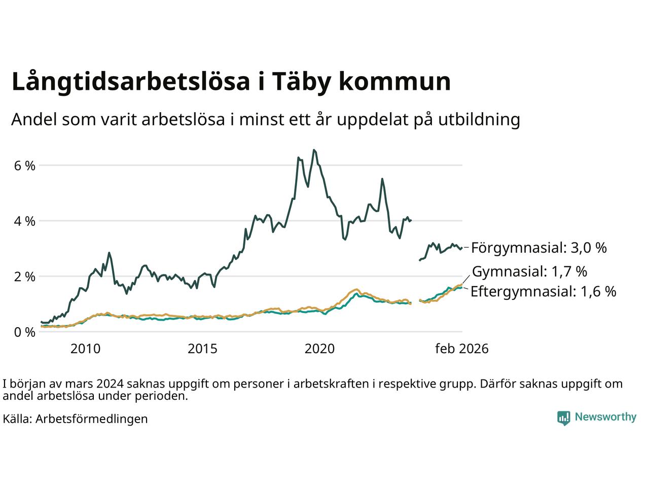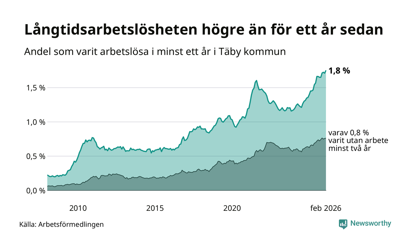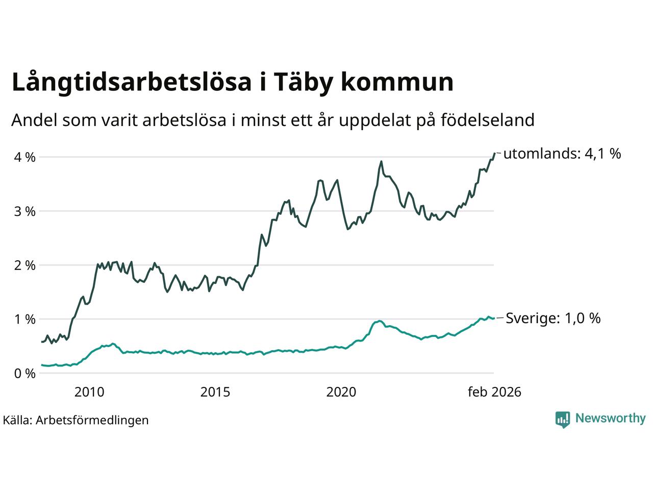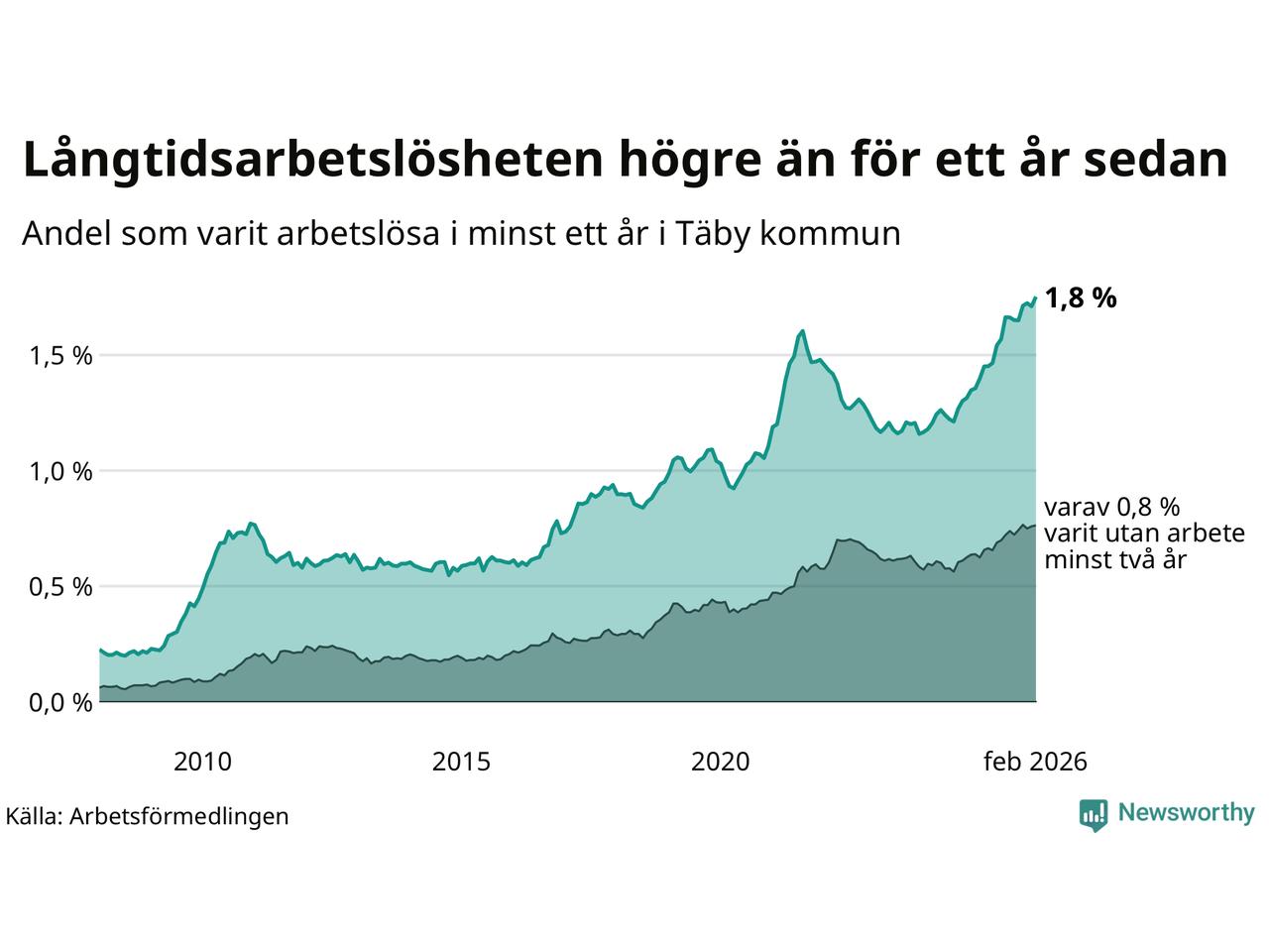 I februari hade 689 Täbybor varit arbetslösa i minst ett år, vilket är 17 fler än månaden innan. Det är den fjärde månaden i rad med ökande antal långtidsarbetslösa. 689 personer motsvarar 1,8 procent av arbetskraften i kommunen – andelen långtidsarbetslösa är 0,3 procentenheter högre än samma månad för ett år sedan. Det är också den den högsta andelen långtidsarbetslösa under de senaste 15 åren.