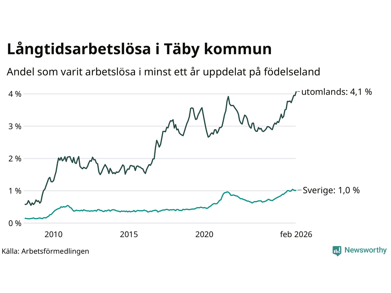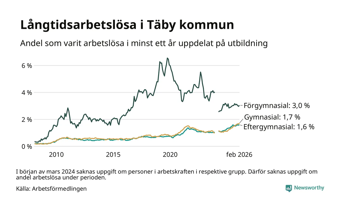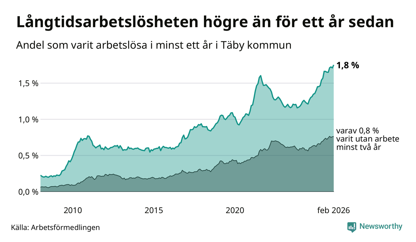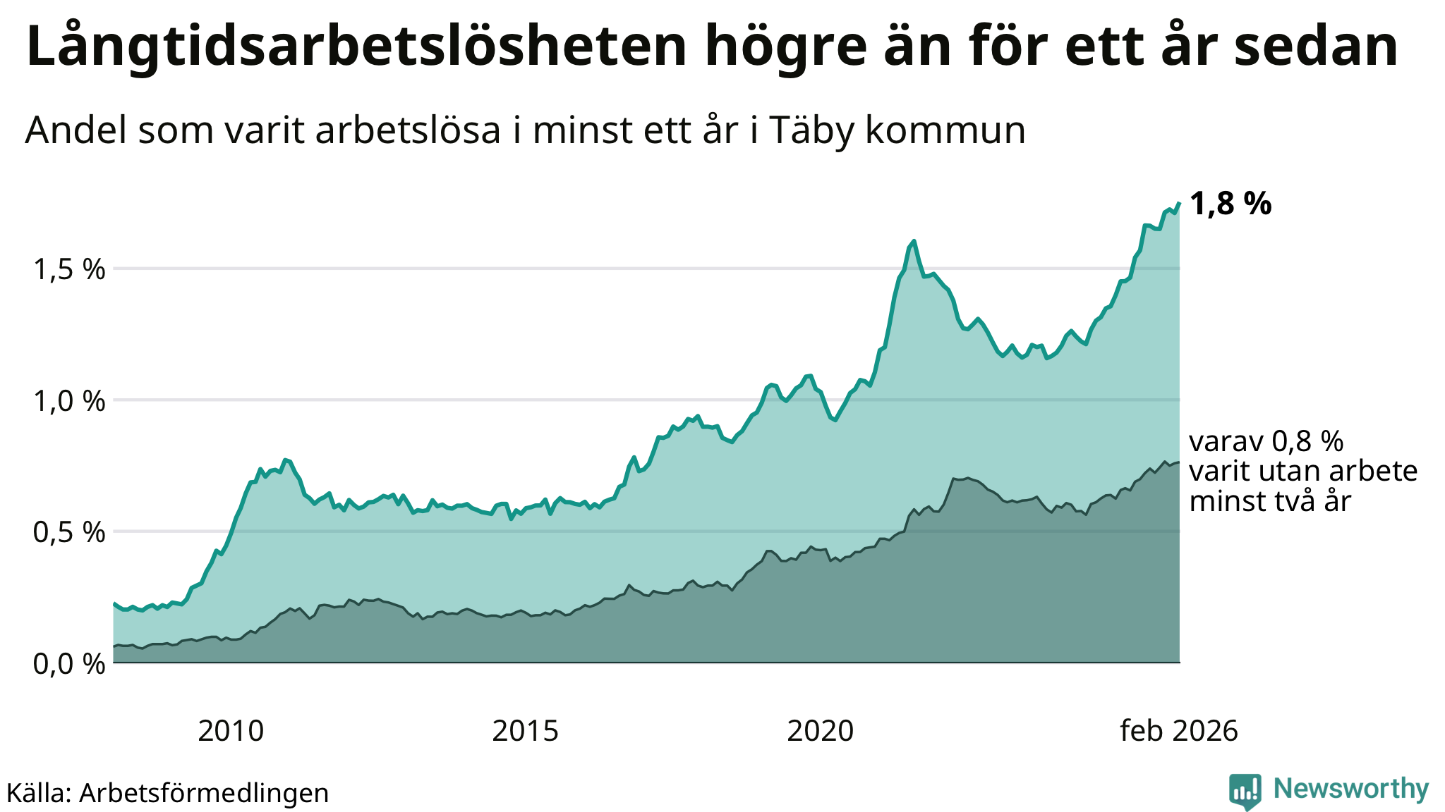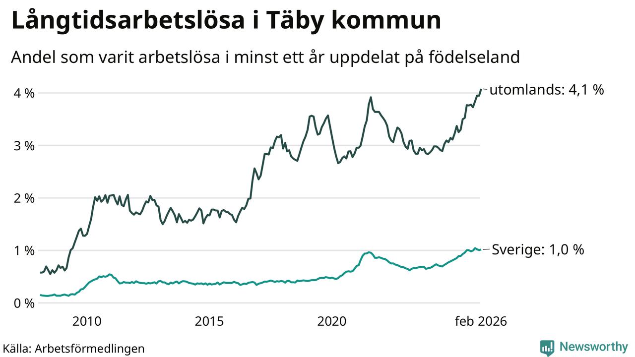 I februari hade 689 Täbybor varit arbetslösa i minst ett år, vilket är 17 fler än månaden innan. Det är den fjärde månaden i rad med ökande antal långtidsarbetslösa. 689 personer motsvarar 1,8 procent av arbetskraften i kommunen – andelen långtidsarbetslösa är 0,3 procentenheter högre än samma månad för ett år sedan. Det är också den den högsta andelen långtidsarbetslösa under de senaste 15 åren.
