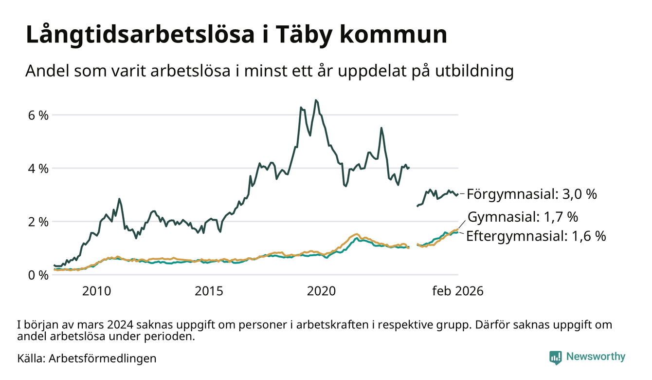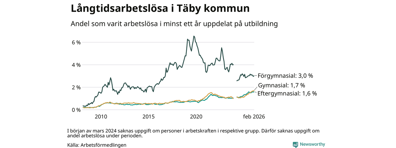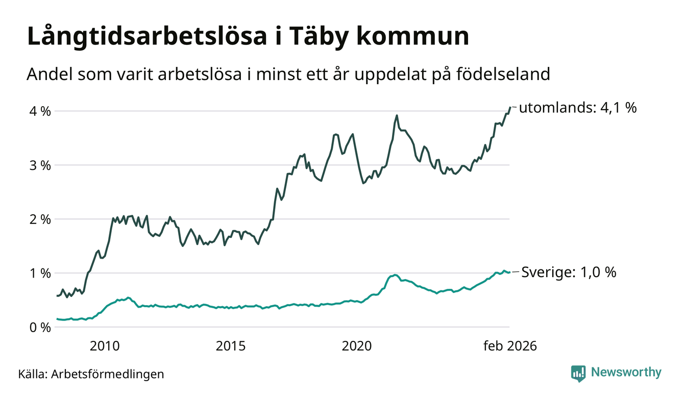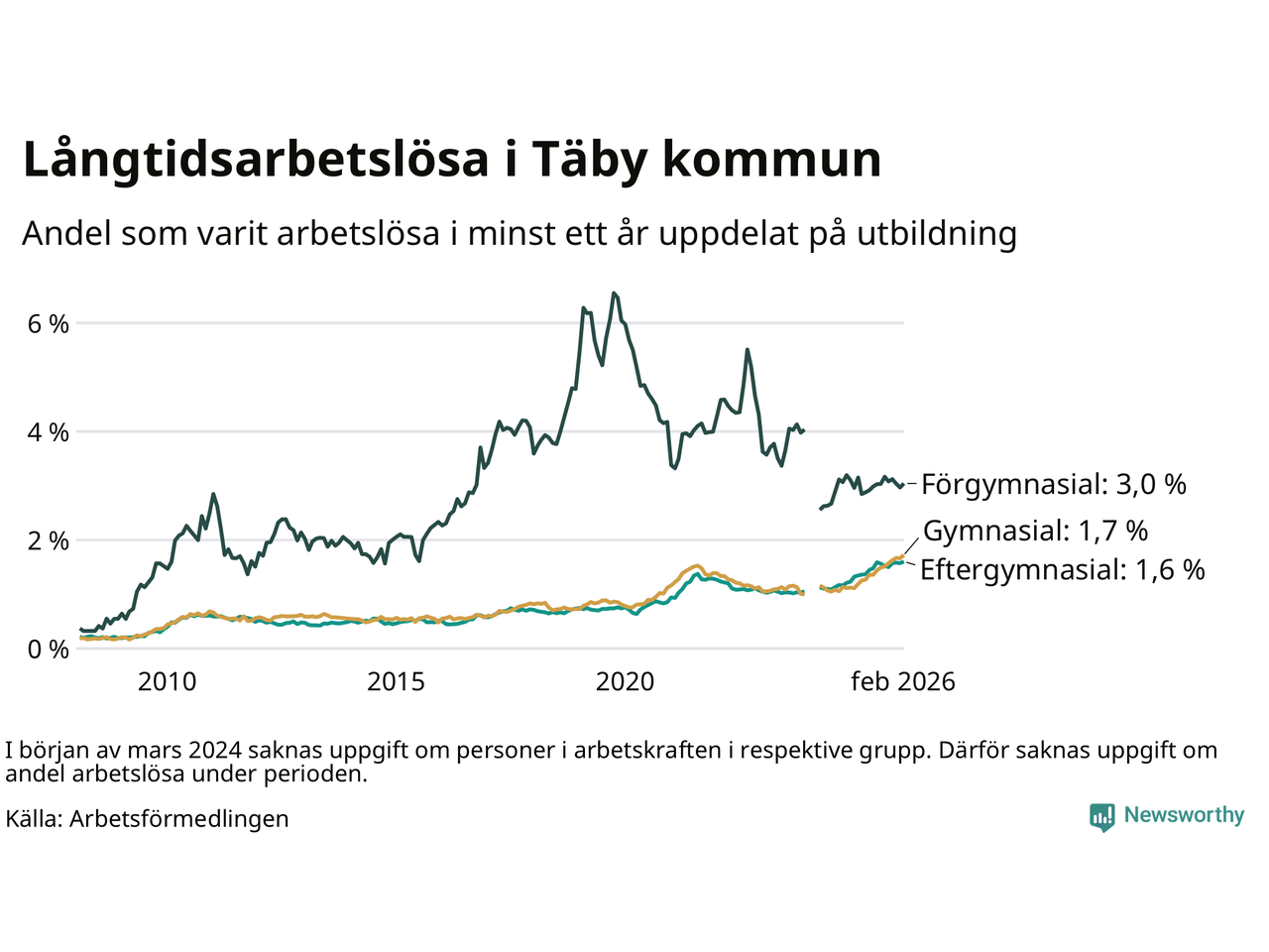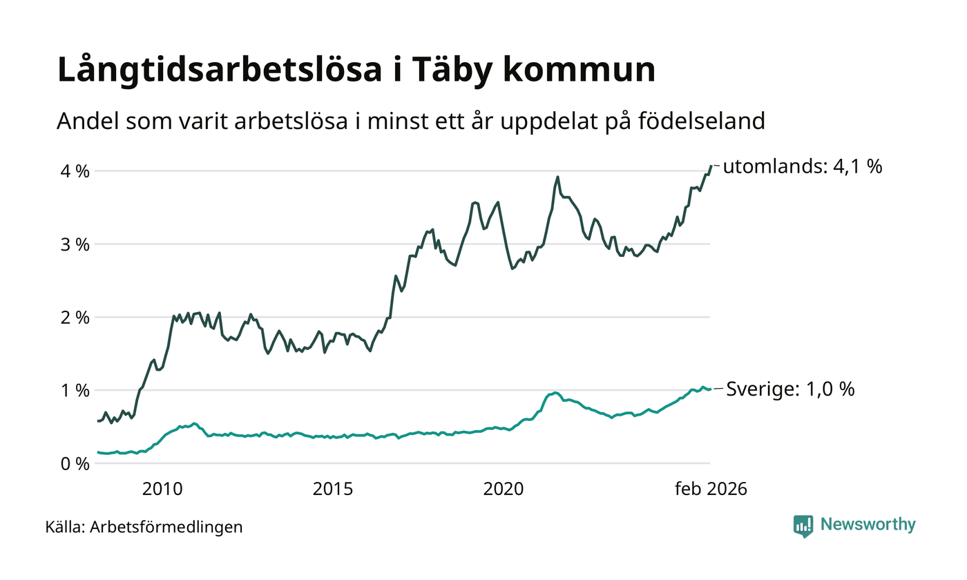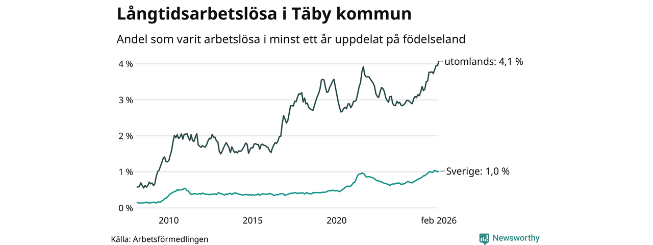 I februari hade 689 Täbybor varit arbetslösa i minst ett år, vilket är 17 fler än månaden innan. Det är den fjärde månaden i rad med ökande antal långtidsarbetslösa. 689 personer motsvarar 1,8 procent av arbetskraften i kommunen – andelen långtidsarbetslösa är 0,3 procentenheter högre än samma månad för ett år sedan. Det är också den den högsta andelen långtidsarbetslösa under de senaste 15 åren.