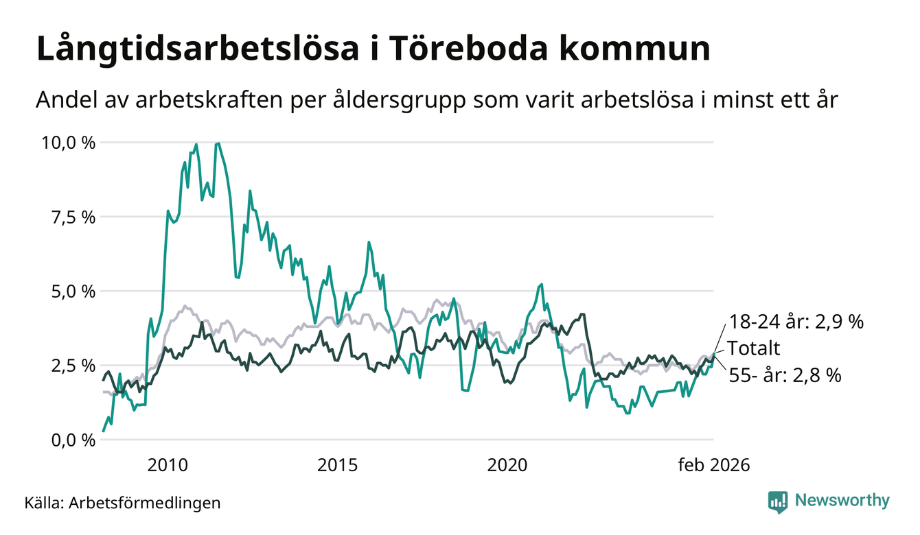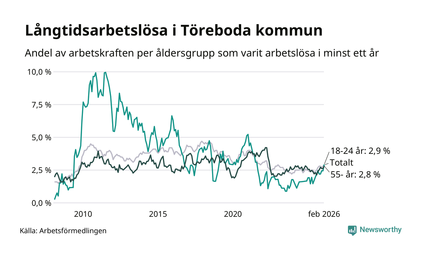 I februari hade 119 Törebodabor varit arbetslösa i minst ett år, vilket är tre fler än månaden innan. 119 personer motsvarar 2,9 procent av arbetskraften i kommunen – andelen långtidsarbetslösa är 0,5 procentenheter högre än samma månad för ett år sedan.