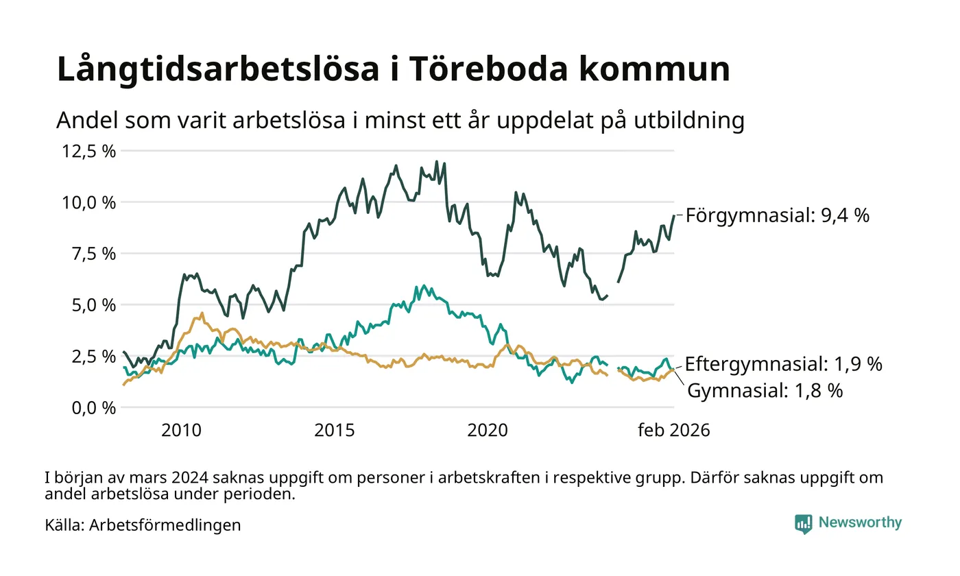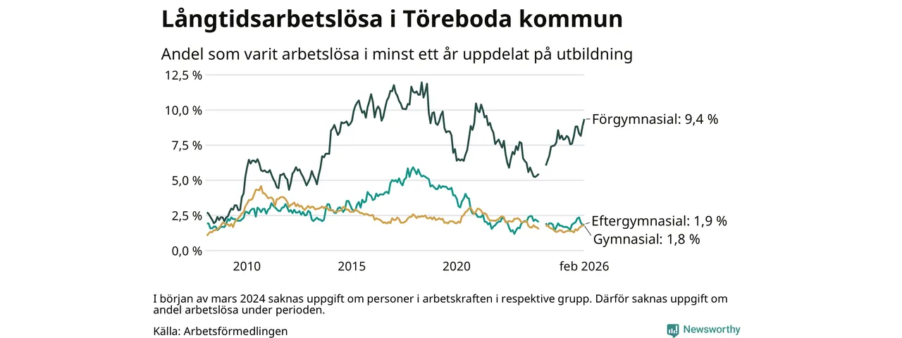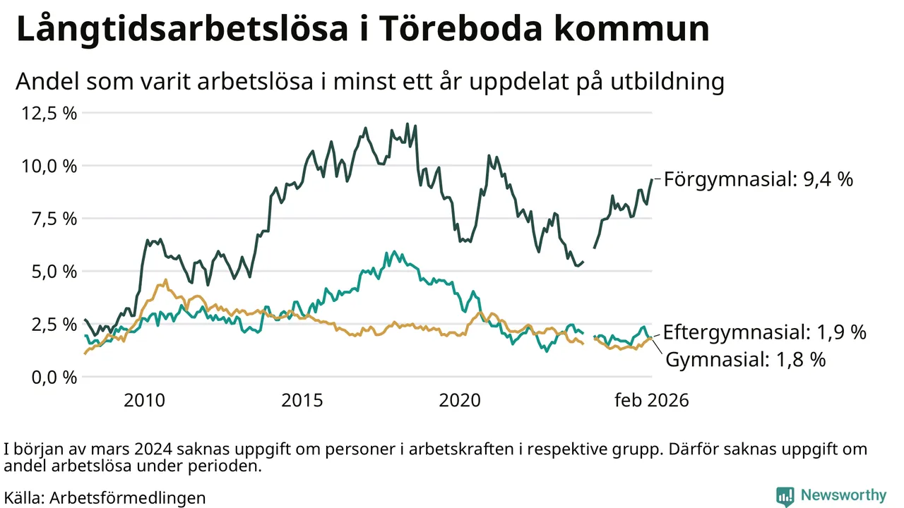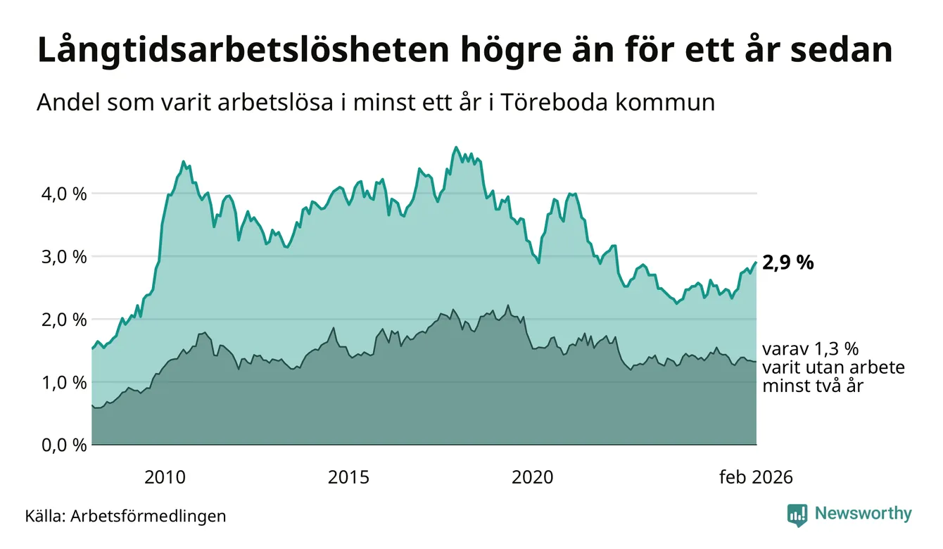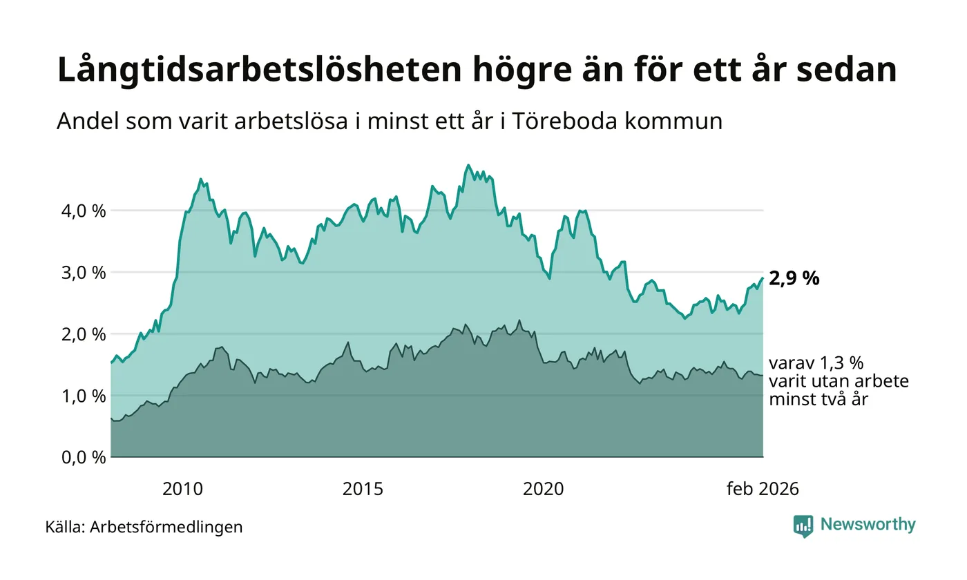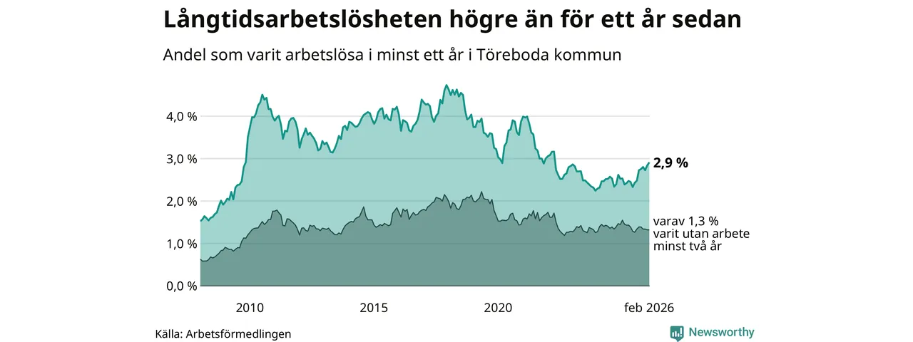 Inte sedan april 2022 har andelen långtidsarbetslösa varit så hög i Töreboda. Det visar Arbetsförmedlingens senaste månadsstatistik.