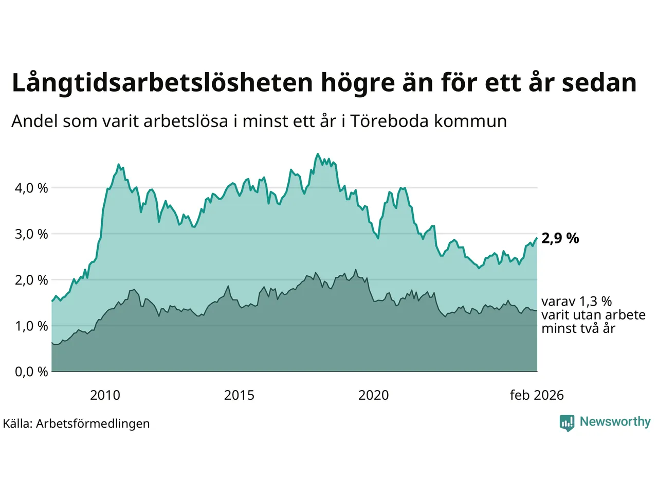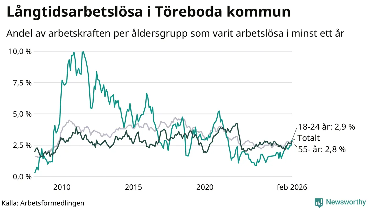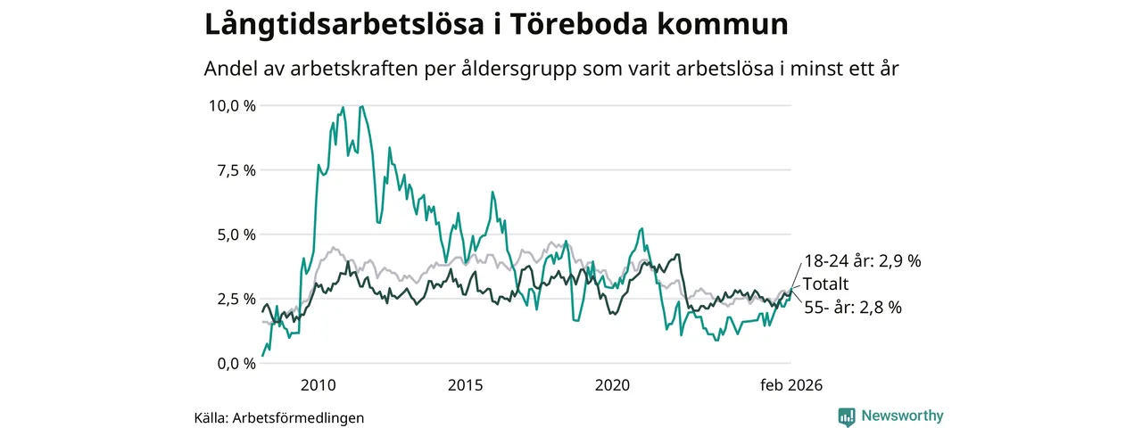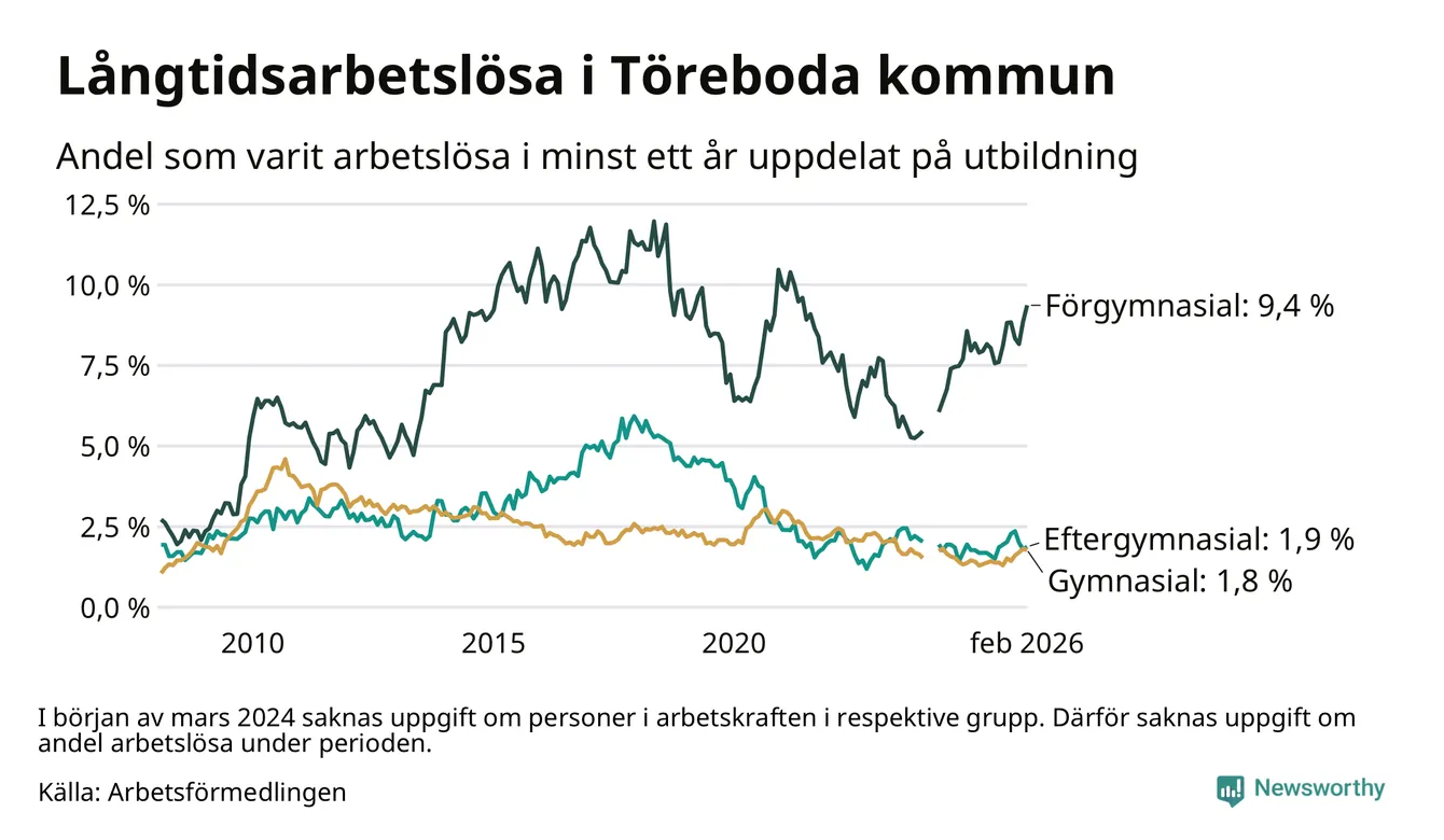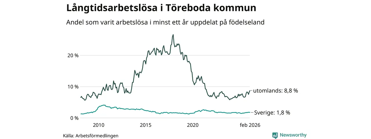 Inte sedan april 2022 har andelen långtidsarbetslösa varit så hög i Töreboda. Det visar Arbetsförmedlingens senaste månadsstatistik.