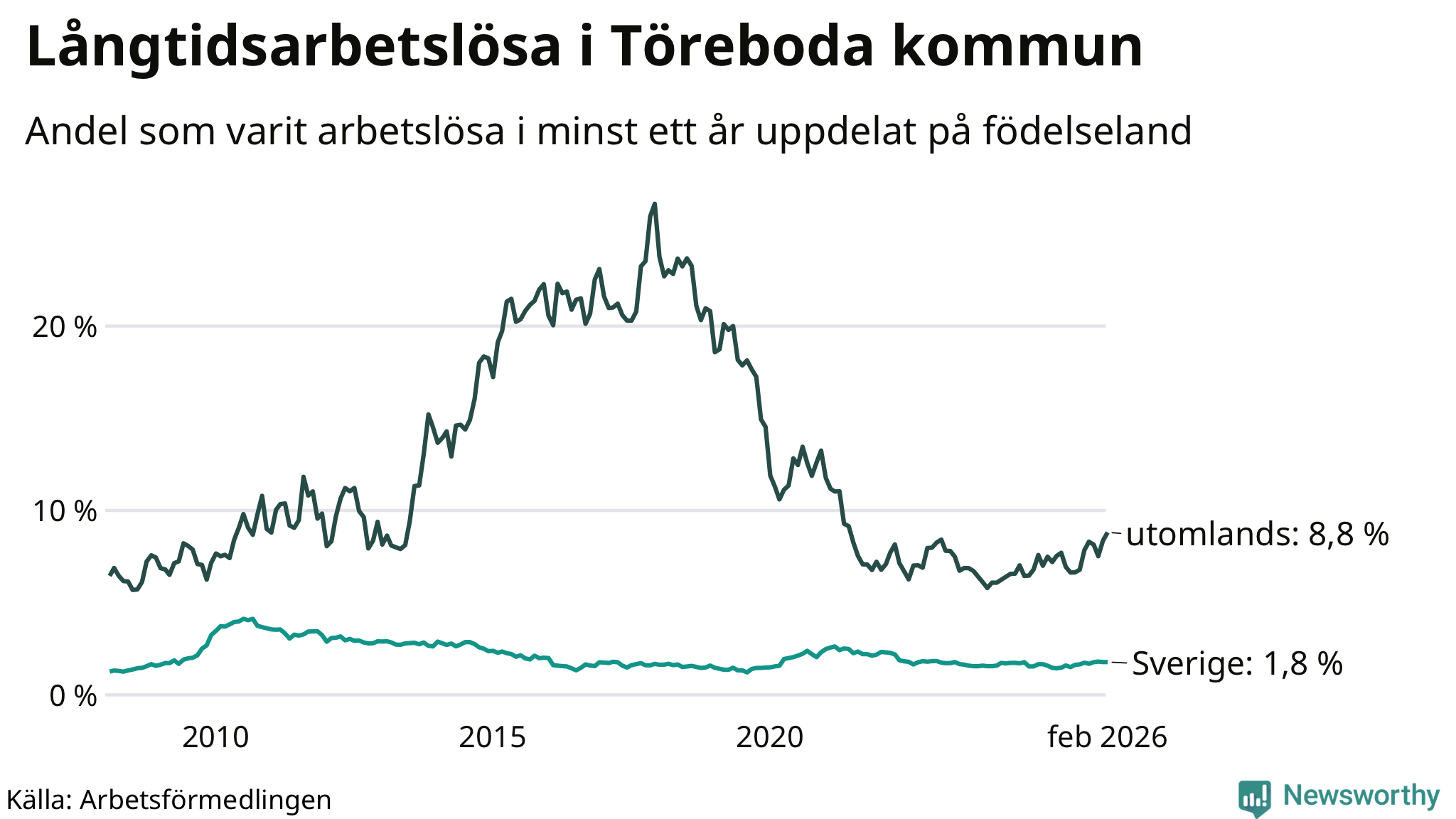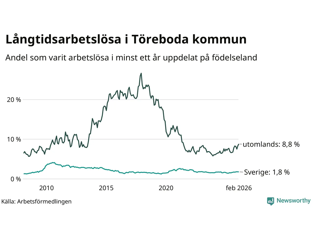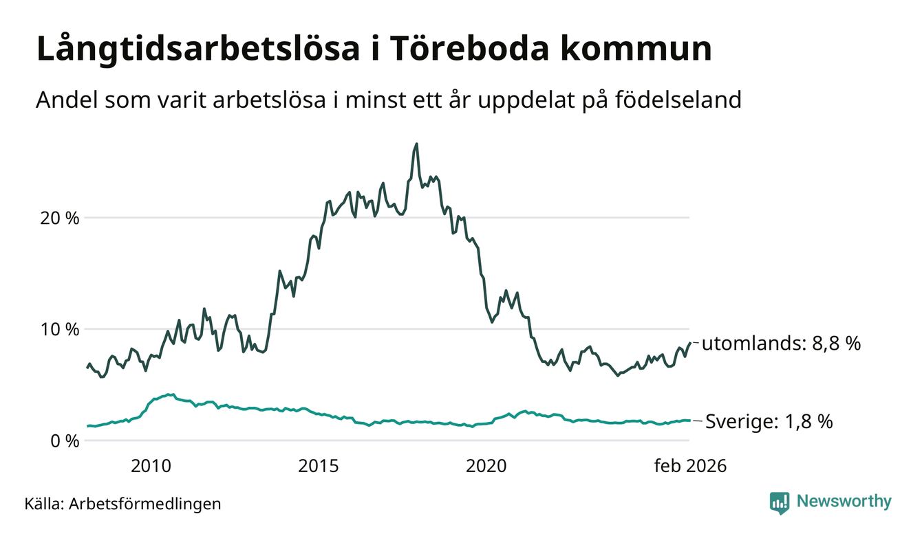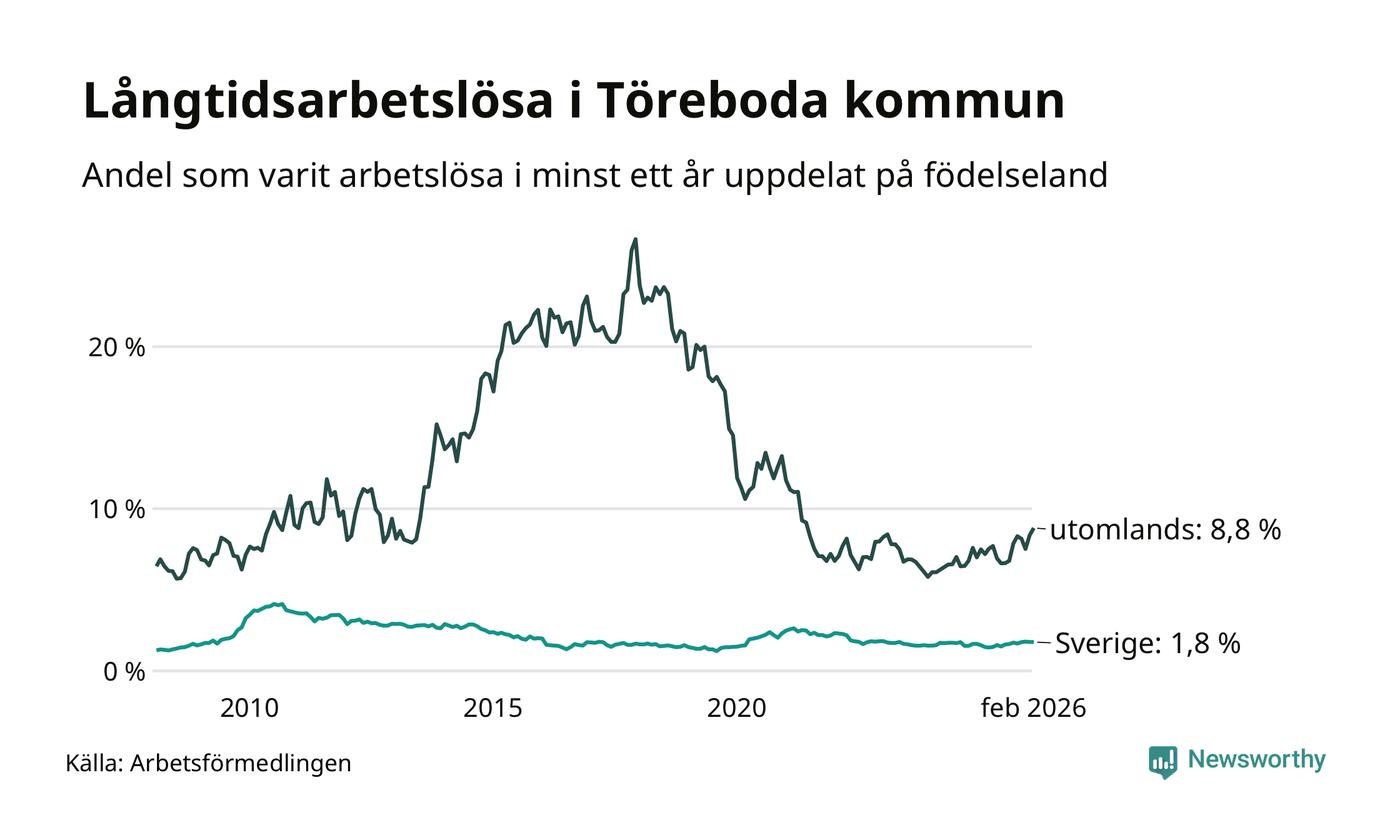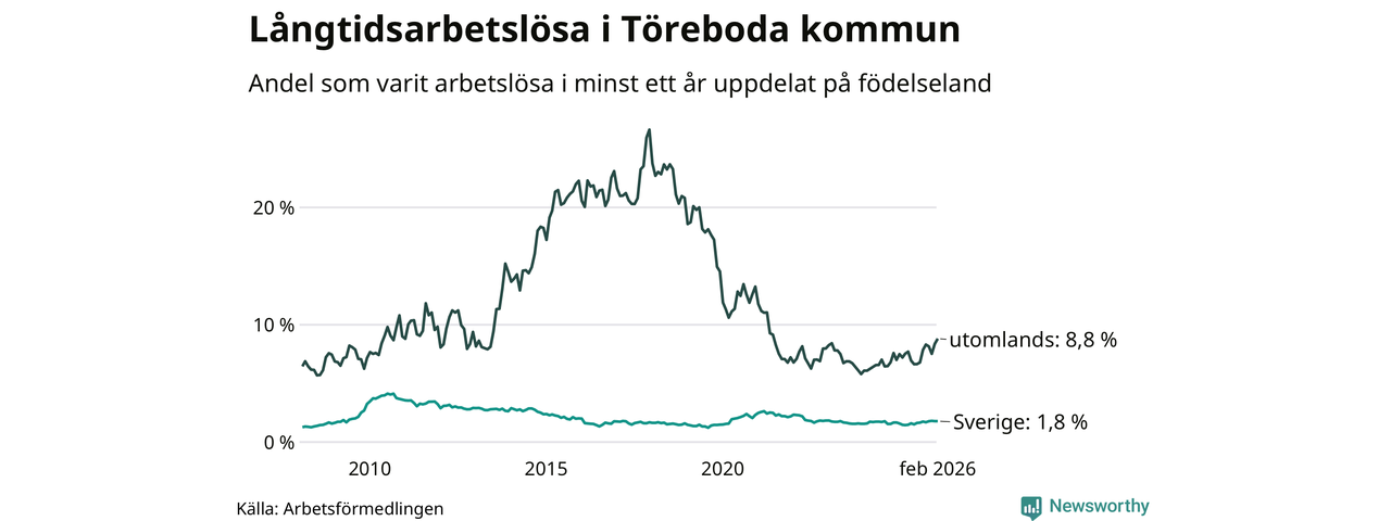 61 av de långtidsarbetslösa i Töreboda är födda i Sverige, medan 58 är födda utomlands. Det innebär att långtidsarbetslösheten bland Sverigefödda är 1,8 procent, medan den är fem gånger så hög – 8,8 procent – bland födda utomlands. Även i riket som helhet är arbetslösheten högre bland utrikesfödda.
