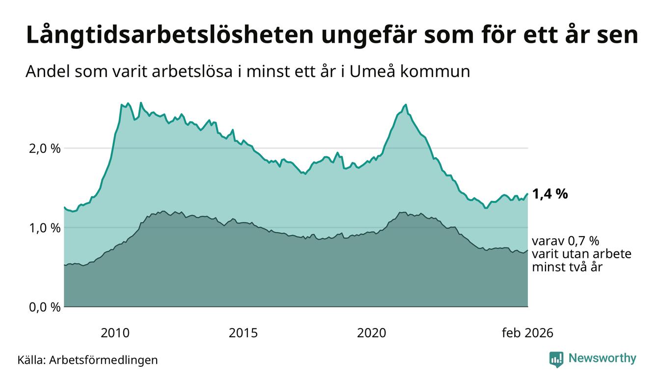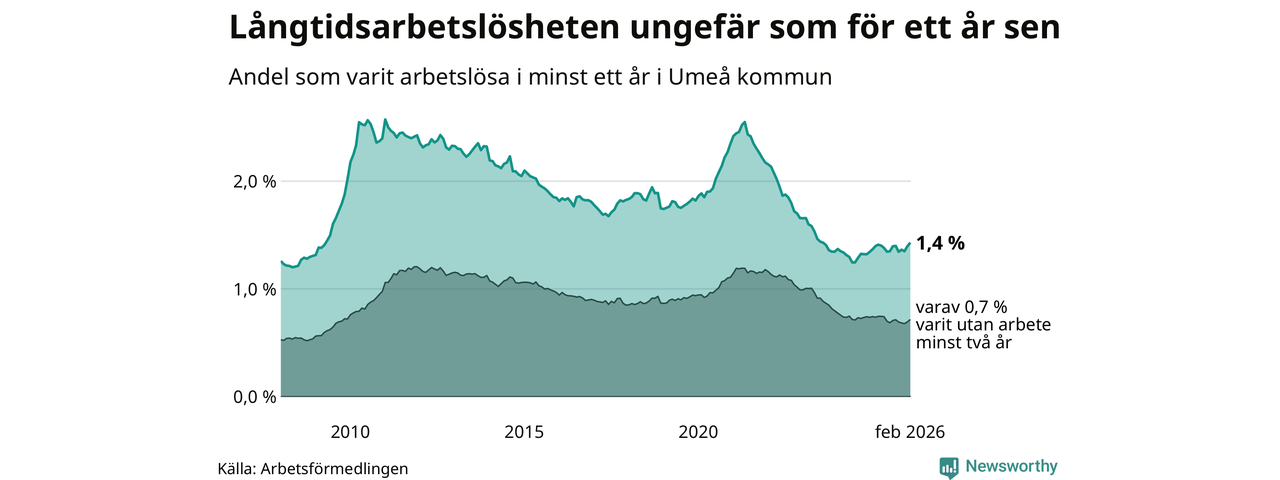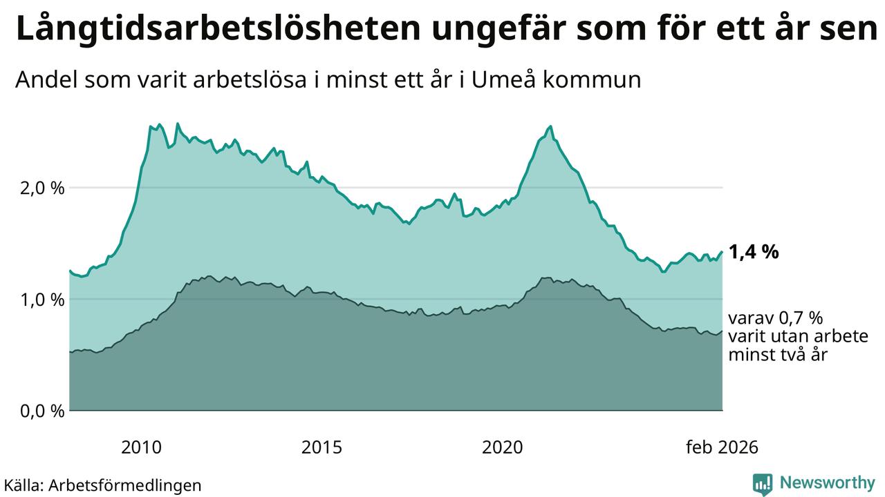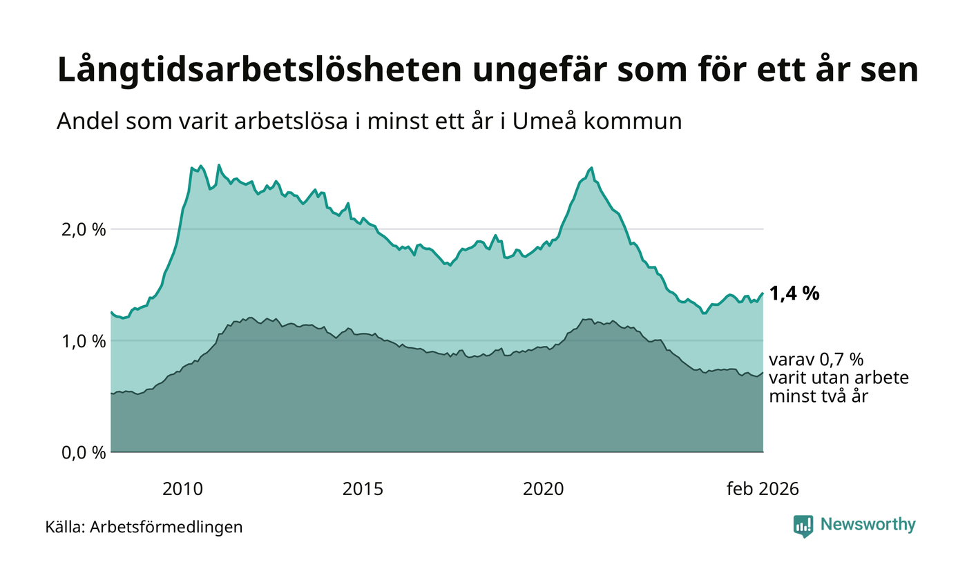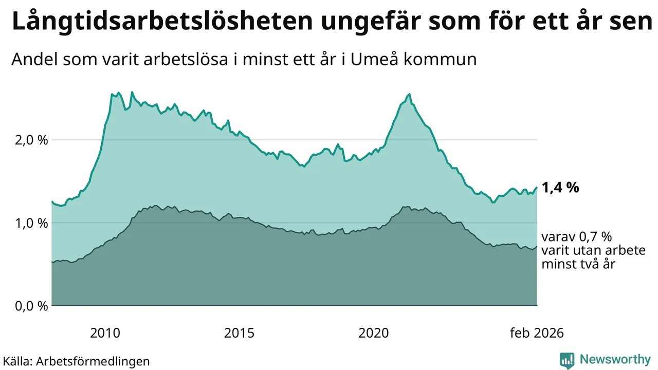 I februari hade 1 009 Umeåbor varit arbetslösa i minst ett år, vilket är 24 fler än månaden innan. 1 009 personer motsvarar 1,4 procent av arbetskraften i kommunen – andelen långtidsarbetslösa är ungefär på samma nivå som för ett år sedan.