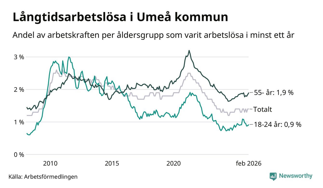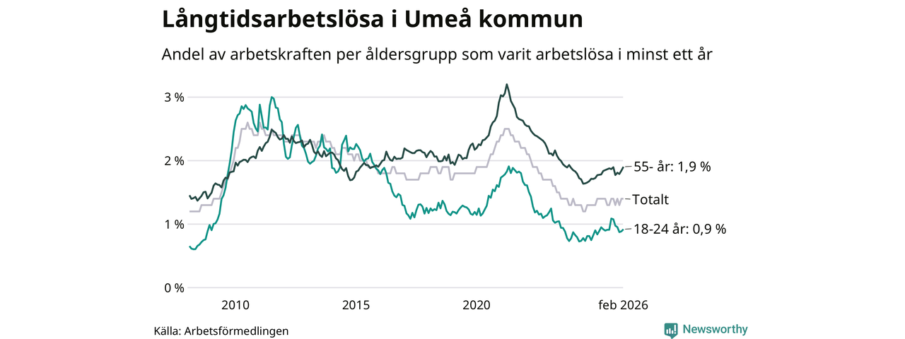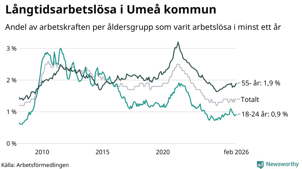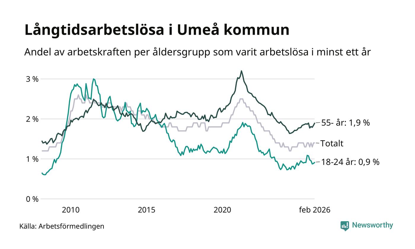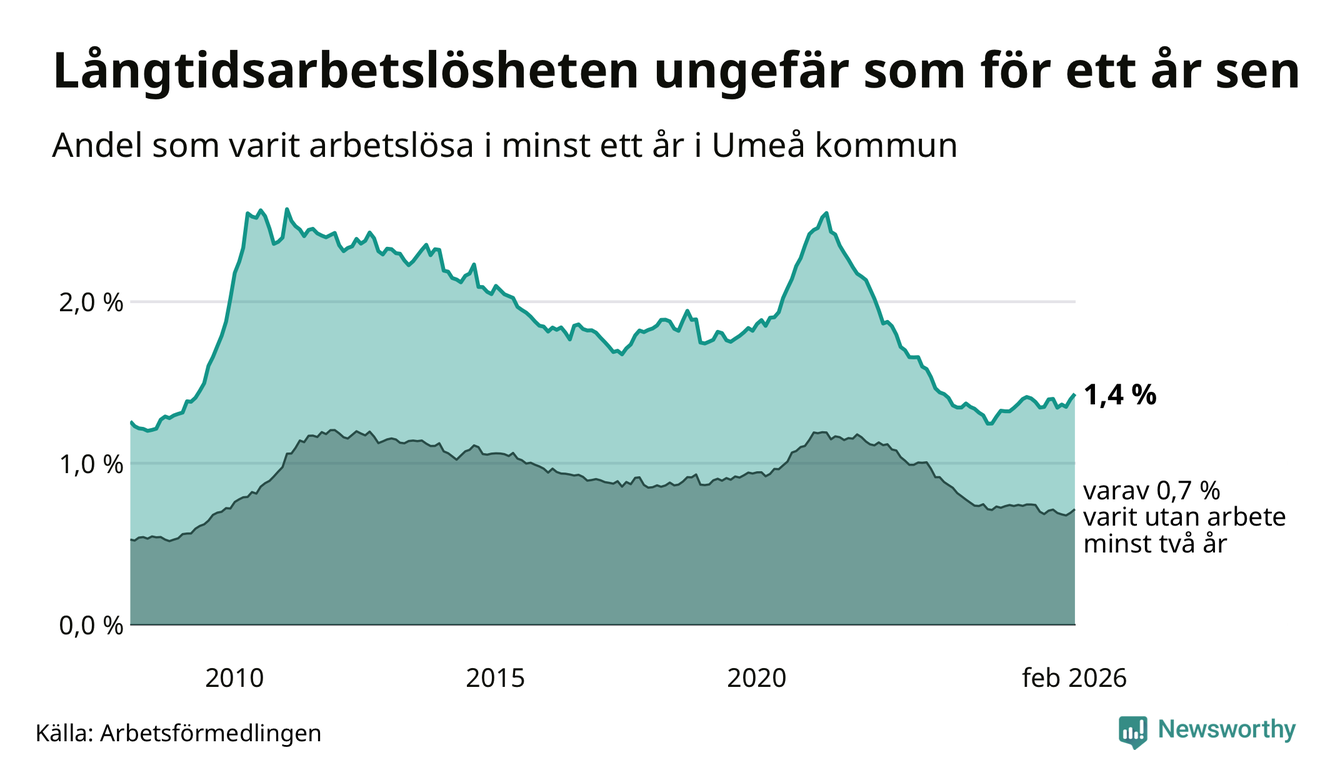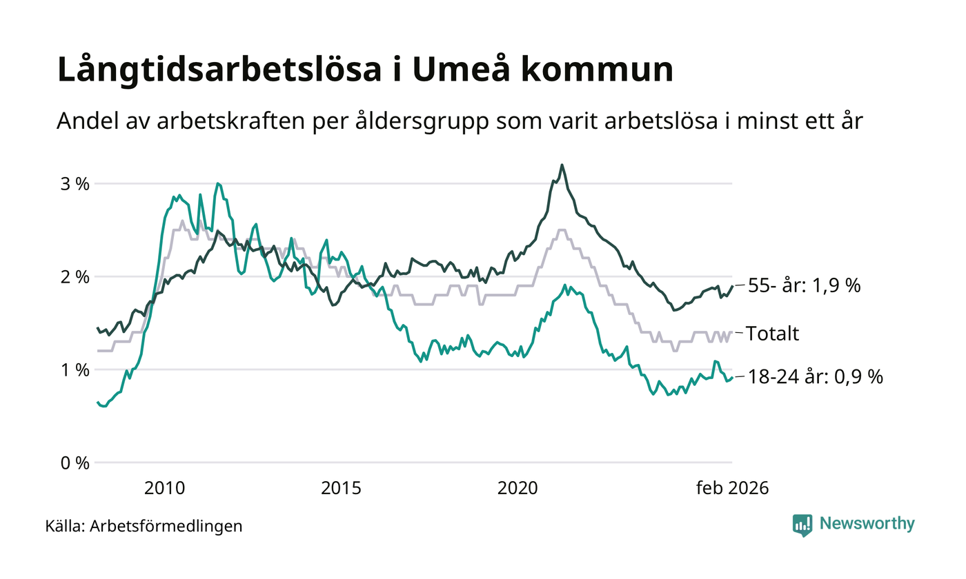 I februari hade 1 009 Umeåbor varit arbetslösa i minst ett år, vilket är 24 fler än månaden innan. 1 009 personer motsvarar 1,4 procent av arbetskraften i kommunen – andelen långtidsarbetslösa är ungefär på samma nivå som för ett år sedan.