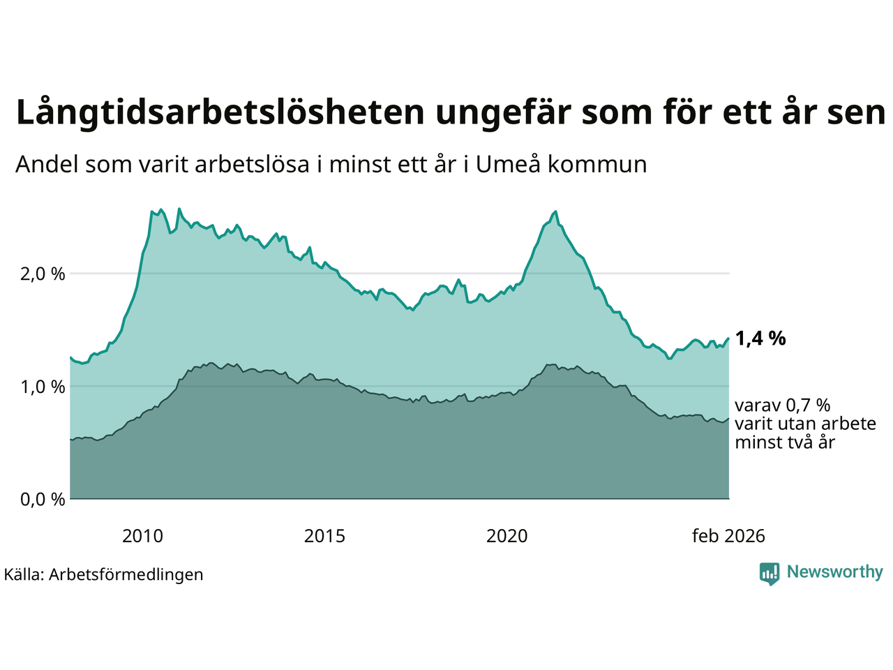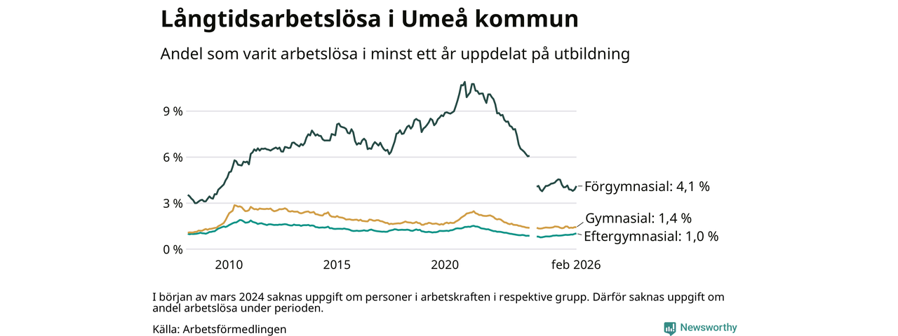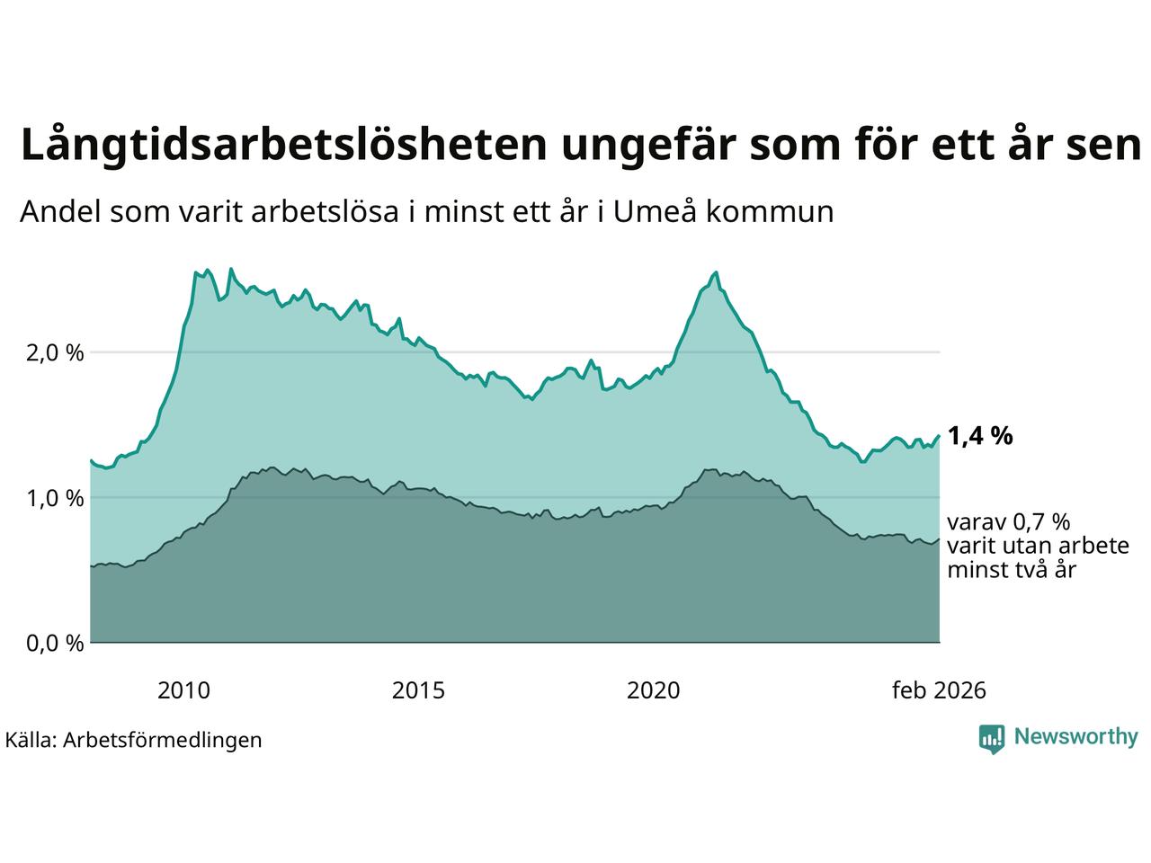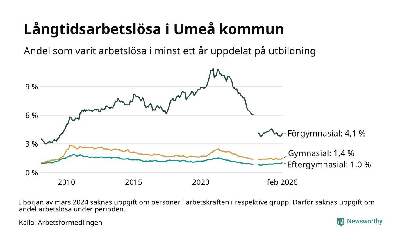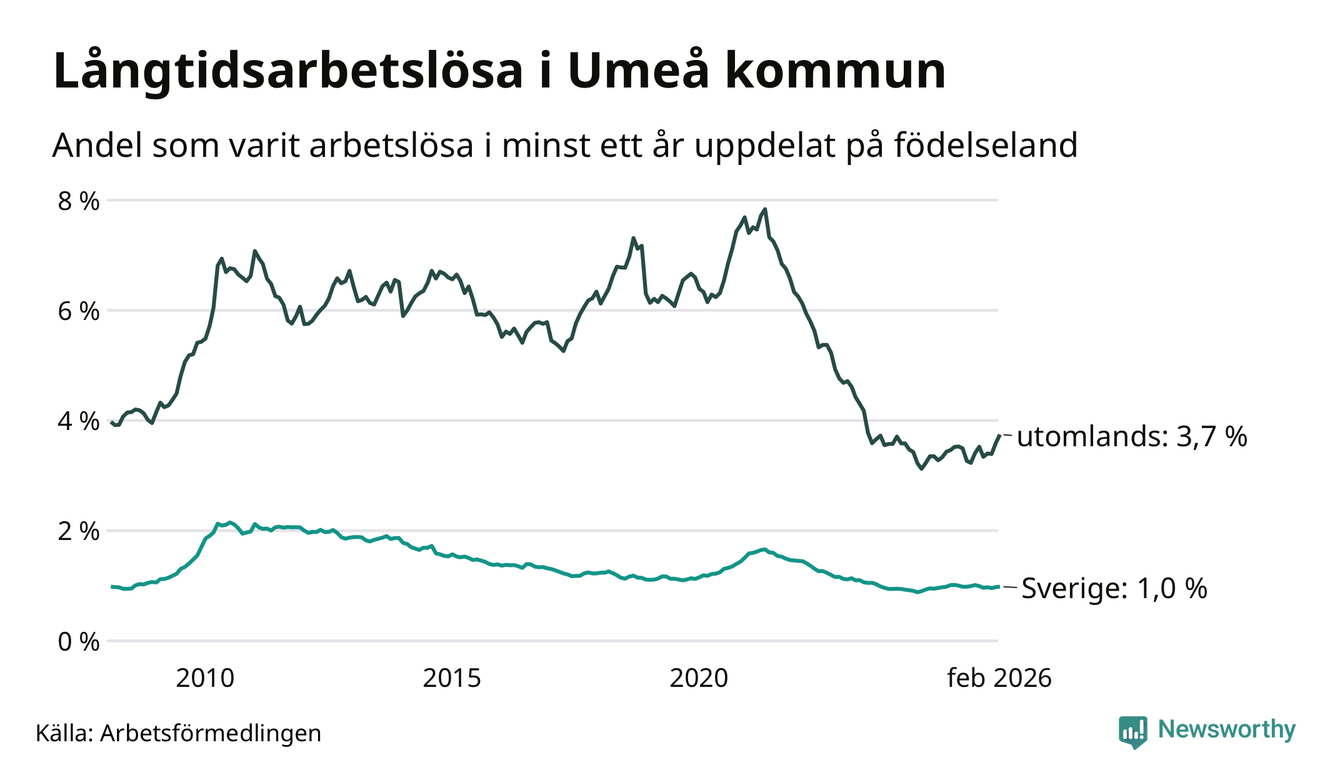 I februari hade 1 009 Umeåbor varit arbetslösa i minst ett år, vilket är 24 fler än månaden innan. 1 009 personer motsvarar 1,4 procent av arbetskraften i kommunen – andelen långtidsarbetslösa är ungefär på samma nivå som för ett år sedan.