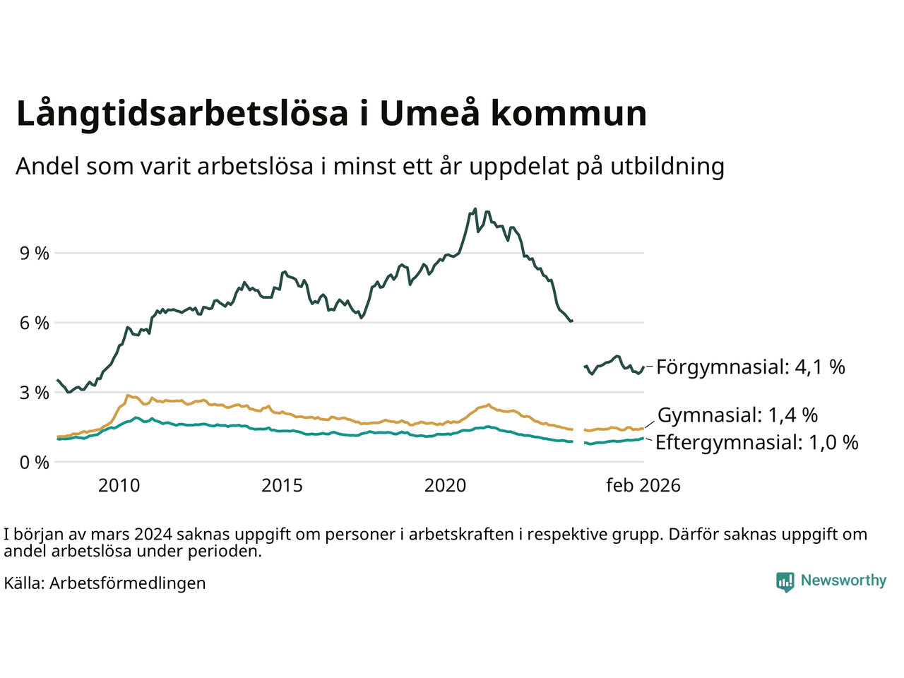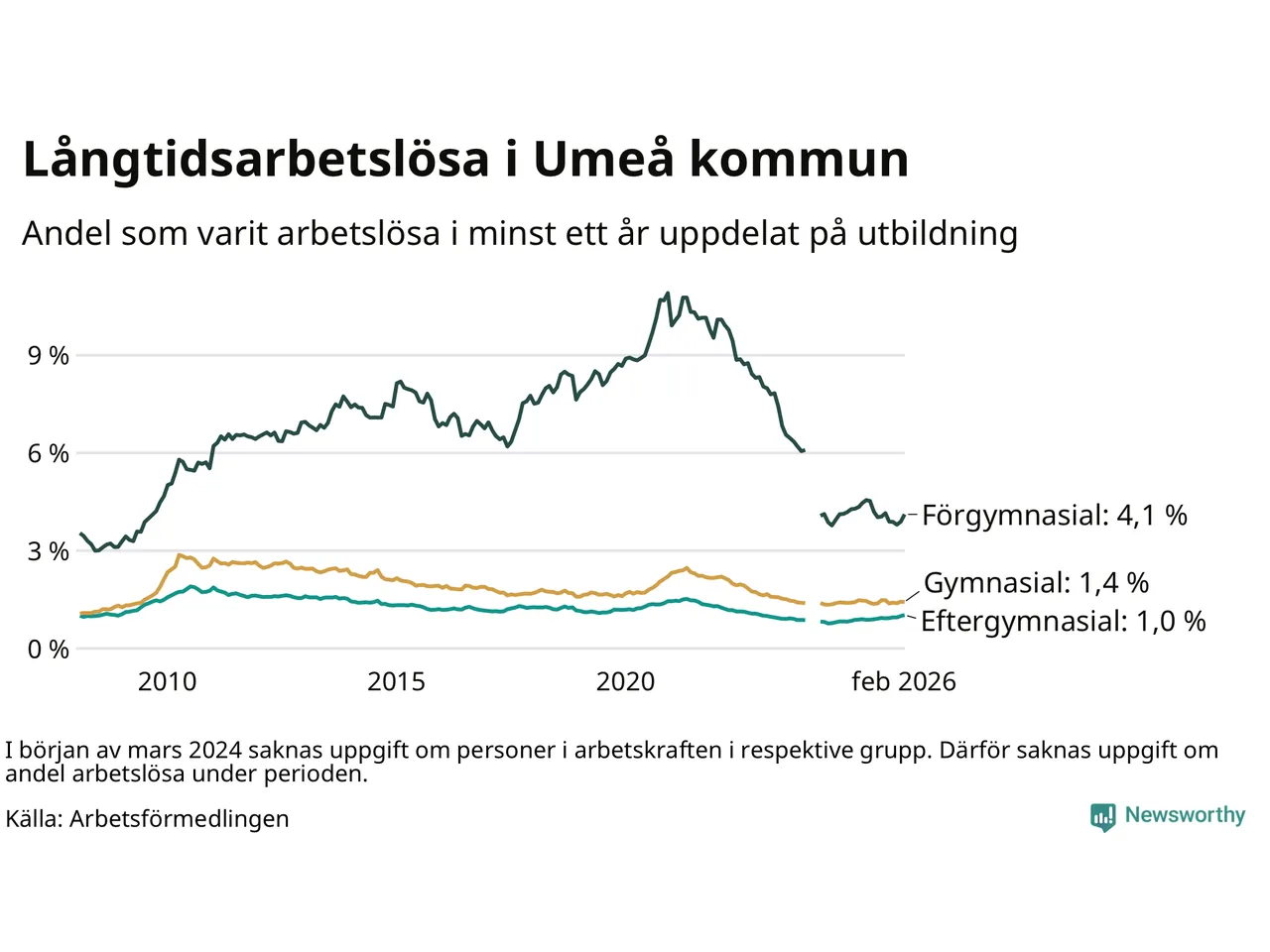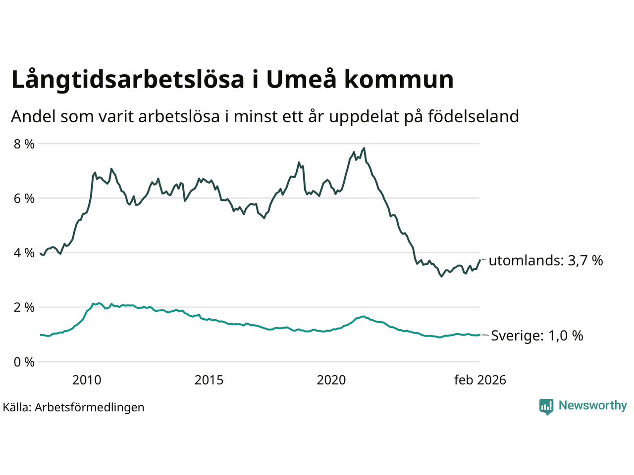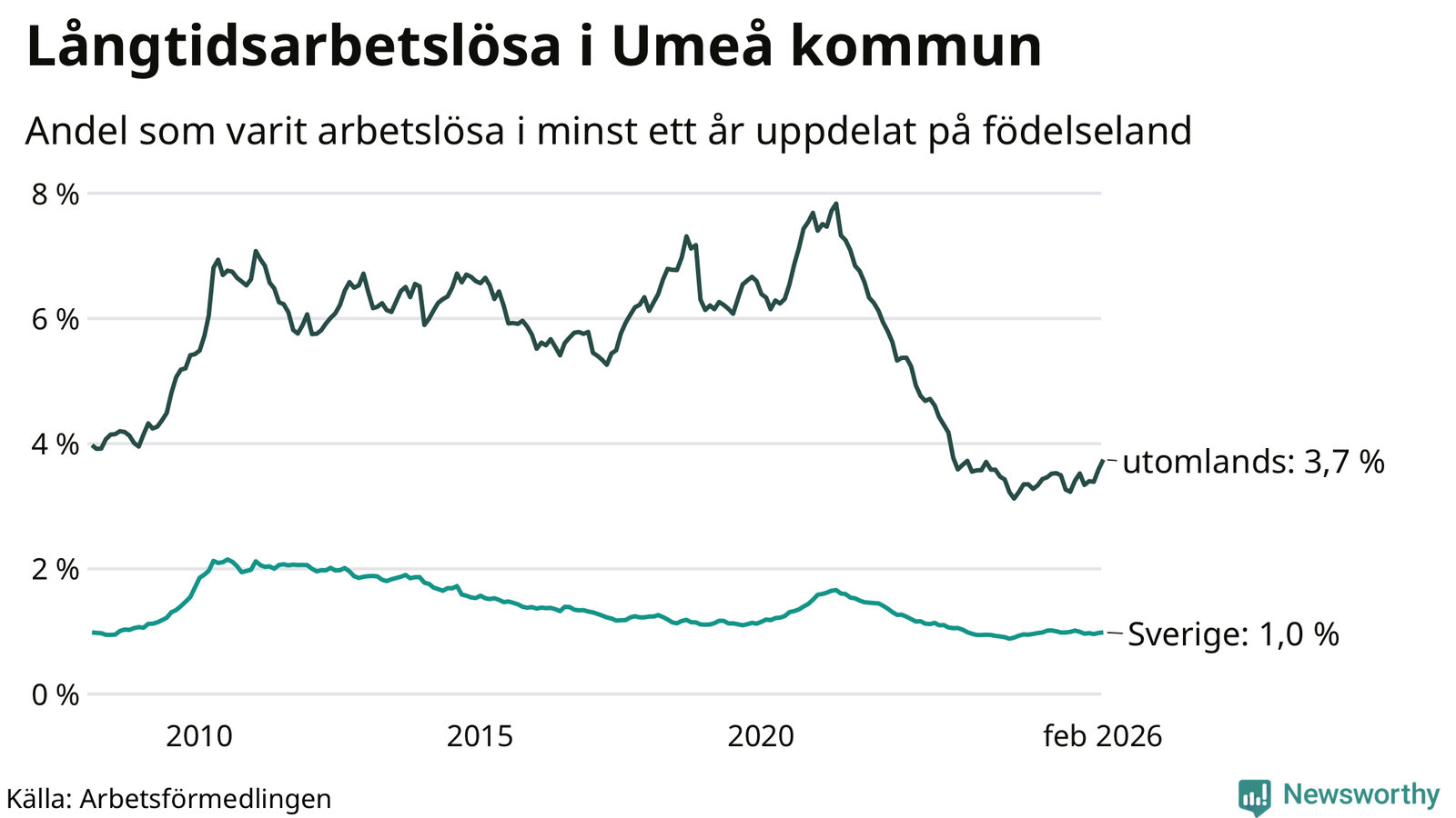 I februari hade 1 009 Umeåbor varit arbetslösa i minst ett år, vilket är 24 fler än månaden innan. 1 009 personer motsvarar 1,4 procent av arbetskraften i kommunen – andelen långtidsarbetslösa är ungefär på samma nivå som för ett år sedan.