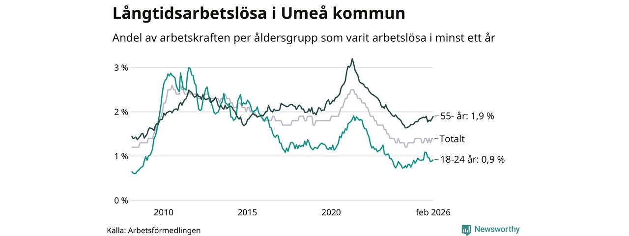 Av de 1 009 personerna som varit arbetslösa i mer än ett år i Umeå kommun är 240 personer mellan 55 och 661 år och 84 är mellan 18 och 24 år. För den äldre gruppen är andelen arbetslösa 1,9 procent medan den i den yngre gruppen är 0,9 procent. Även i riket som helhet är långtidsarbetslösheten högre i gruppen äldre.