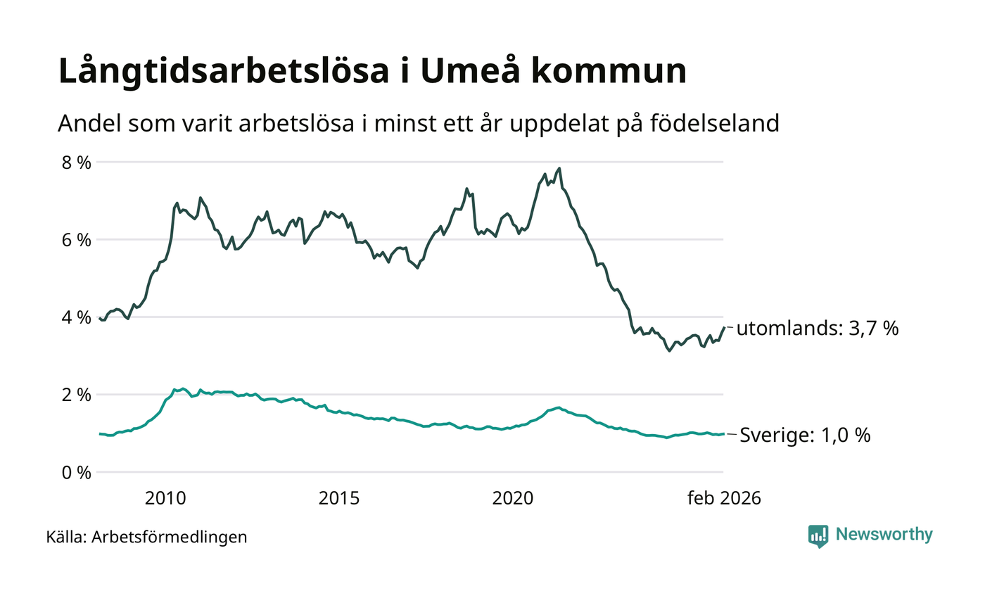 583 av de långtidsarbetslösa i Umeå är födda i Sverige, medan 426 är födda utomlands. Det innebär att långtidsarbetslösheten bland Sverigefödda är 1,0 procent, medan den är fyra gånger så hög – 3,7 procent – bland födda utomlands. Även i riket som helhet är arbetslösheten högre bland utrikesfödda.