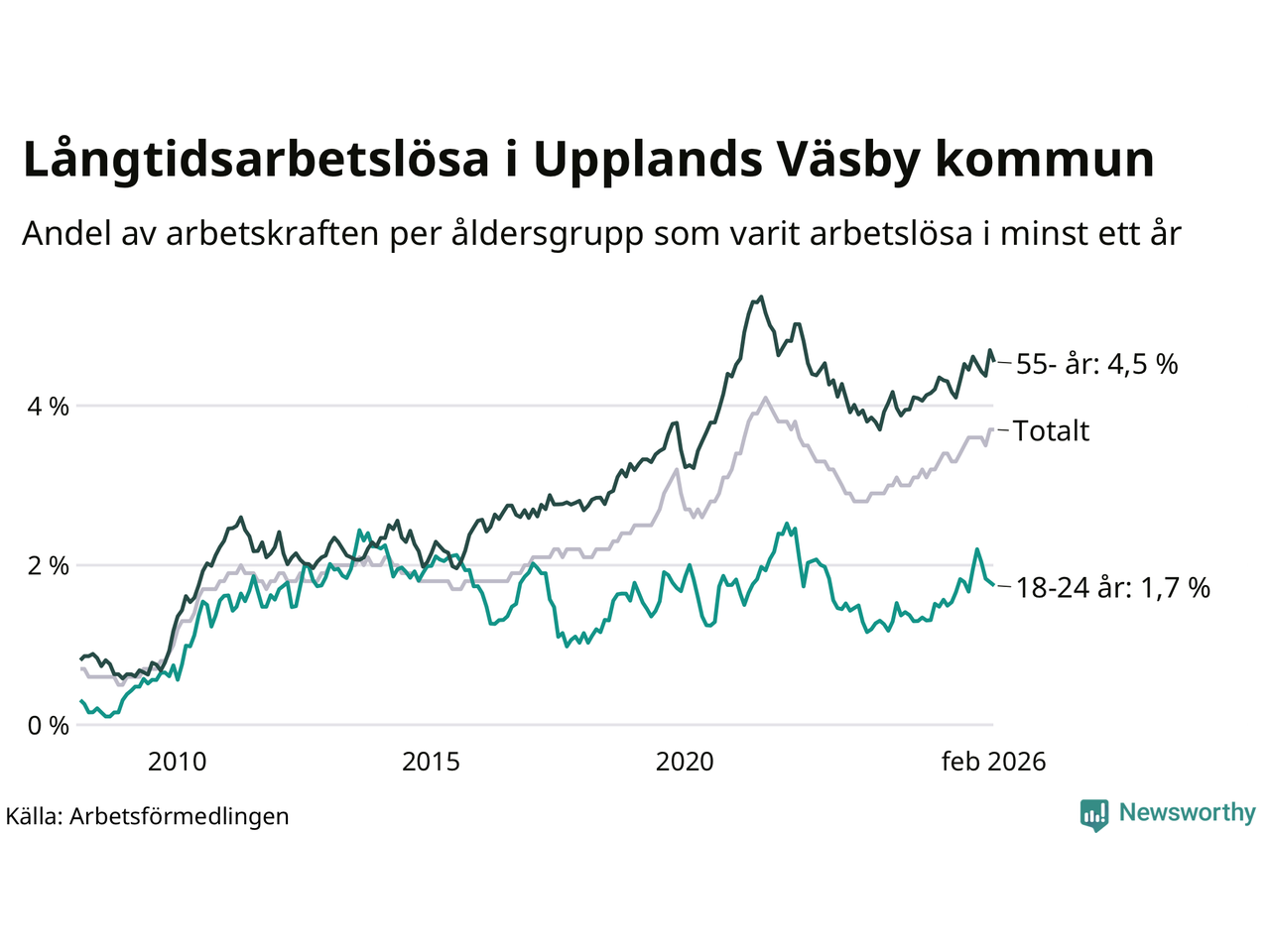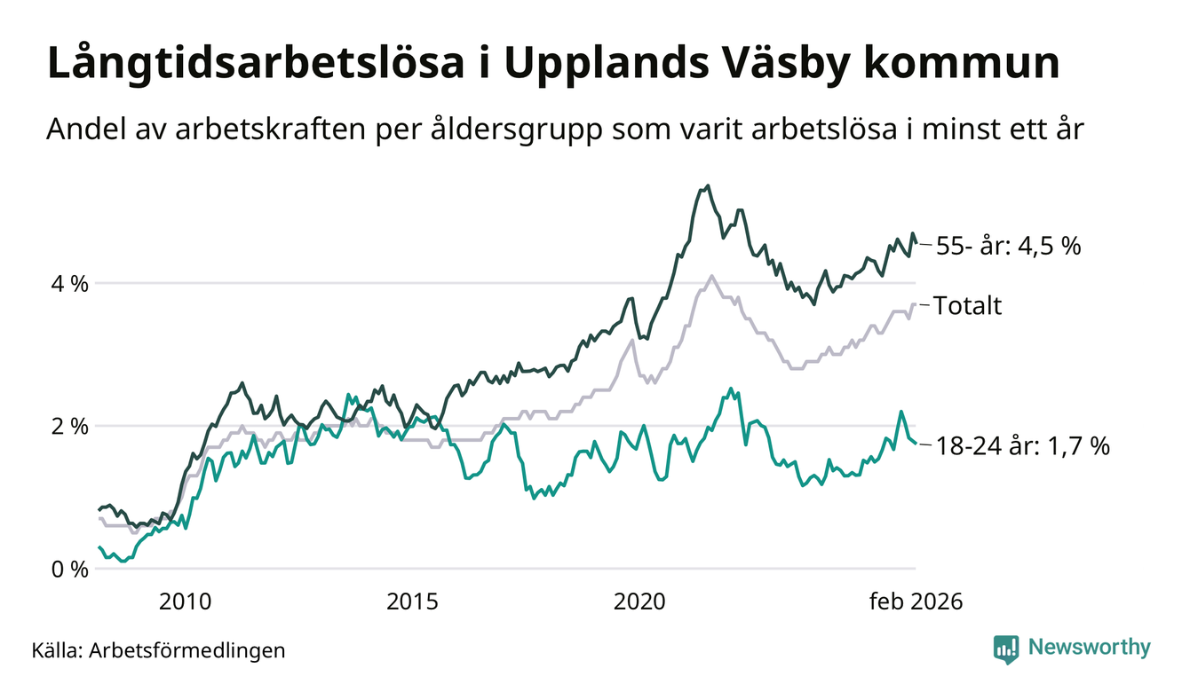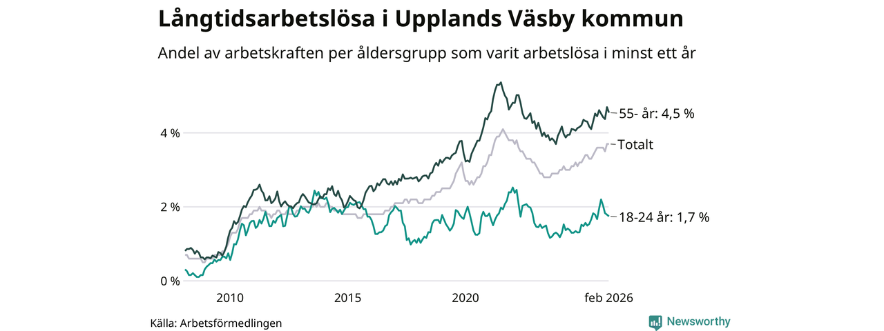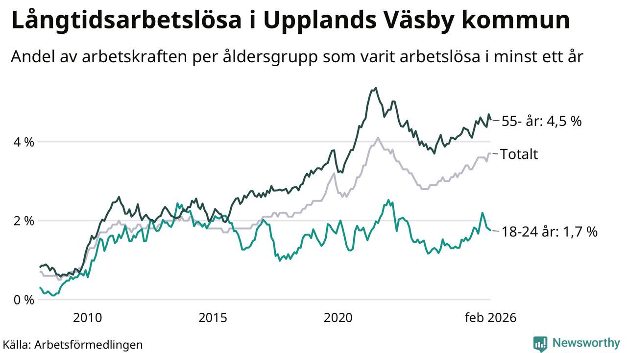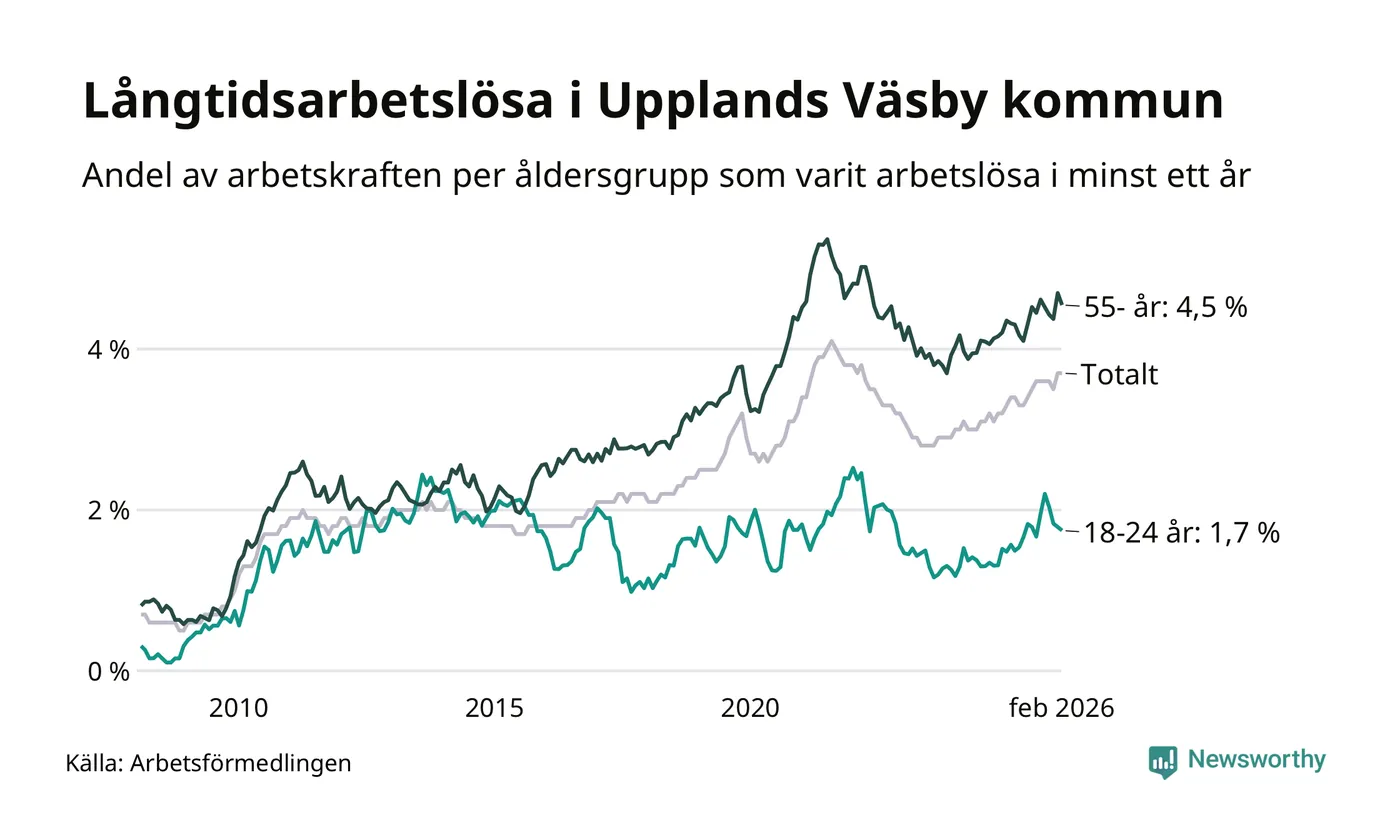 Av de 984 personerna som varit arbetslösa i mer än ett år i Upplands Väsby kommun är 232 personer mellan 55 och 661 år och 43 är mellan 18 och 24 år. För den äldre gruppen är andelen arbetslösa 4,5 procent medan den i den yngre gruppen är 1,7 procent. Även i riket som helhet är långtidsarbetslösheten högre i gruppen äldre.