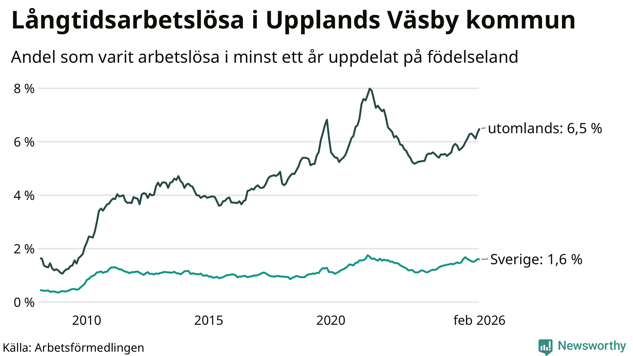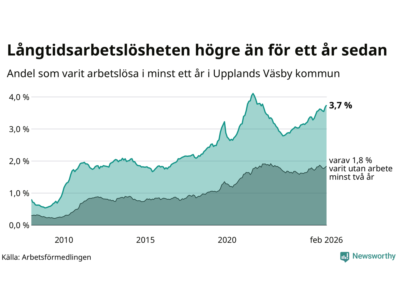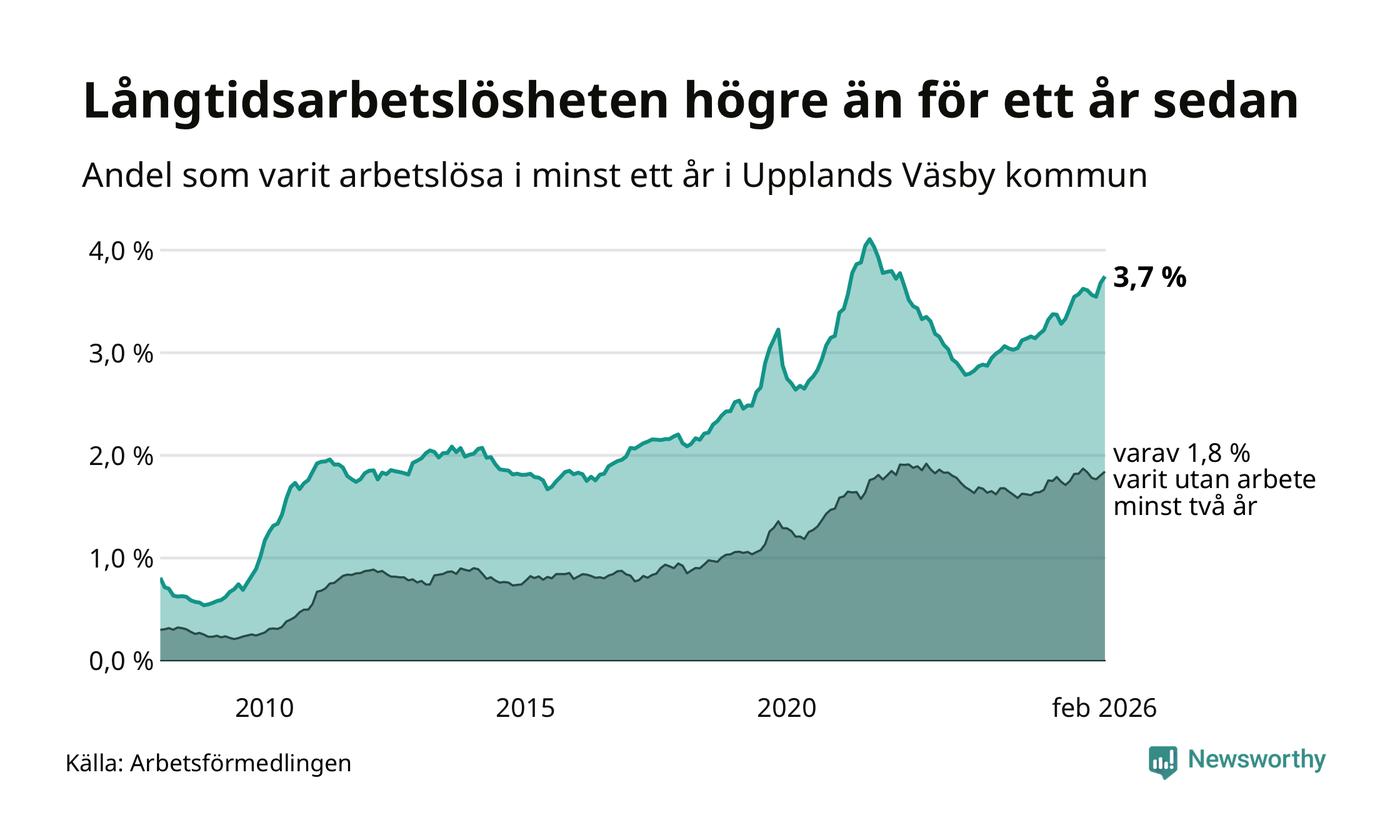 I februari hade 984 Väsbybor varit arbetslösa i minst ett år, vilket är 18 fler än månaden innan. 984 personer motsvarar 3,7 procent av arbetskraften i kommunen – andelen långtidsarbetslösa är 0,3 procentenheter högre än samma månad för ett år sedan.