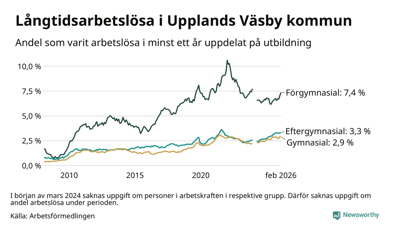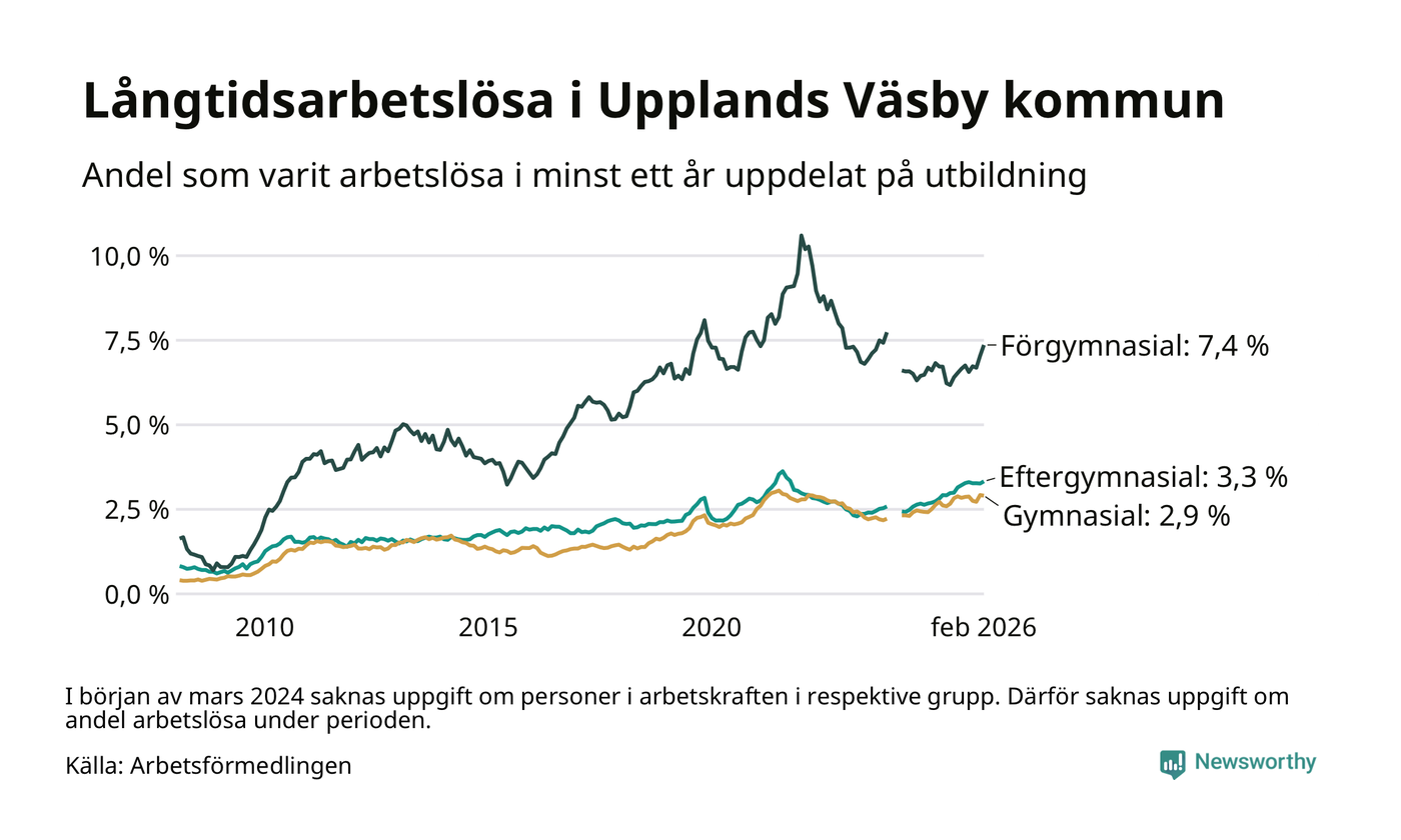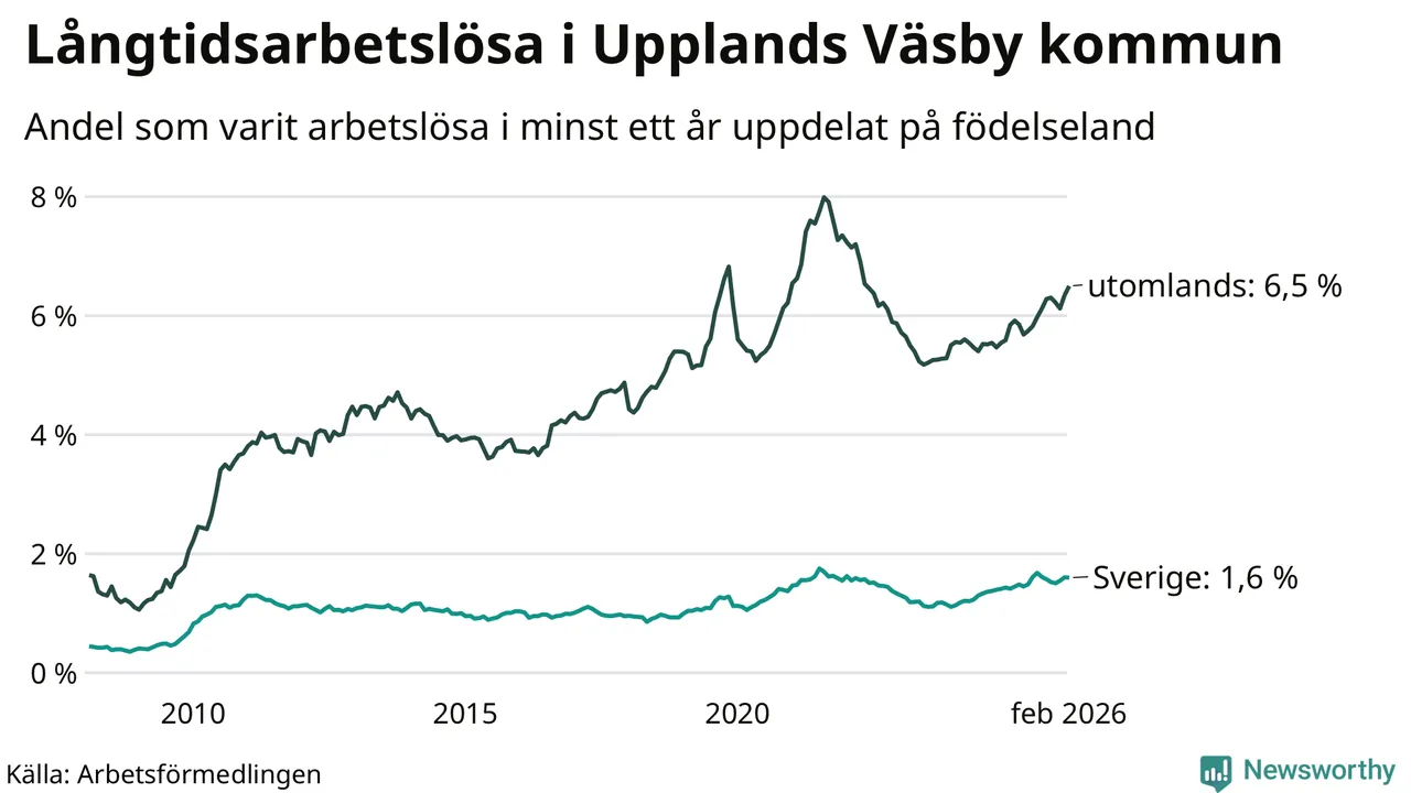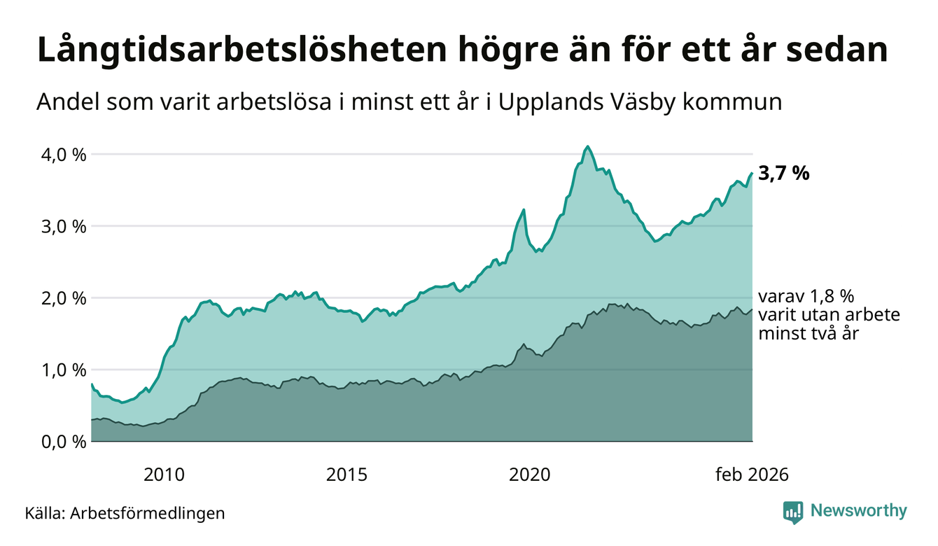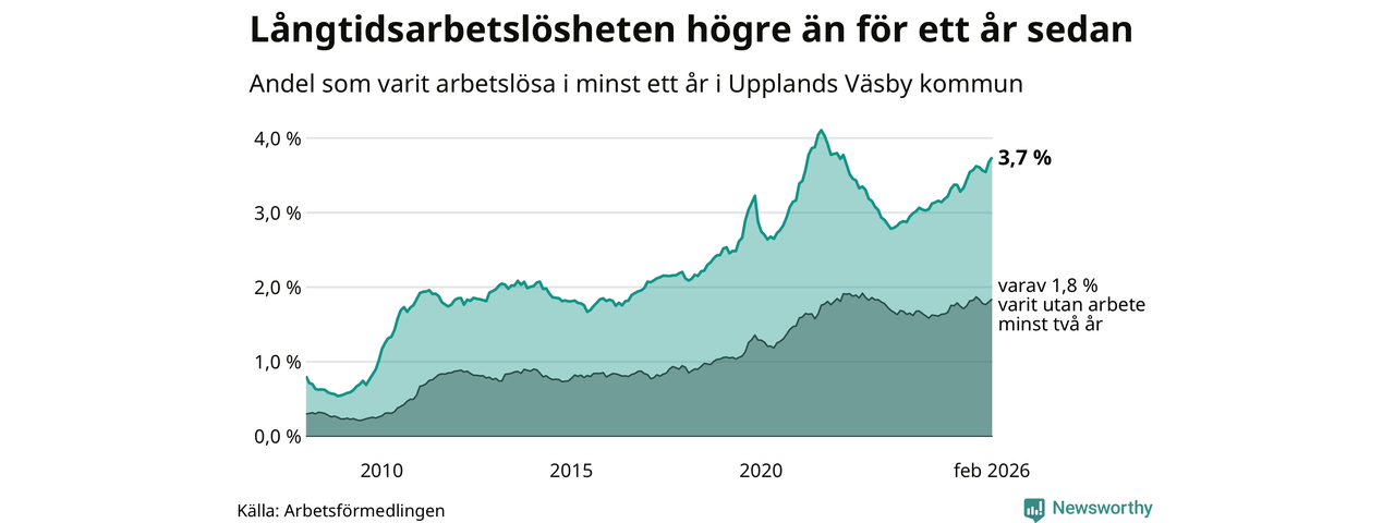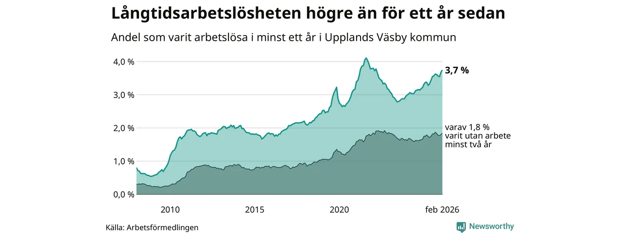 Inte sedan mars 2022 har andelen långtidsarbetslösa varit så hög i Upplands Väsby. Det visar Arbetsförmedlingens senaste månadsstatistik.