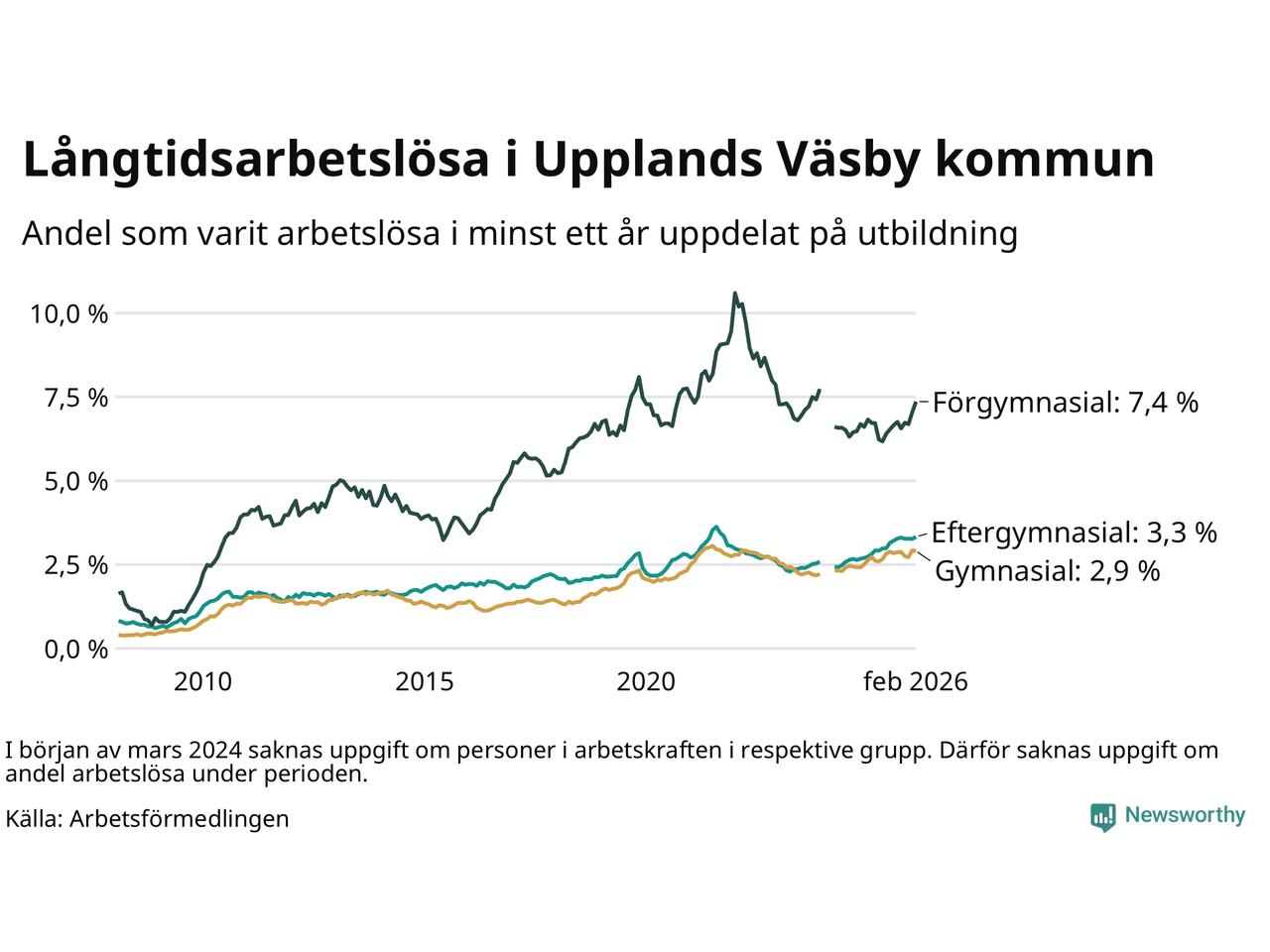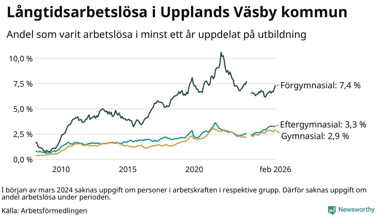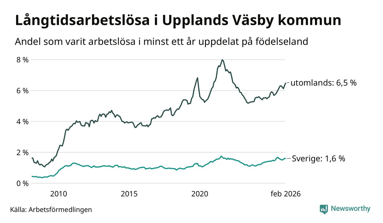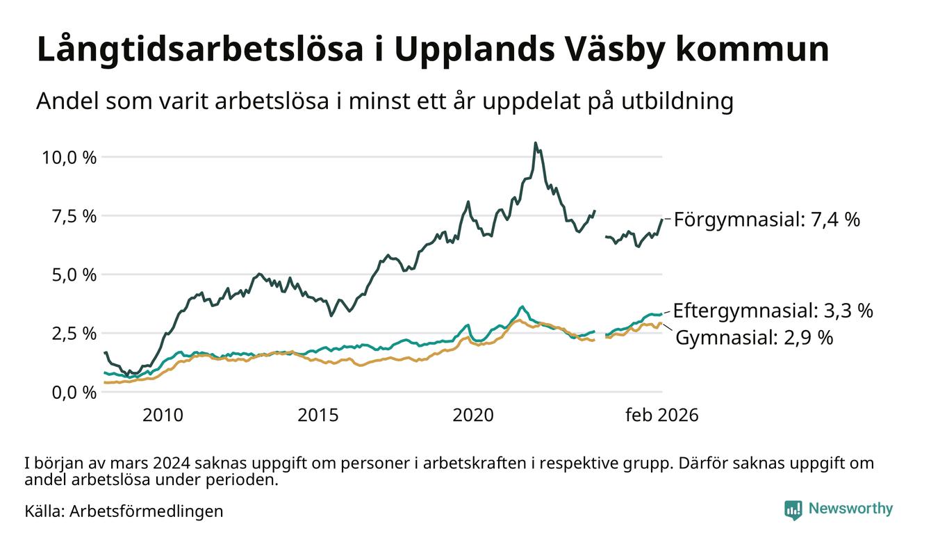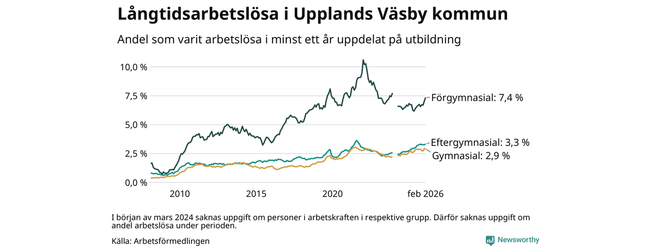 Inte sedan mars 2022 har andelen långtidsarbetslösa varit så hög i Upplands Väsby. Det visar Arbetsförmedlingens senaste månadsstatistik.