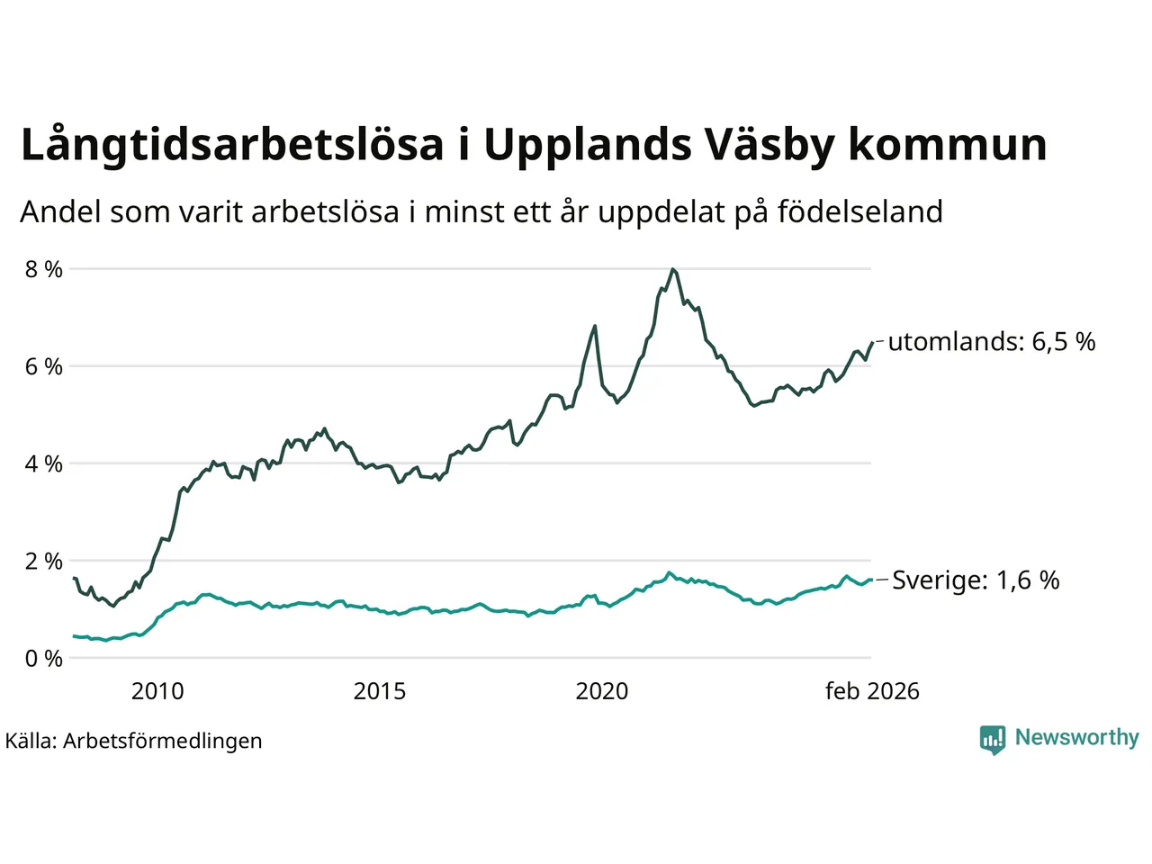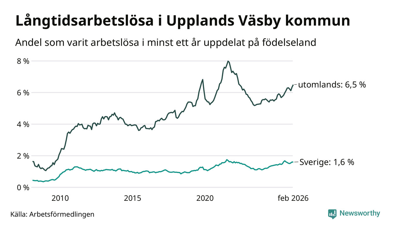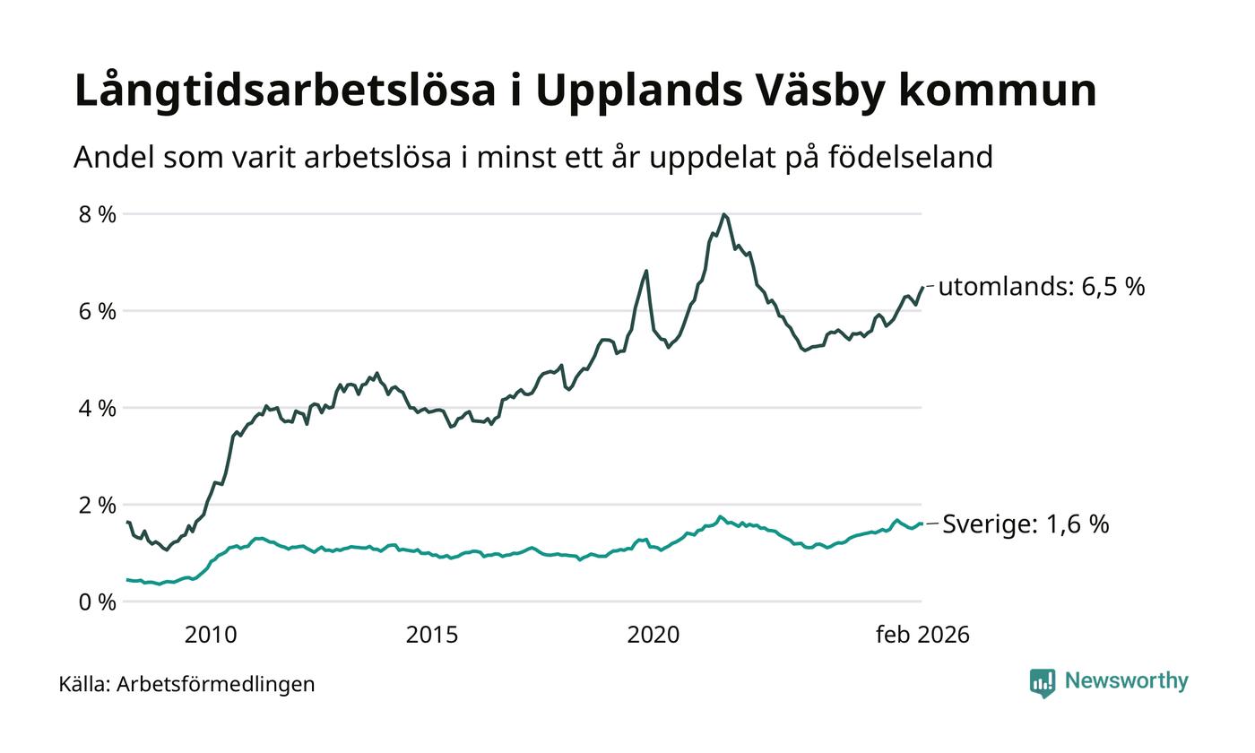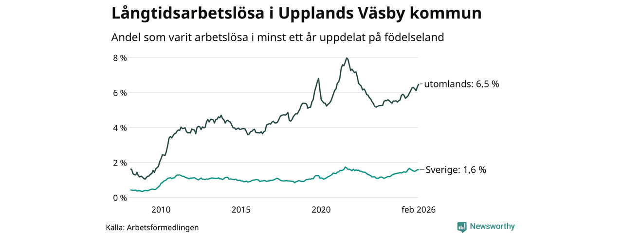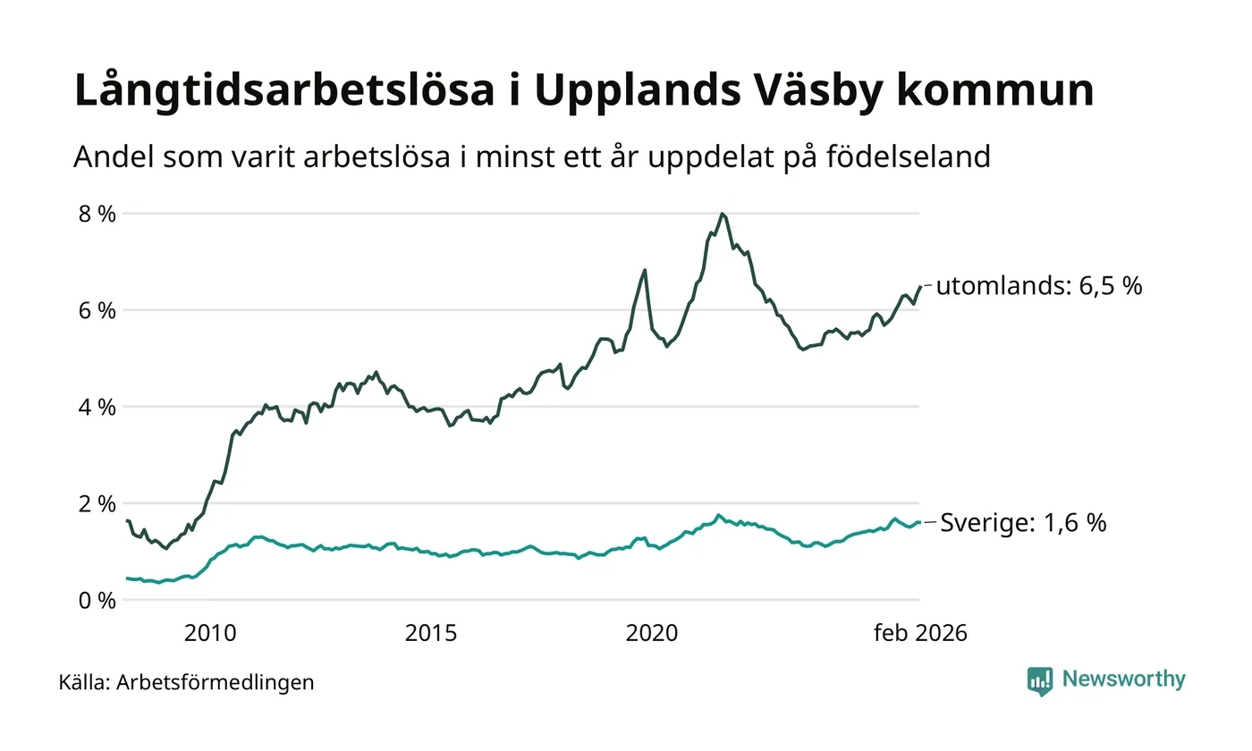 236 av de långtidsarbetslösa i Upplands Väsby är födda i Sverige, medan 748 är födda utomlands. Det innebär att långtidsarbetslösheten bland Sverigefödda är 1,6 procent, medan den är fyra gånger så hög – 6,5 procent – bland födda utomlands. Även i riket som helhet är arbetslösheten högre bland utrikesfödda.