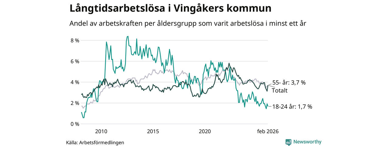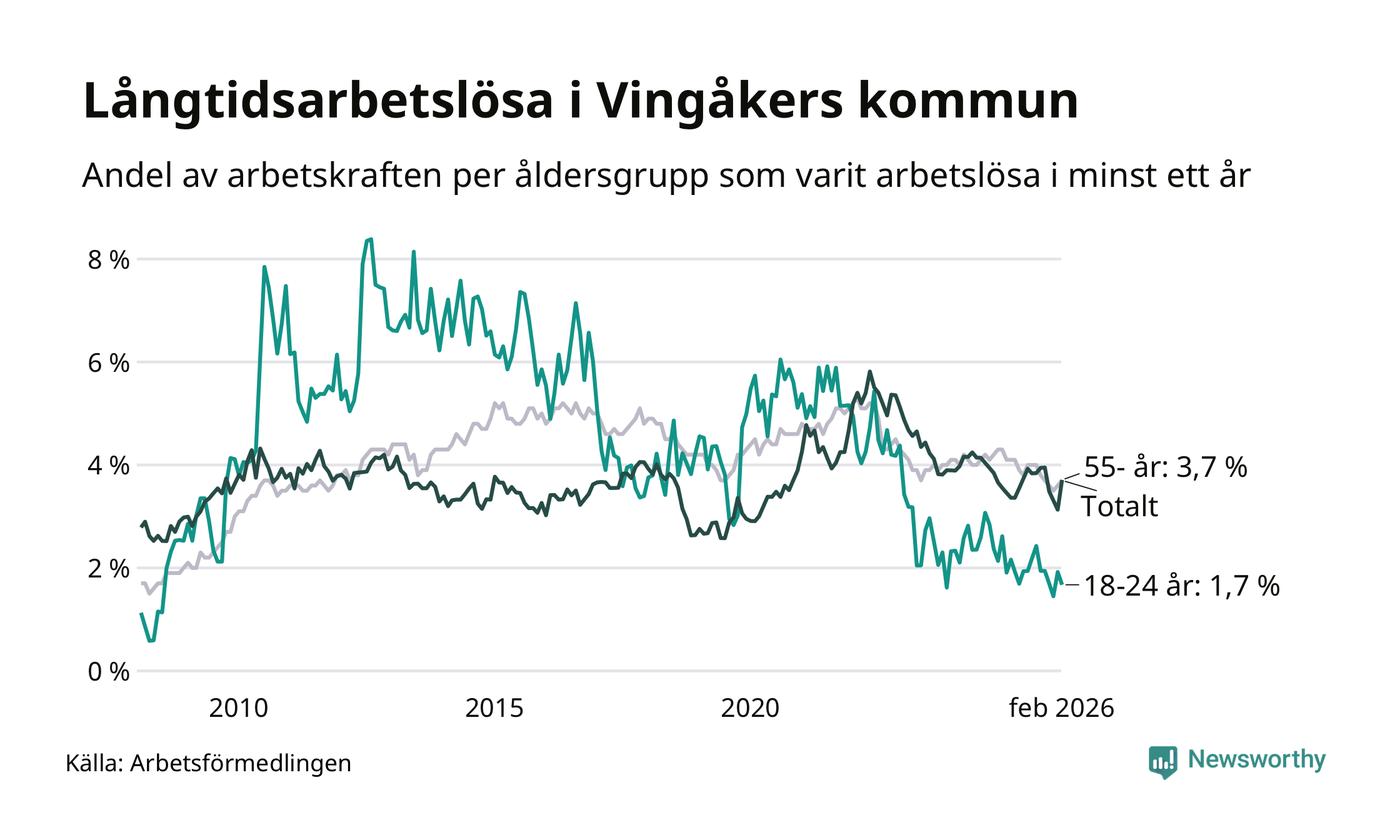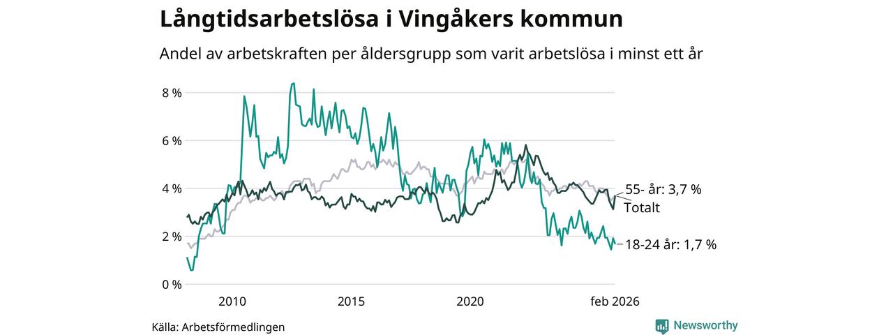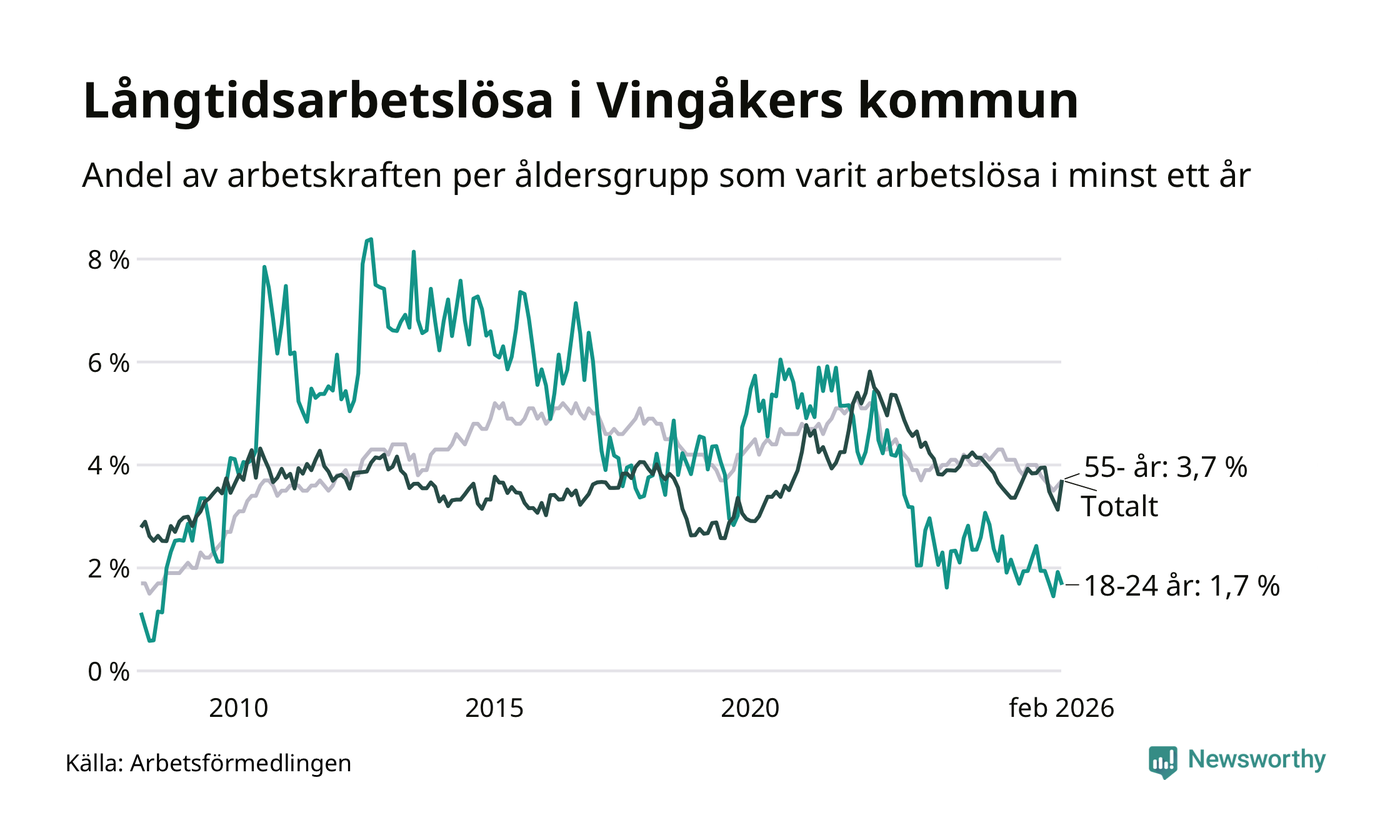 Av de 145 personerna som varit arbetslösa i mer än ett år i Vingåkers kommun är 39 personer mellan 55 och 661 år och sju är mellan 18 och 24 år. För den äldre gruppen är andelen arbetslösa 3,7 procent medan den i den yngre gruppen är 1,7 procent. Även i riket som helhet är långtidsarbetslösheten högre i gruppen äldre.