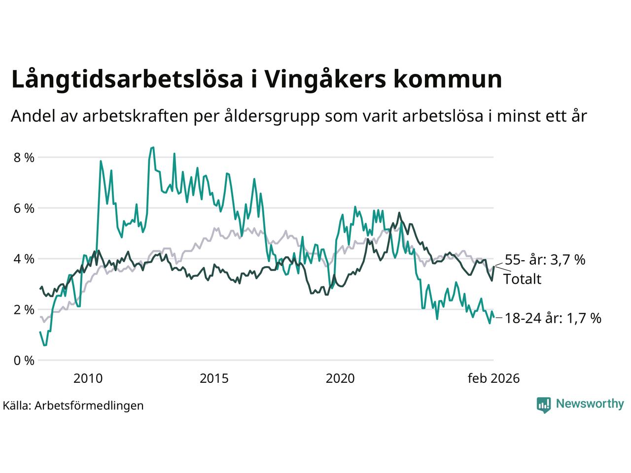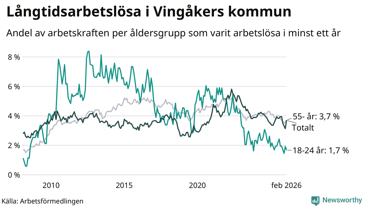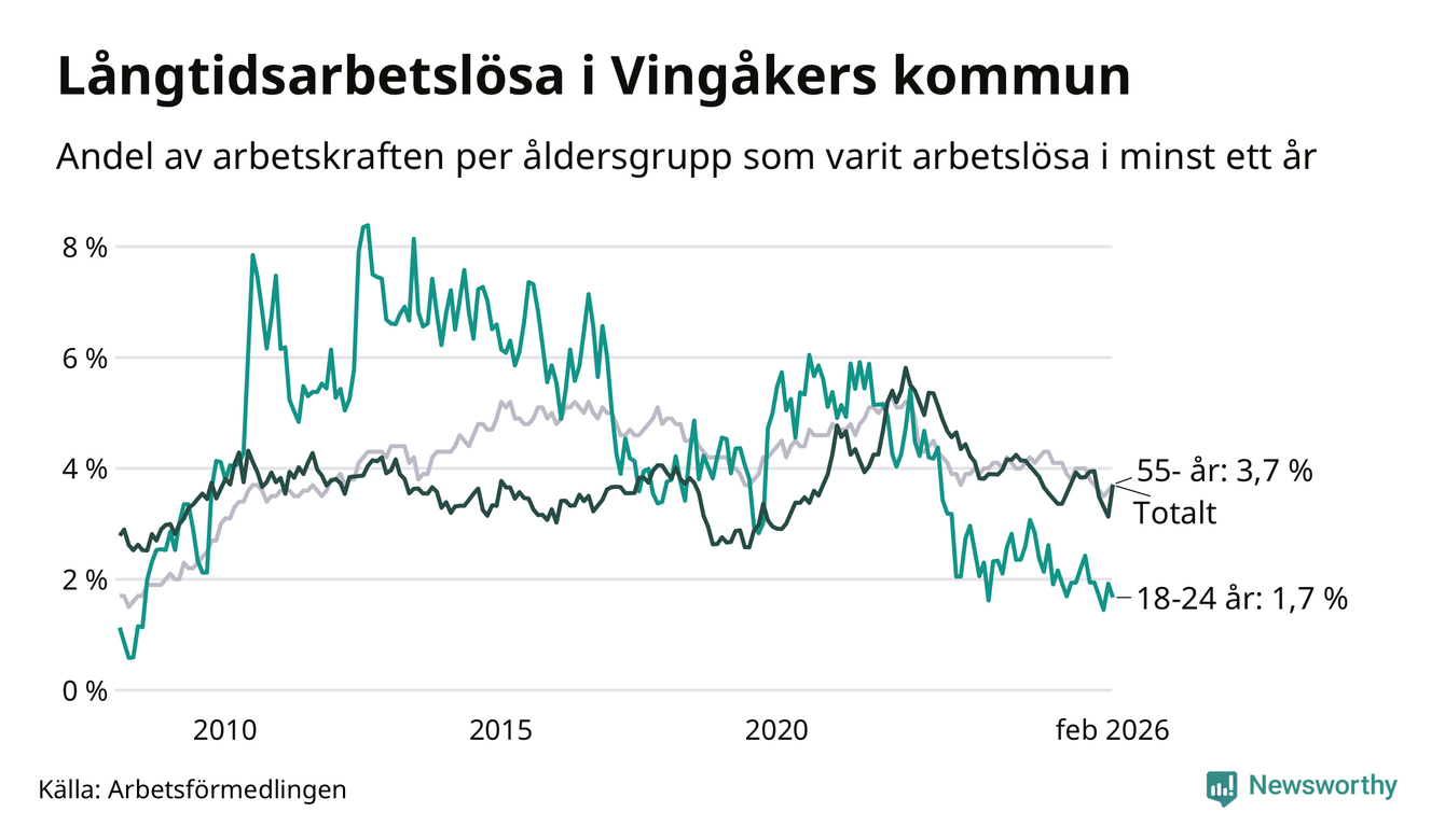 Av de 145 personerna som varit arbetslösa i mer än ett år i Vingåkers kommun är 39 personer mellan 55 och 661 år och sju är mellan 18 och 24 år. För den äldre gruppen är andelen arbetslösa 3,7 procent medan den i den yngre gruppen är 1,7 procent. Även i riket som helhet är långtidsarbetslösheten högre i gruppen äldre.
