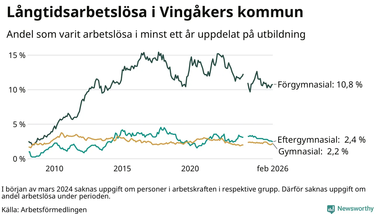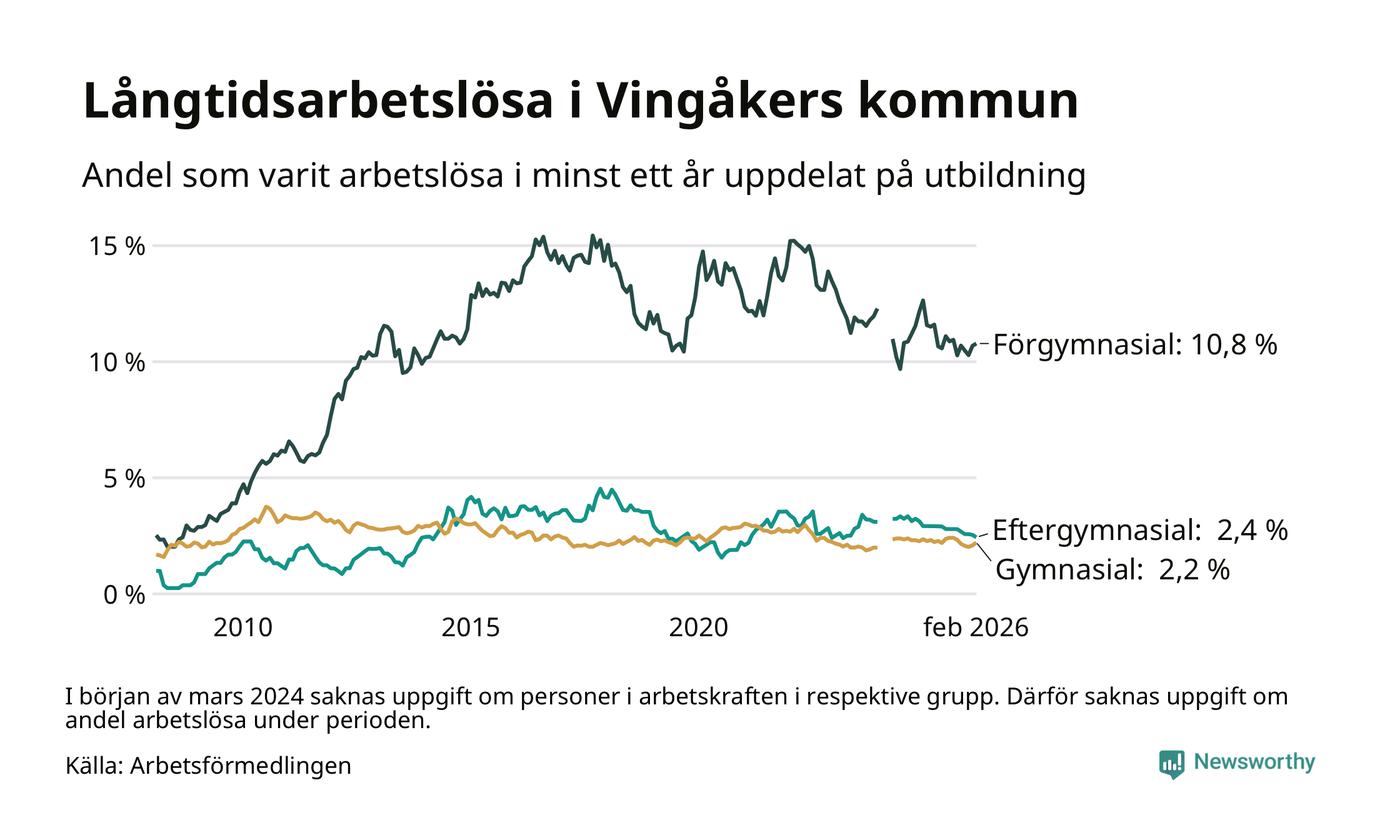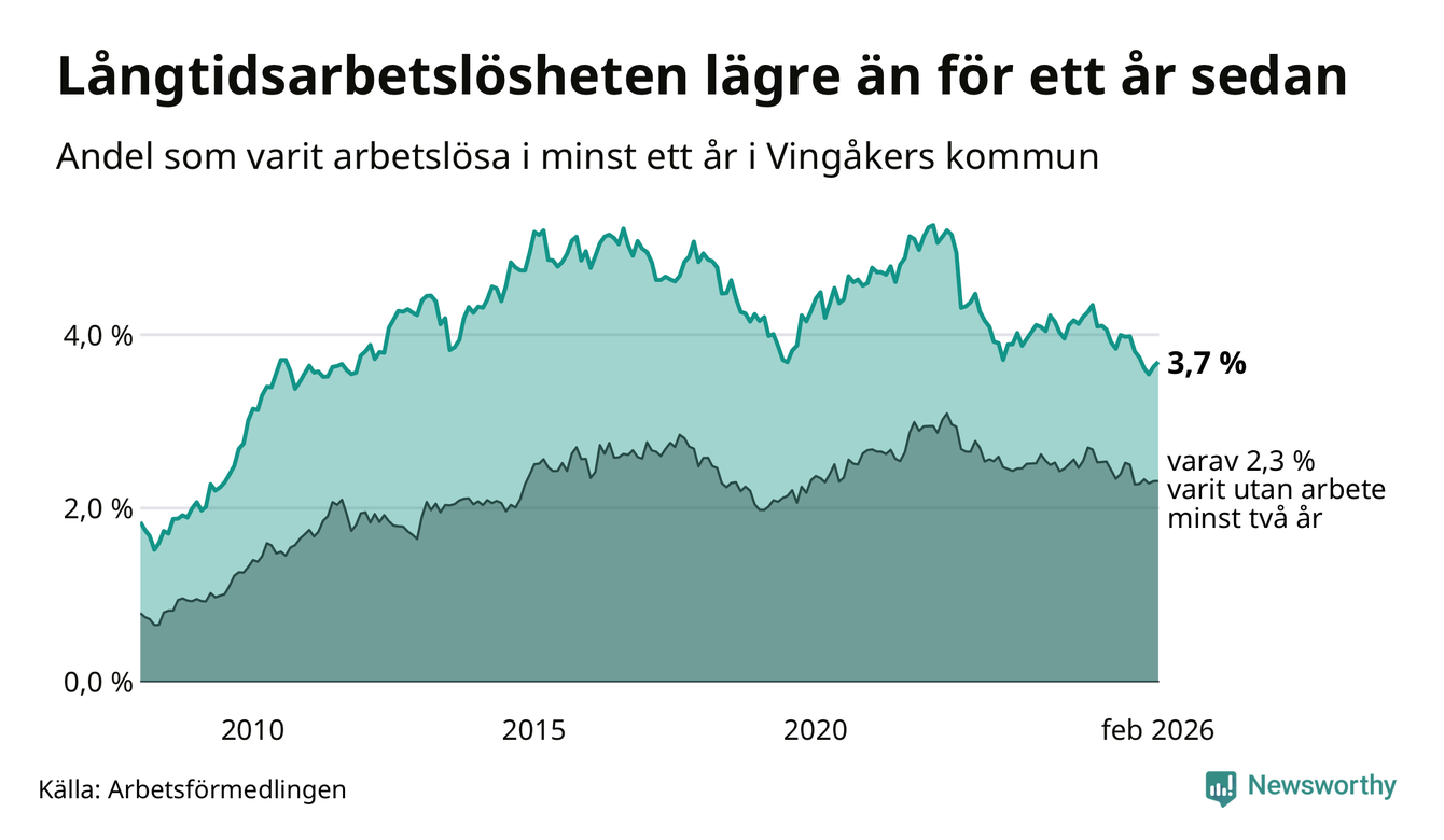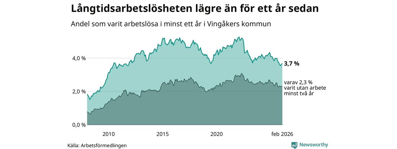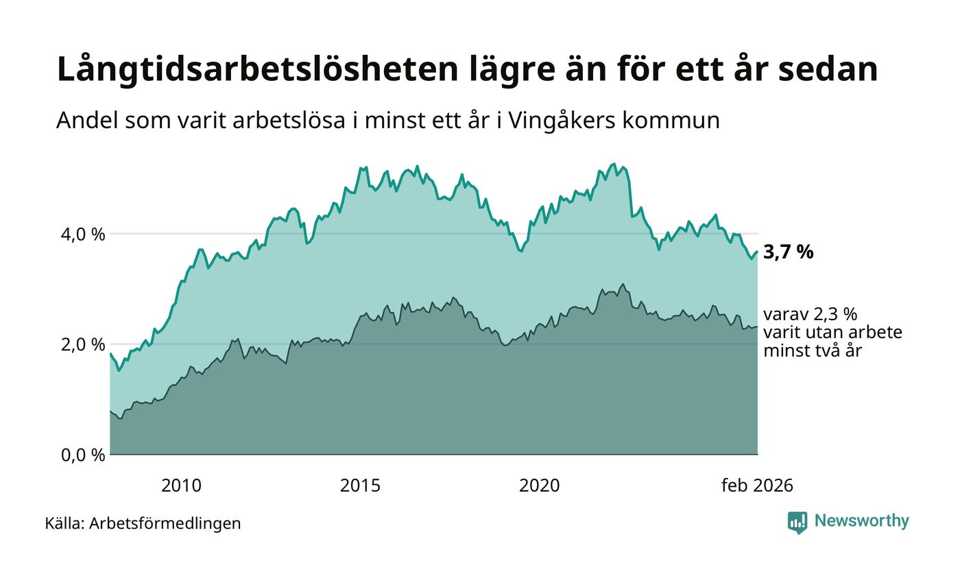 I februari hade 145 Vingåkersbor varit arbetslösa i minst ett år, vilket är två fler än månaden innan. 145 personer motsvarar 3,7 procent av arbetskraften i kommunen – andelen långtidsarbetslösa är 0,4 procentenheter lägre än samma månad för ett år sedan.