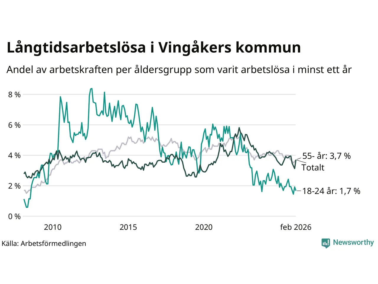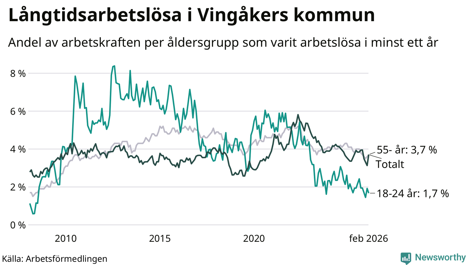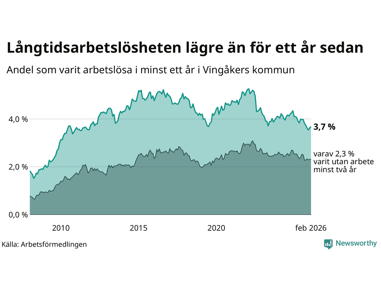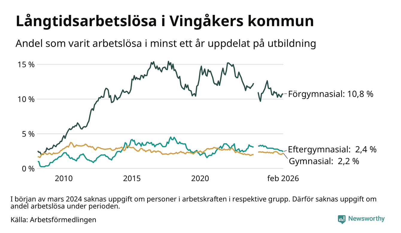 I februari hade 145 Vingåkersbor varit arbetslösa i minst ett år, vilket är två fler än månaden innan. 145 personer motsvarar 3,7 procent av arbetskraften i kommunen – andelen långtidsarbetslösa är 0,4 procentenheter lägre än samma månad för ett år sedan.
