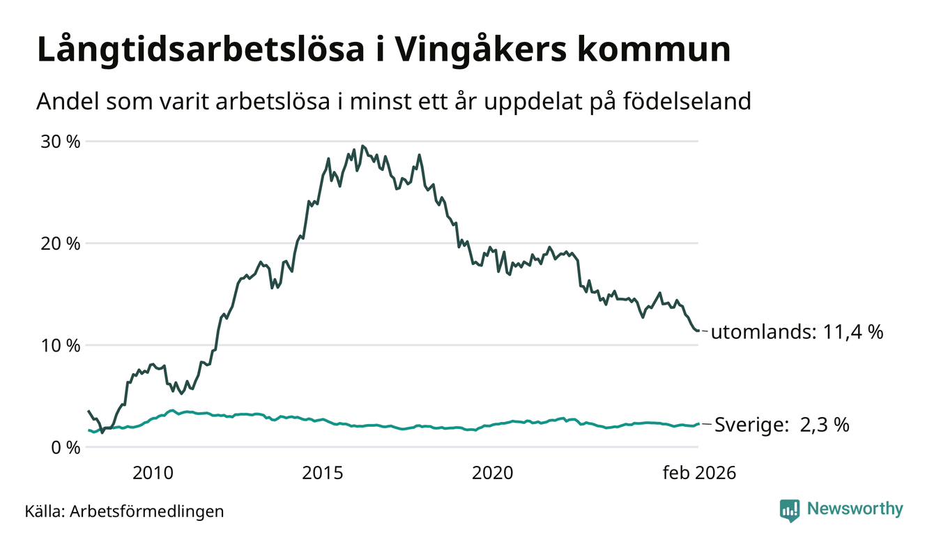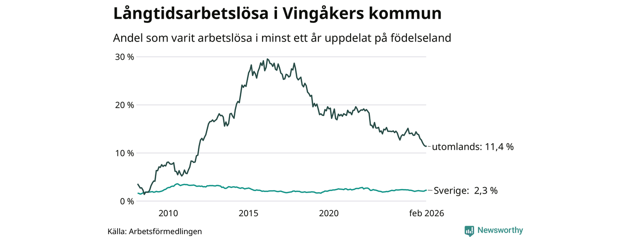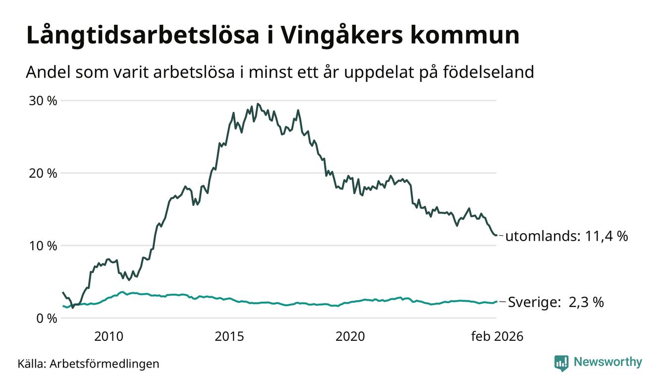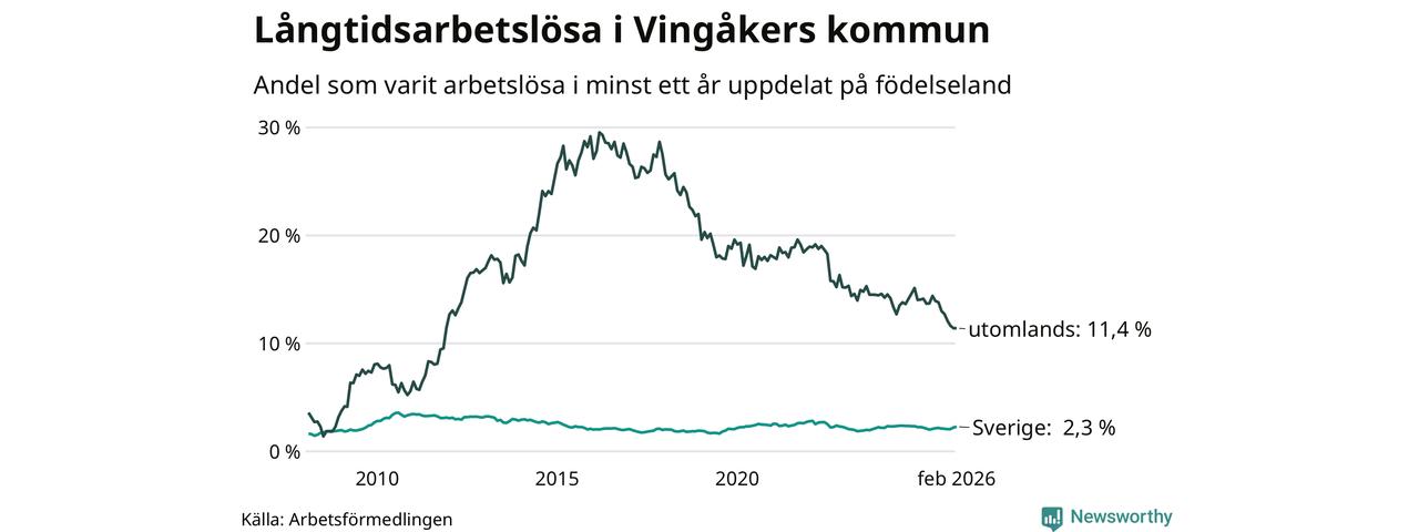 76 av de långtidsarbetslösa i Vingåker är födda i Sverige, medan 69 är födda utomlands. Det innebär att långtidsarbetslösheten bland Sverigefödda är 2,3 procent, medan den är fem gånger så hög – 11,4 procent – bland födda utomlands. Även i riket som helhet är arbetslösheten högre bland utrikesfödda.