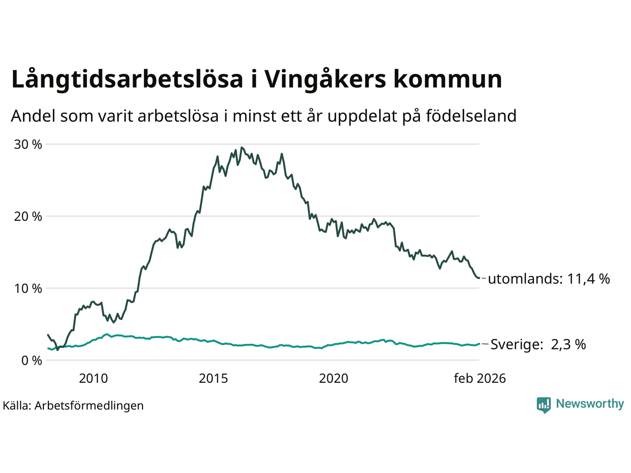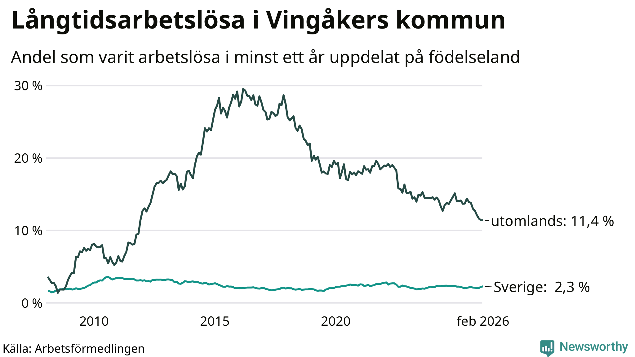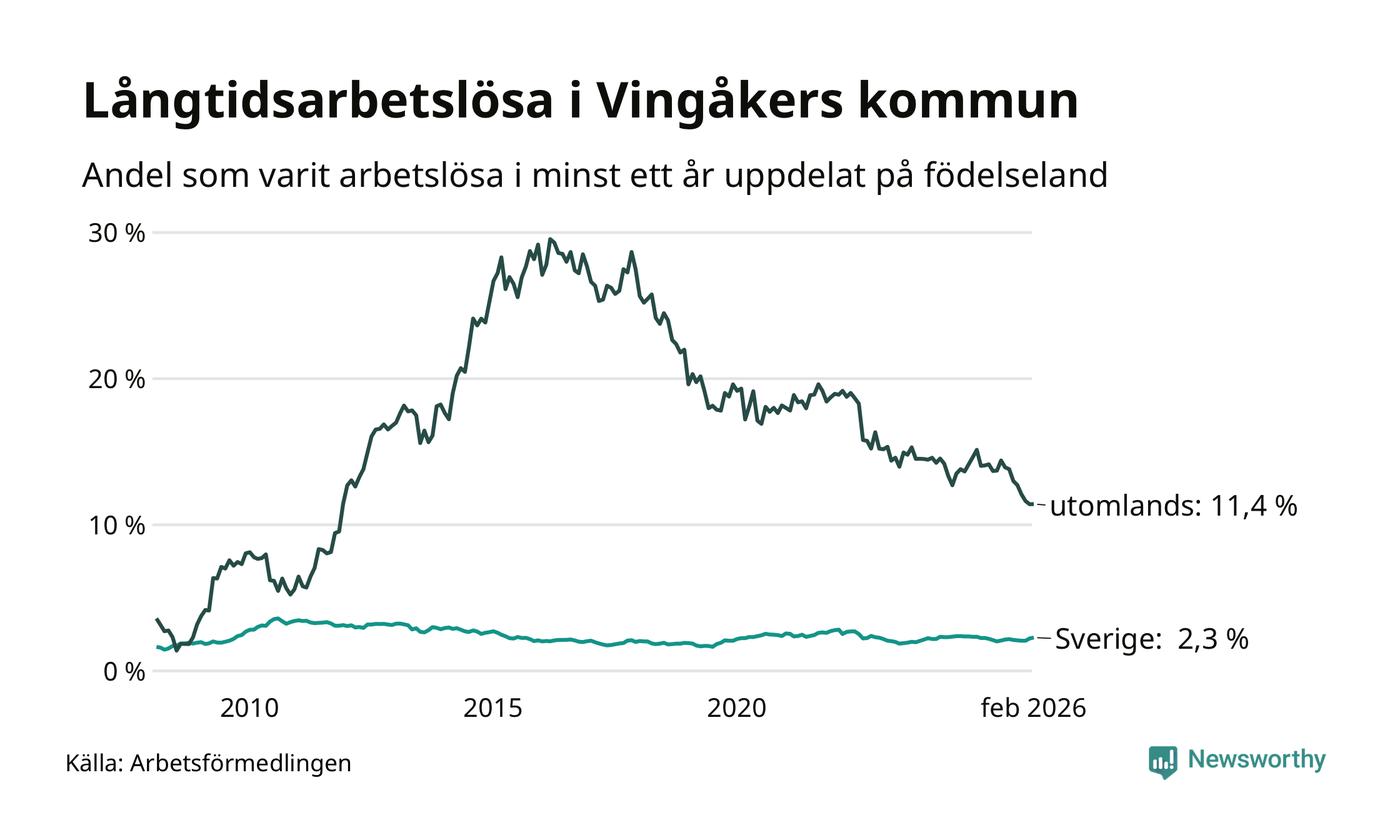 76 av de långtidsarbetslösa i Vingåker är födda i Sverige, medan 69 är födda utomlands. Det innebär att långtidsarbetslösheten bland Sverigefödda är 2,3 procent, medan den är fem gånger så hög – 11,4 procent – bland födda utomlands. Även i riket som helhet är arbetslösheten högre bland utrikesfödda.
