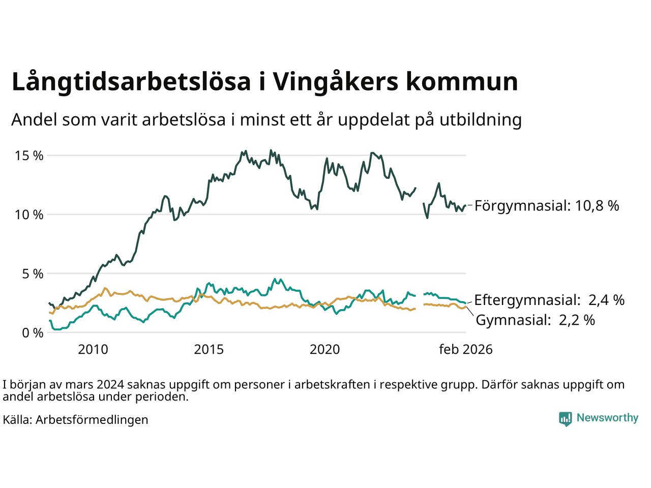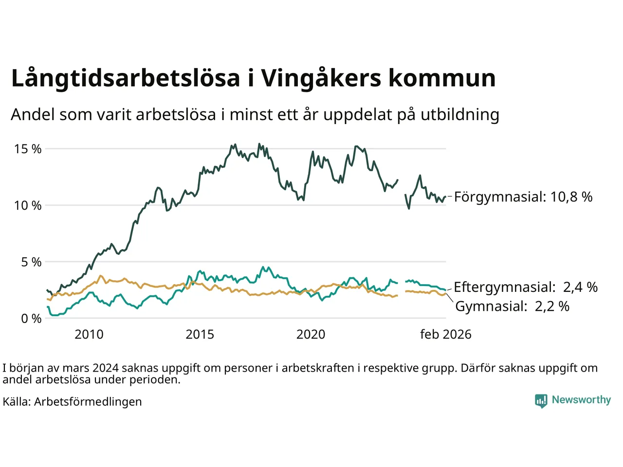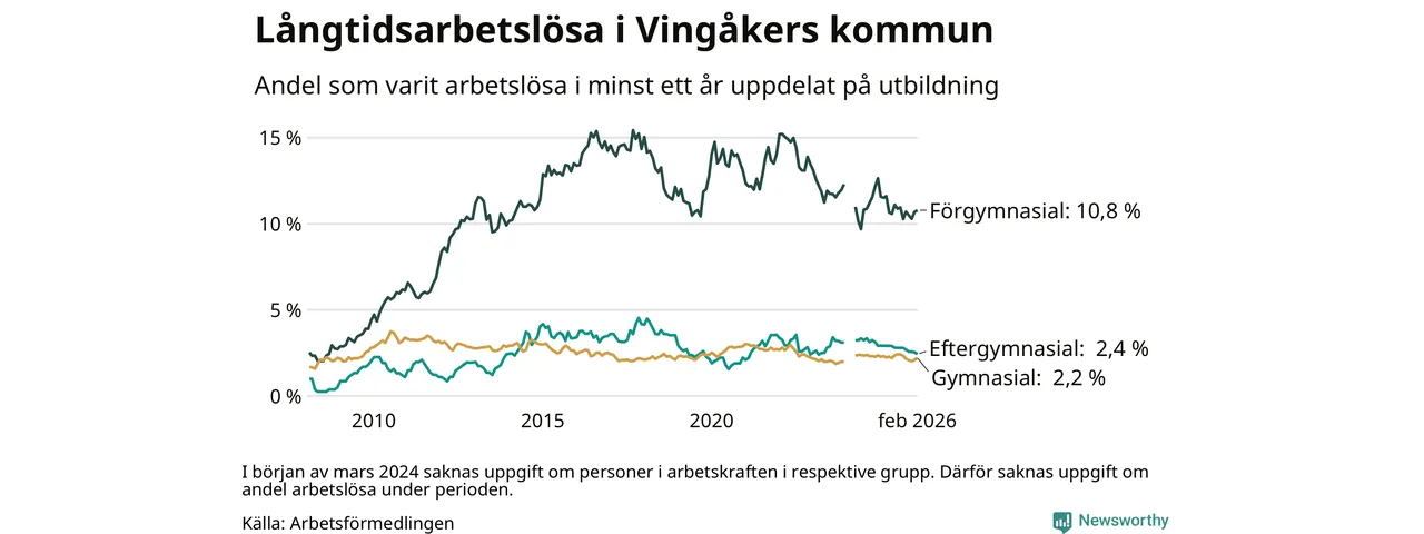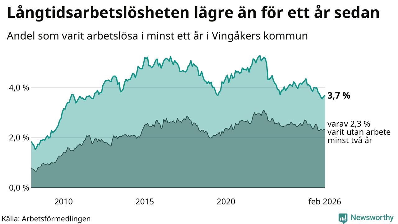 Andelen som varit utan arbete i minst ett år i Vingåker var lägre i februari jämfört med samma månad för ett år sedan. Det visar Arbetsfömedlingens senaste månadsstatistik.