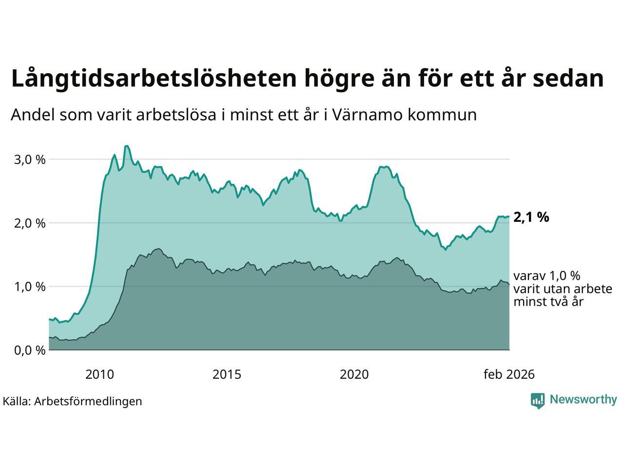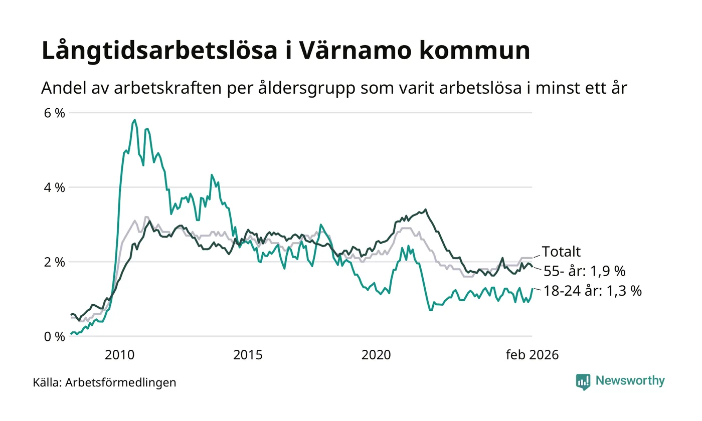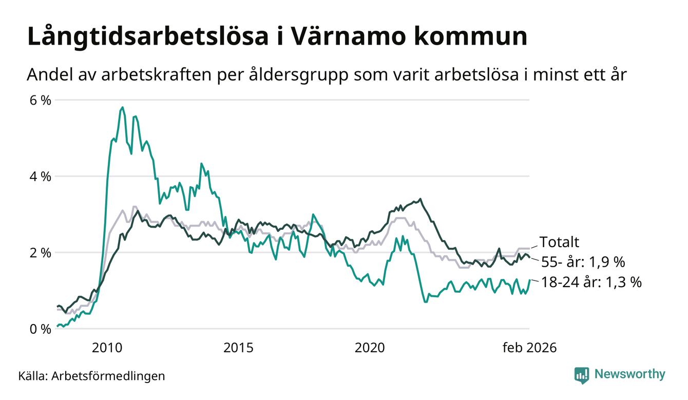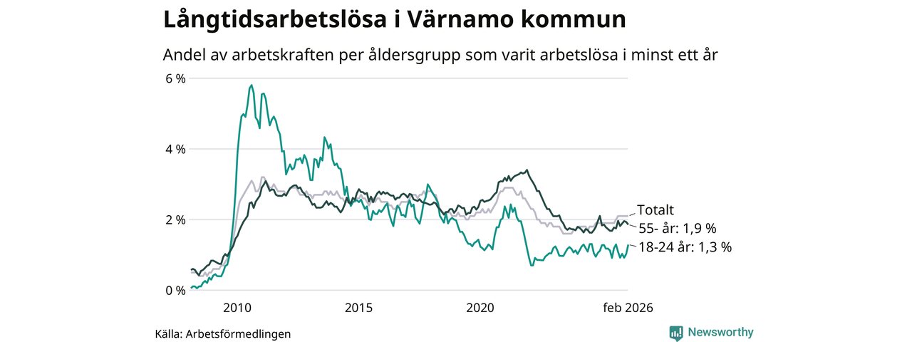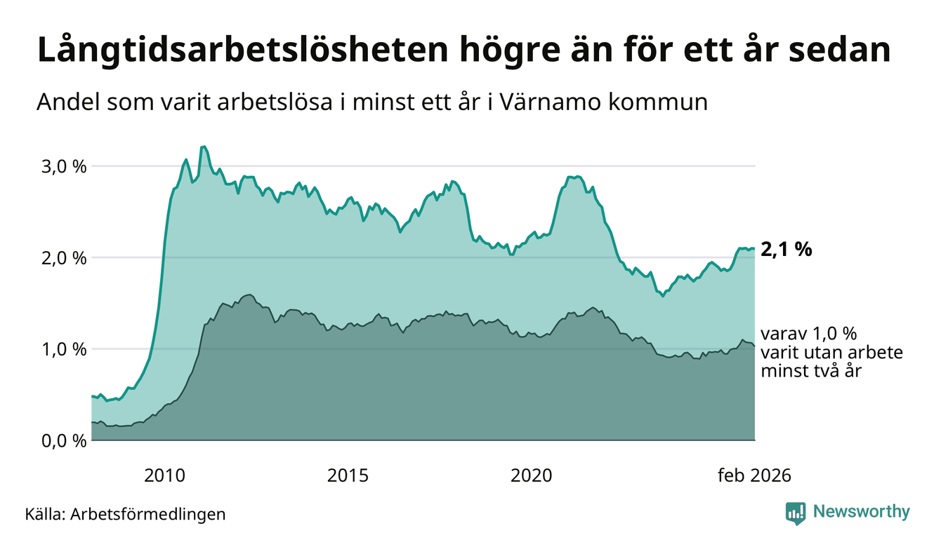 I februari hade 370 Värnamobor varit arbetslösa i minst ett år, vilket är en färre än månaden innan. 370 personer motsvarar 2,1 procent av arbetskraften i kommunen – andelen långtidsarbetslösa är 0,2 procentenheter högre än samma månad för ett år sedan.