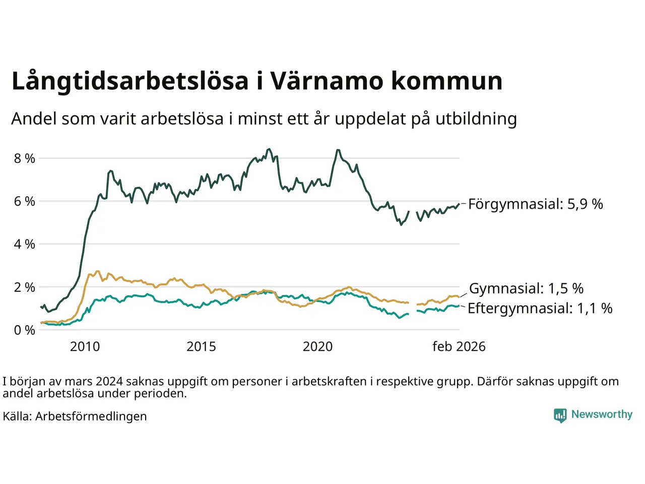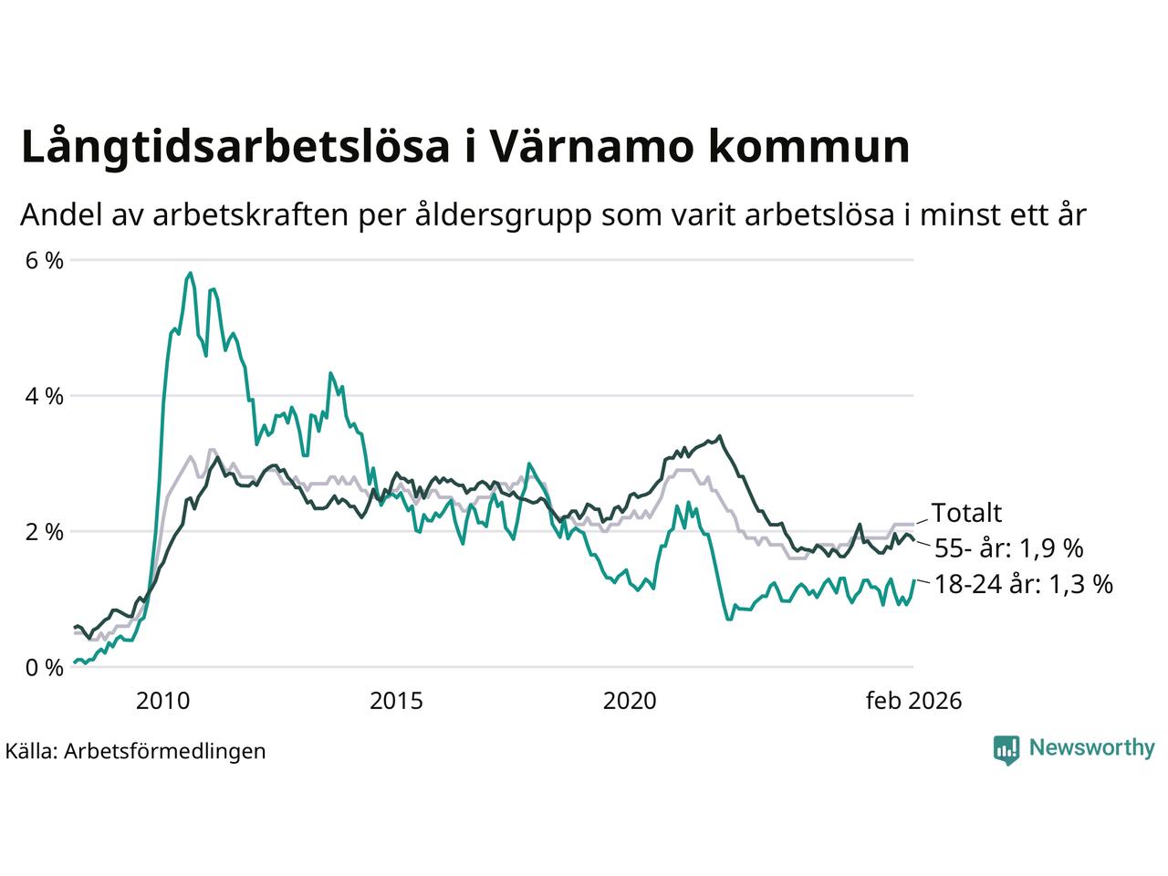 | Andel arbetslösa i minst två år | 1,0 % | 1,3 % | 1,6 % |