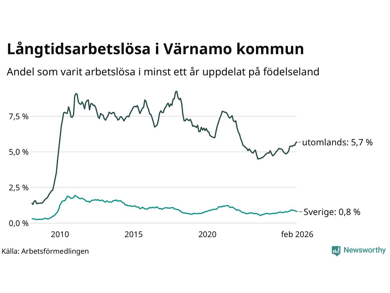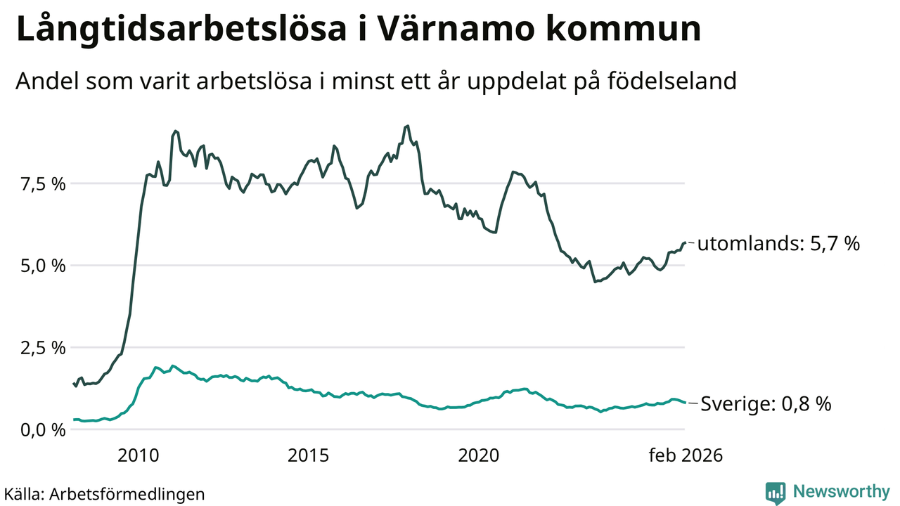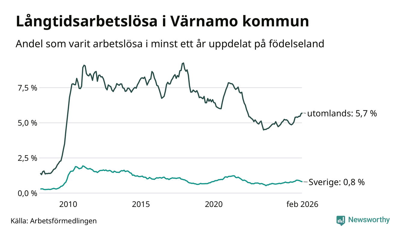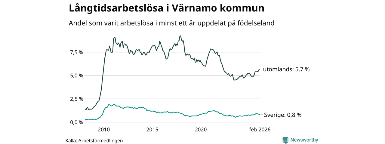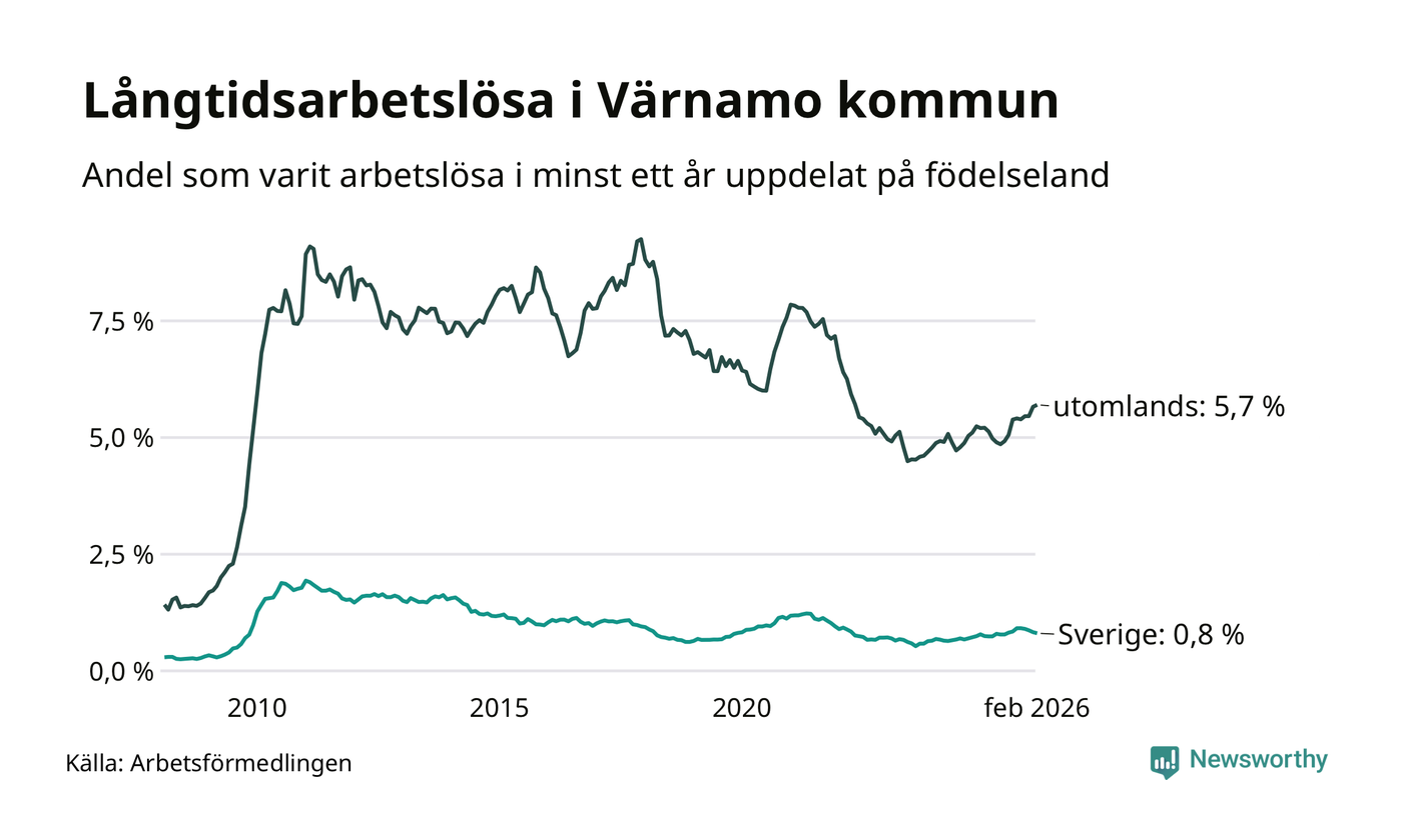 105 av de långtidsarbetslösa i Värnamo är födda i Sverige, medan 265 är födda utomlands. Det innebär att långtidsarbetslösheten bland Sverigefödda är 0,8 procent, medan den är sju gånger så hög – 5,7 procent – bland födda utomlands. Även i riket som helhet är arbetslösheten högre bland utrikesfödda.