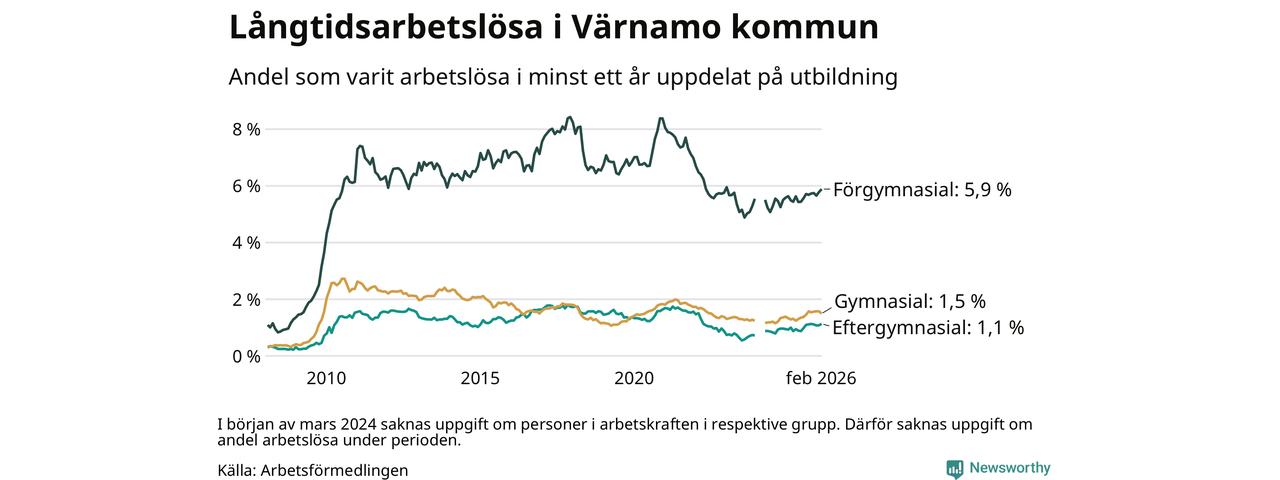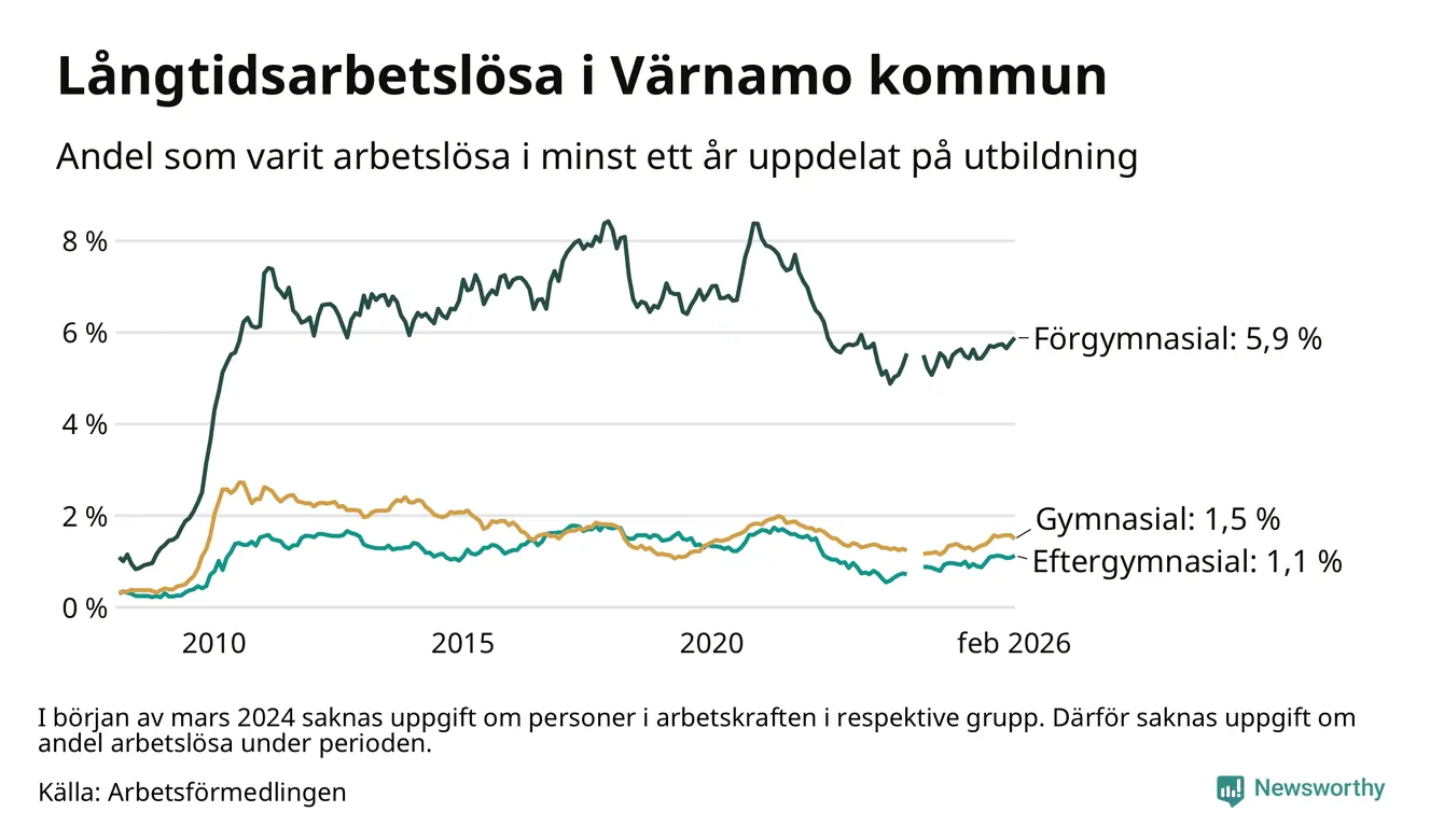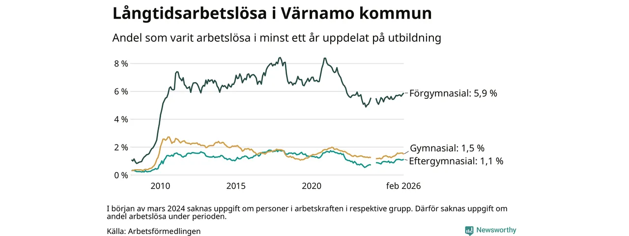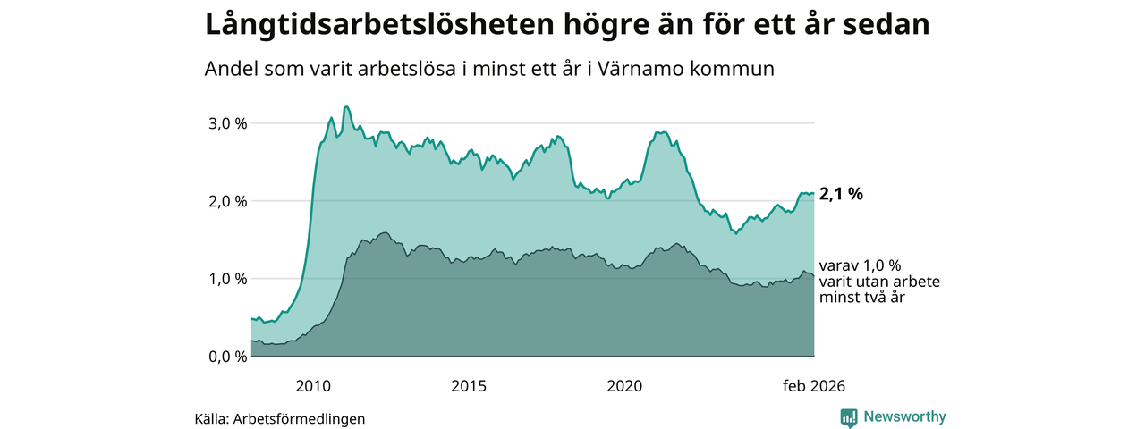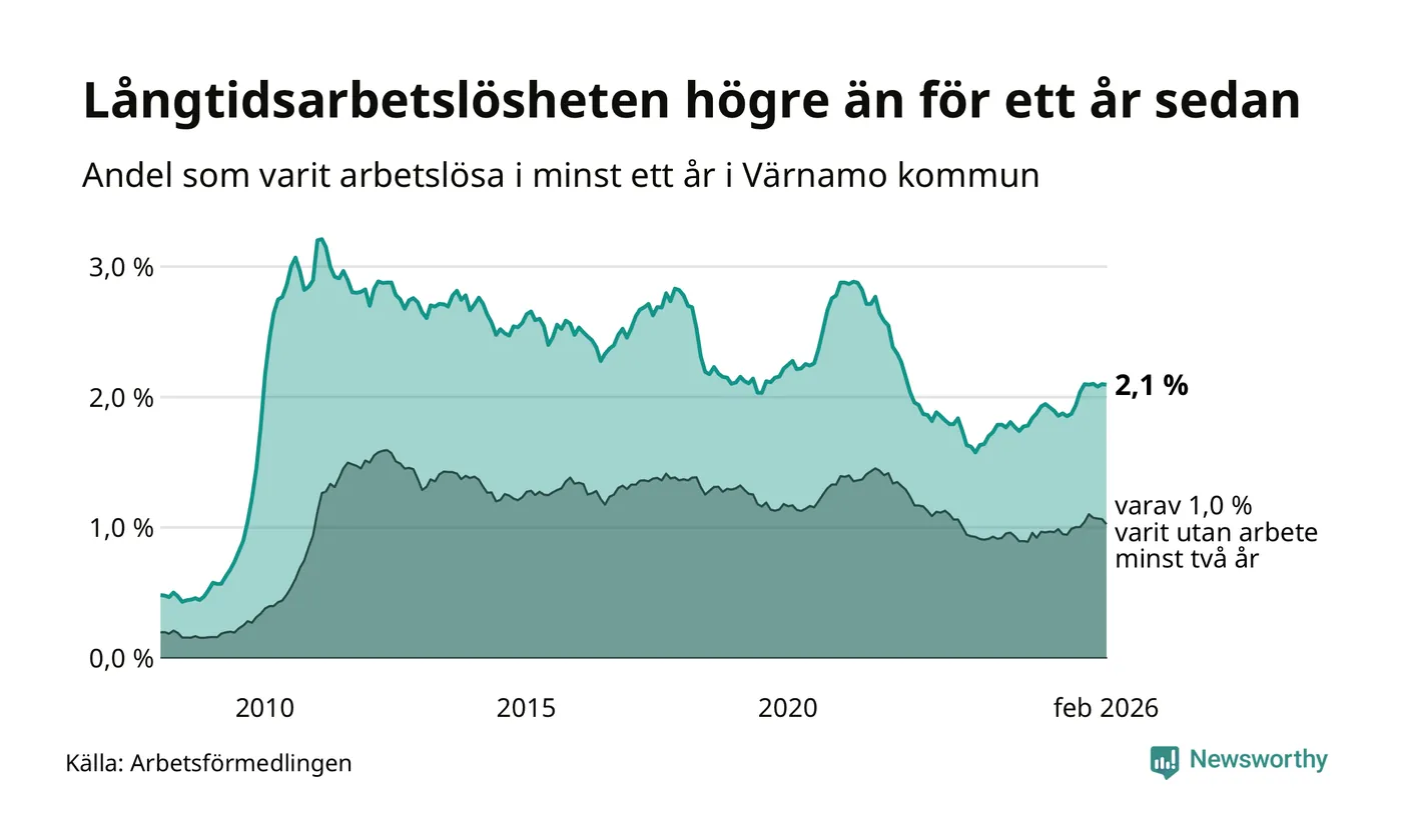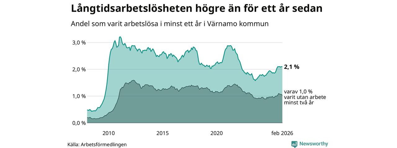 Andelen som varit utan arbete i minst ett år i Värnamo i februari var högre än för ett år sedan. Men jämfört med i januari har antalet långtidsarbetslösa minskat.