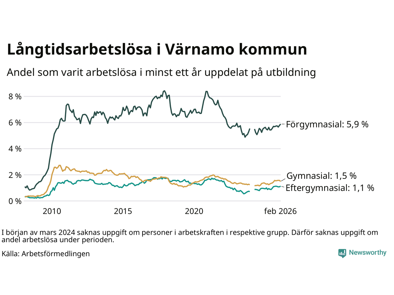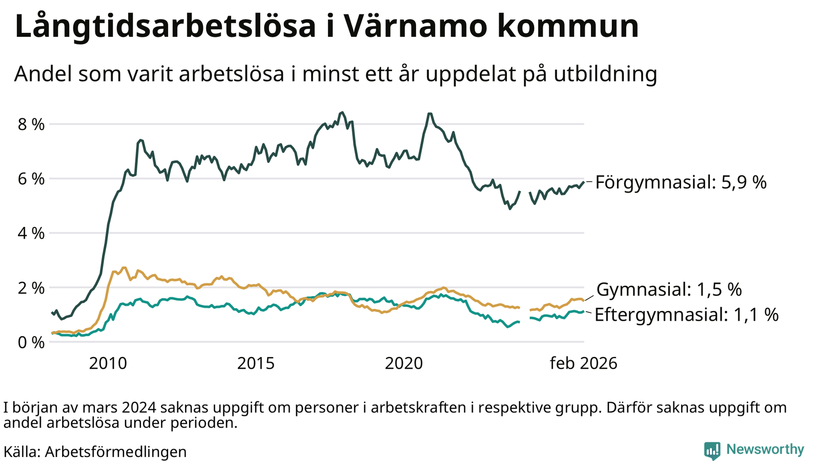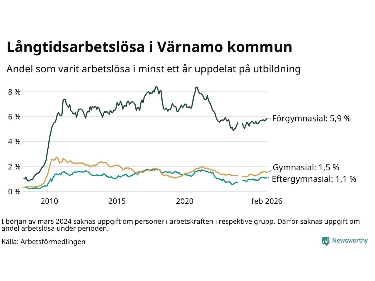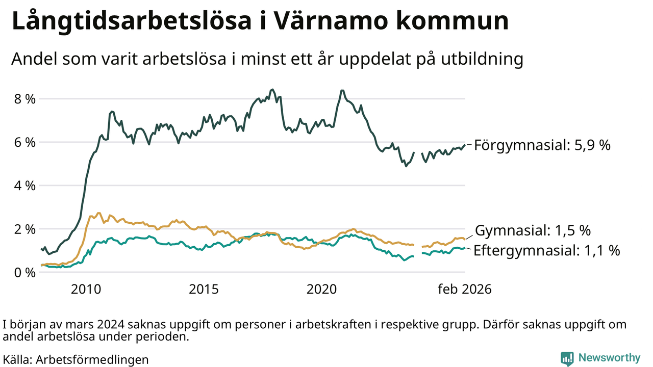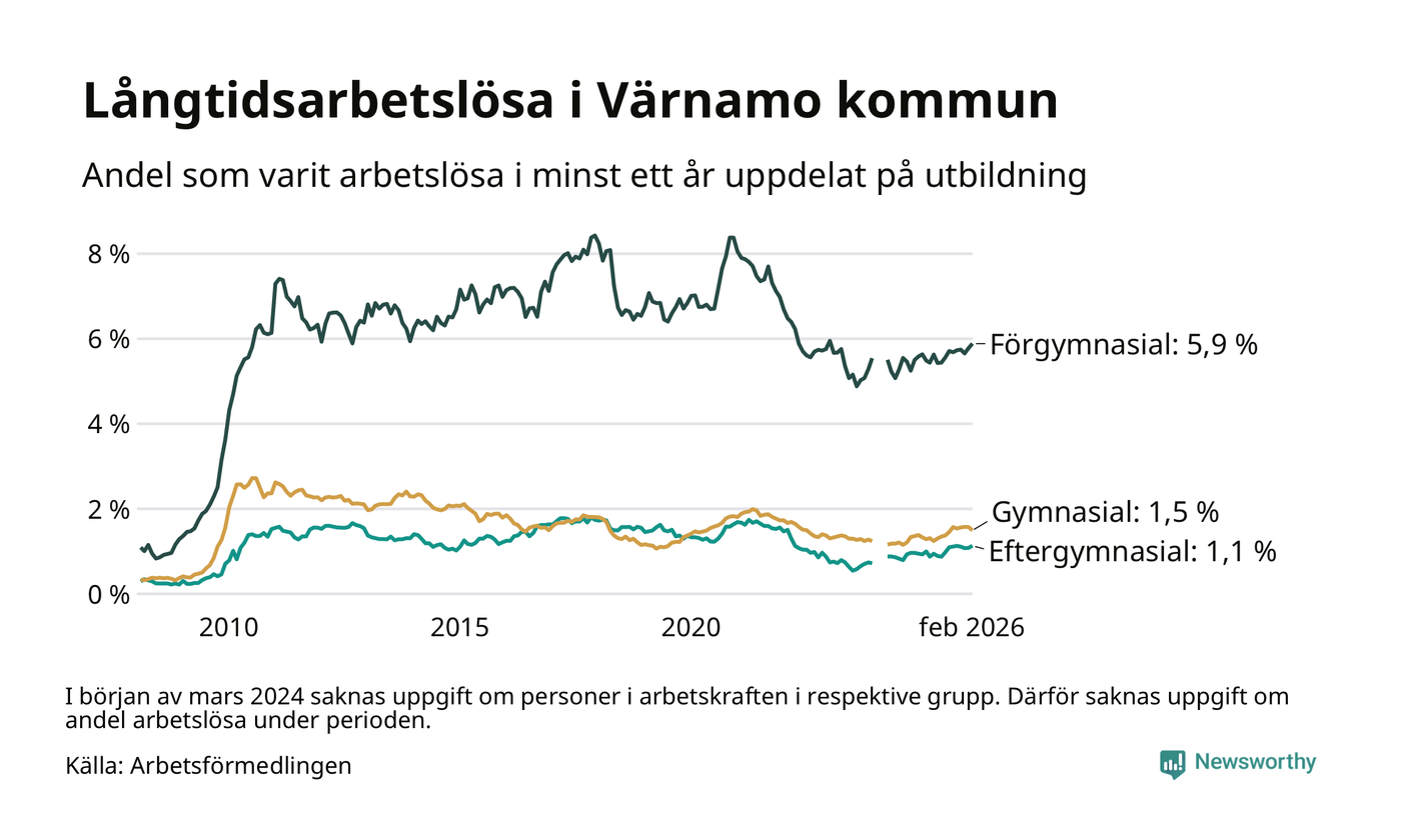 Andelen som varit utan arbete i minst ett år i Värnamo i februari var högre än för ett år sedan. Men jämfört med i januari har antalet långtidsarbetslösa minskat.