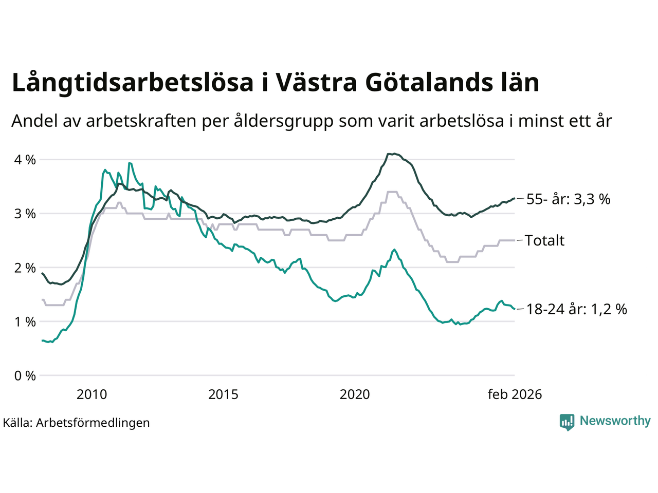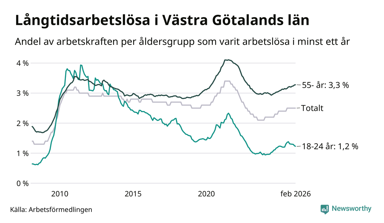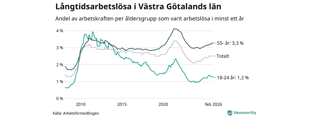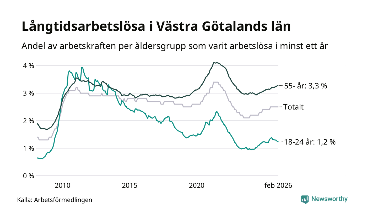 Av de 22 944 personerna som varit arbetslösa i mer än ett år i Västra Götalands län är mellan 6 136 och 6 136 personer mellan 55 och 661 år och mellan 1 135 och 1 135 är mellan 18 och 24 år. För den äldre gruppen är andelen arbetslösa 3,3 procent medan den i den yngre gruppen är 1,2 procent. Även i riket som helhet är långtidsarbetslösheten högre i gruppen äldre.