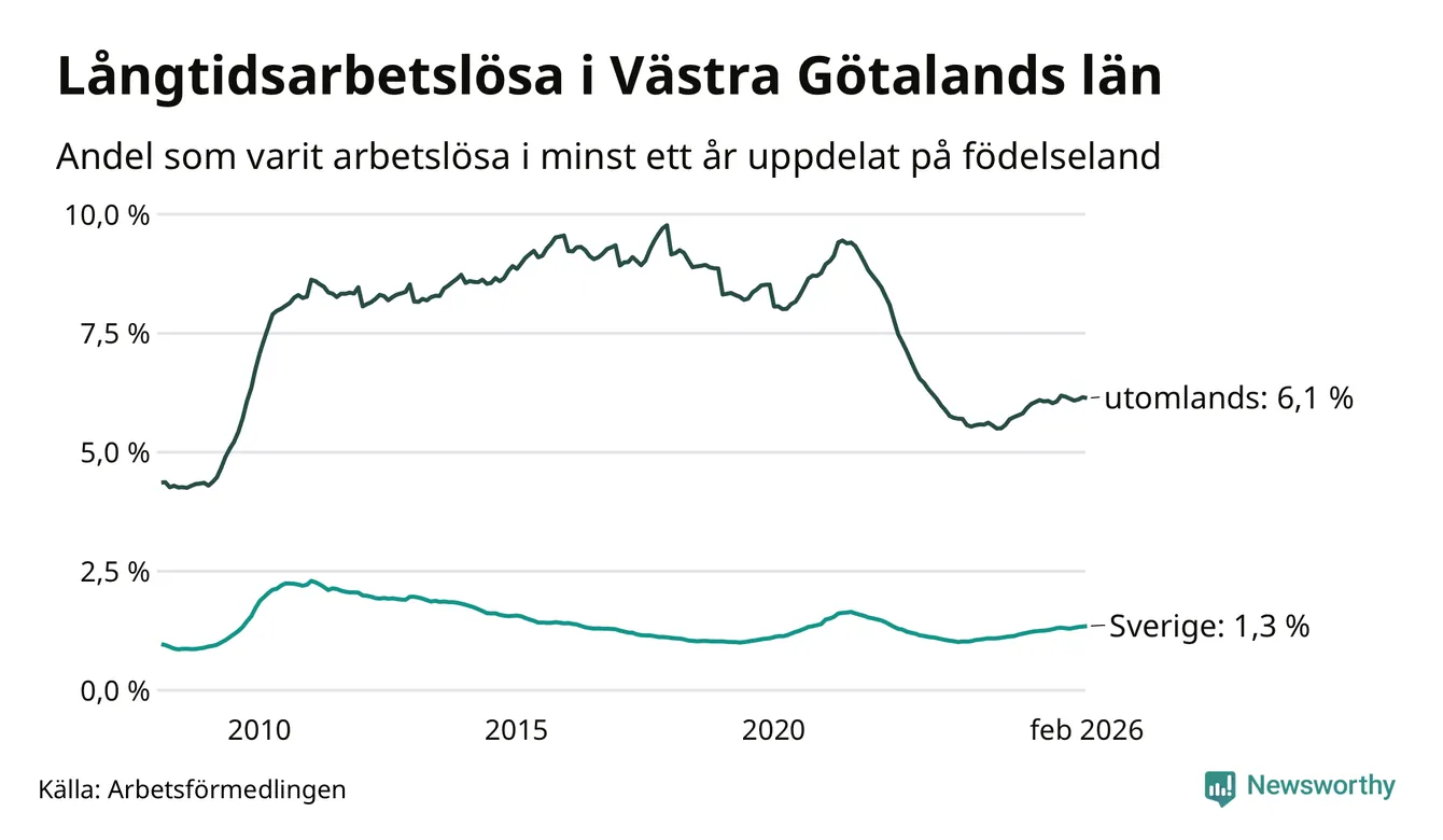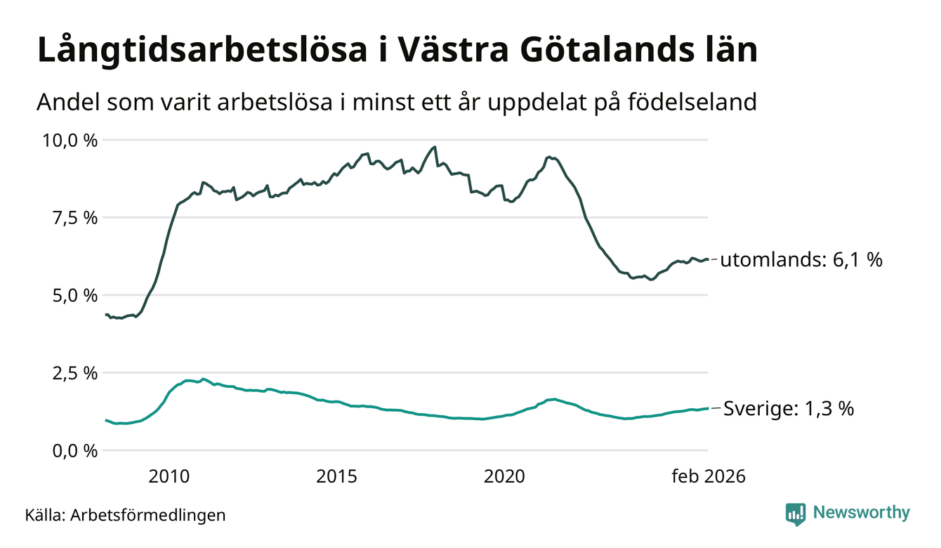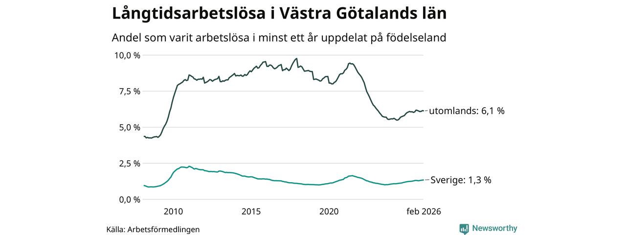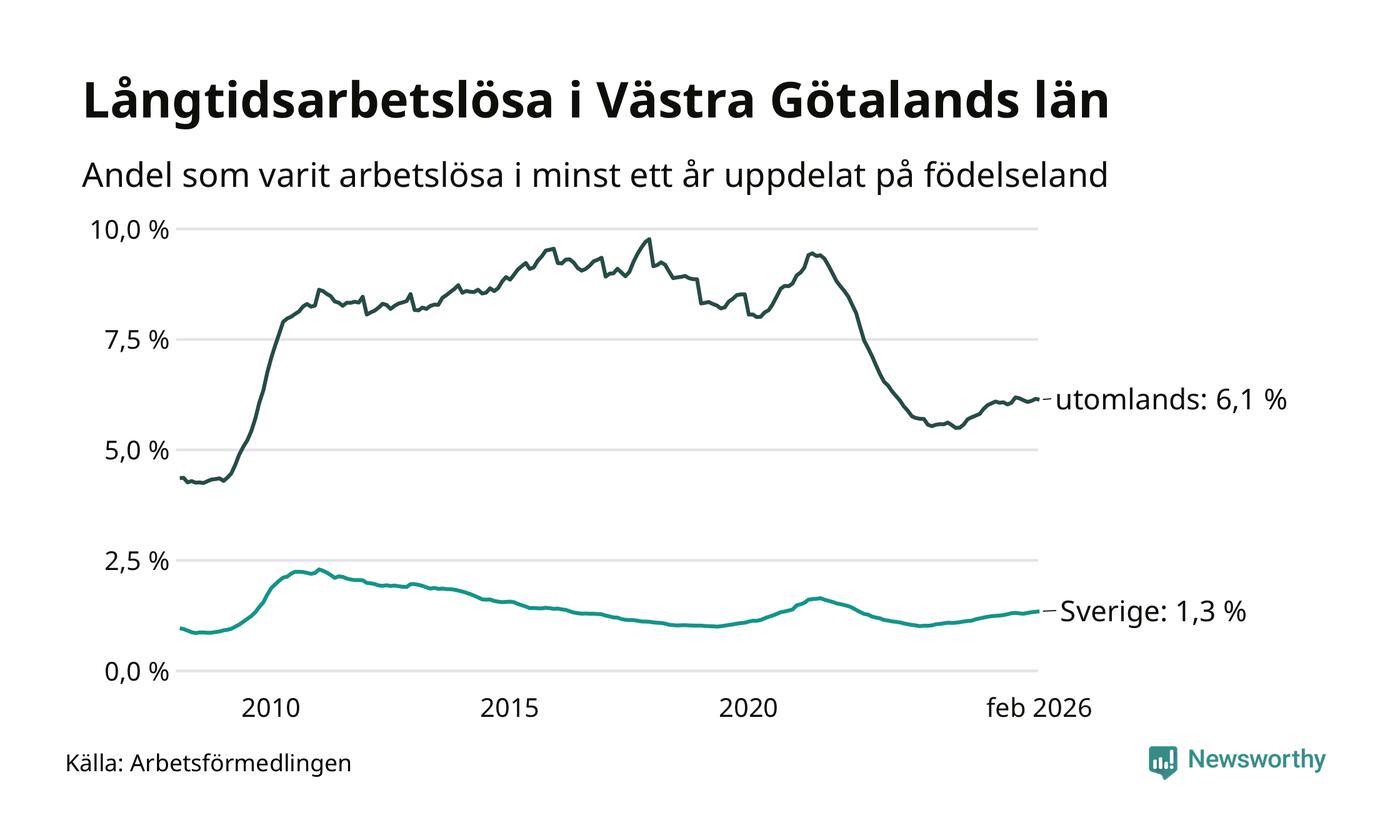 9 209 av de långtidsarbetslösa i Västra Götaland är födda i Sverige och mellan 13 736 och 13 739 är födda utomlands. Det innebär att långtidsarbetslösheten bland Sverigefödda är 1,3 procent, medan den ligger på 6,1 procent för utlandsfödda.