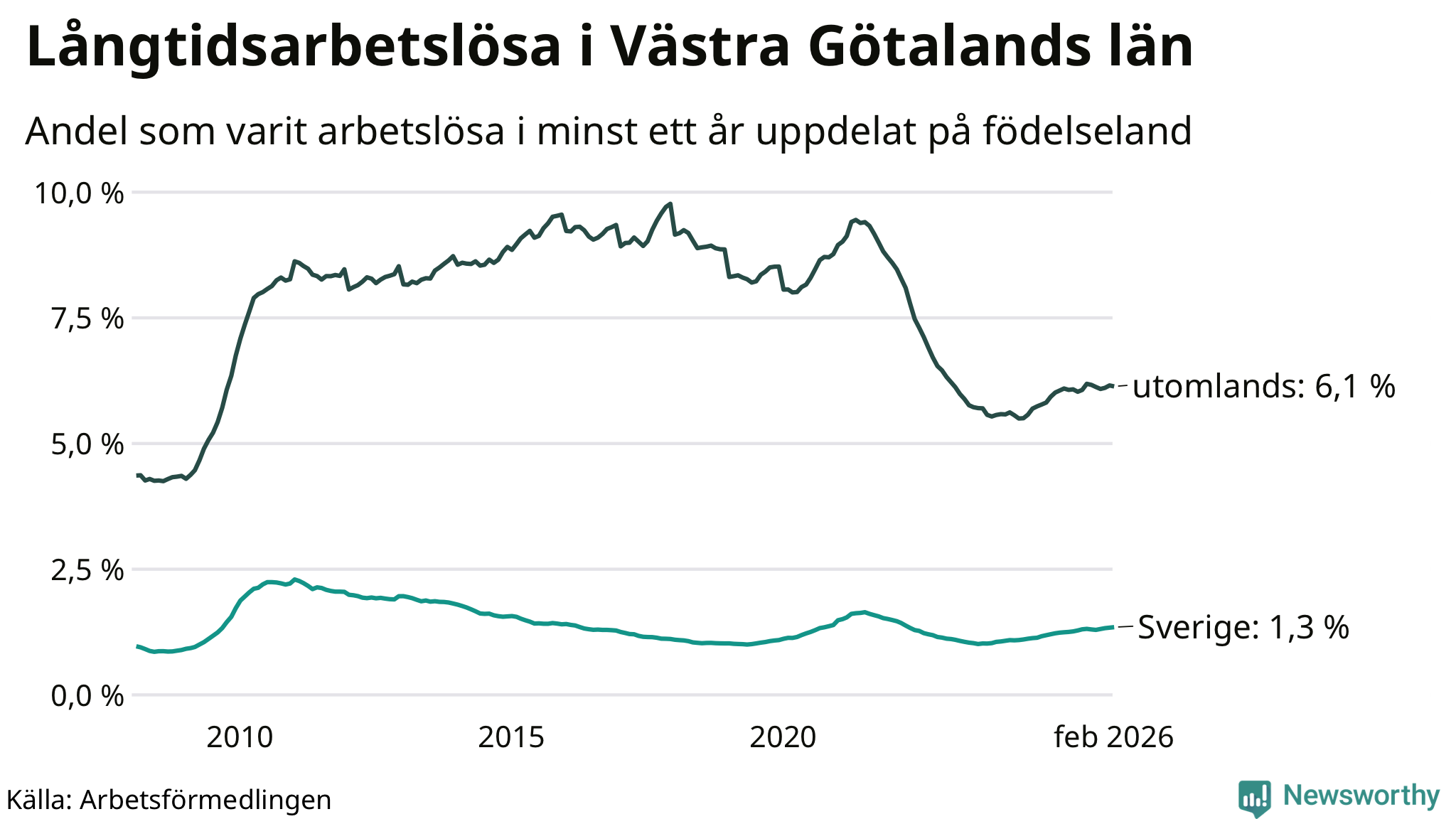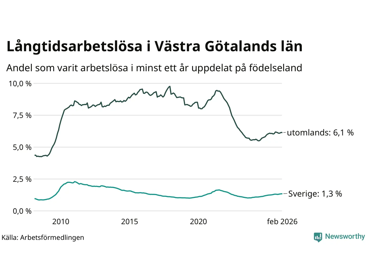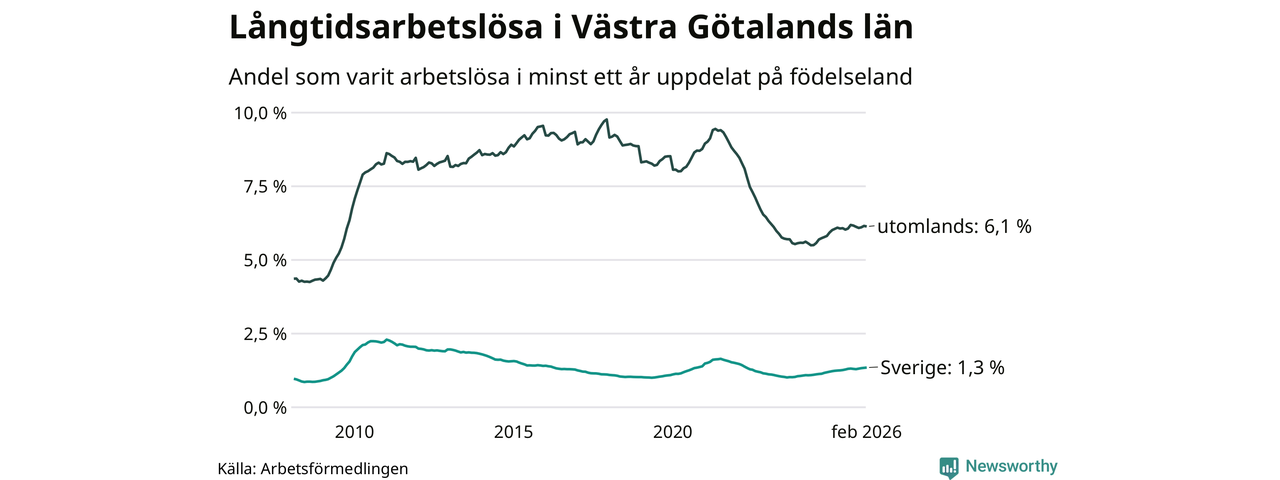 9 209 av de långtidsarbetslösa i Västra Götaland är födda i Sverige och mellan 13 736 och 13 739 är födda utomlands. Det innebär att långtidsarbetslösheten bland Sverigefödda är 1,3 procent, medan den ligger på 6,1 procent för utlandsfödda.