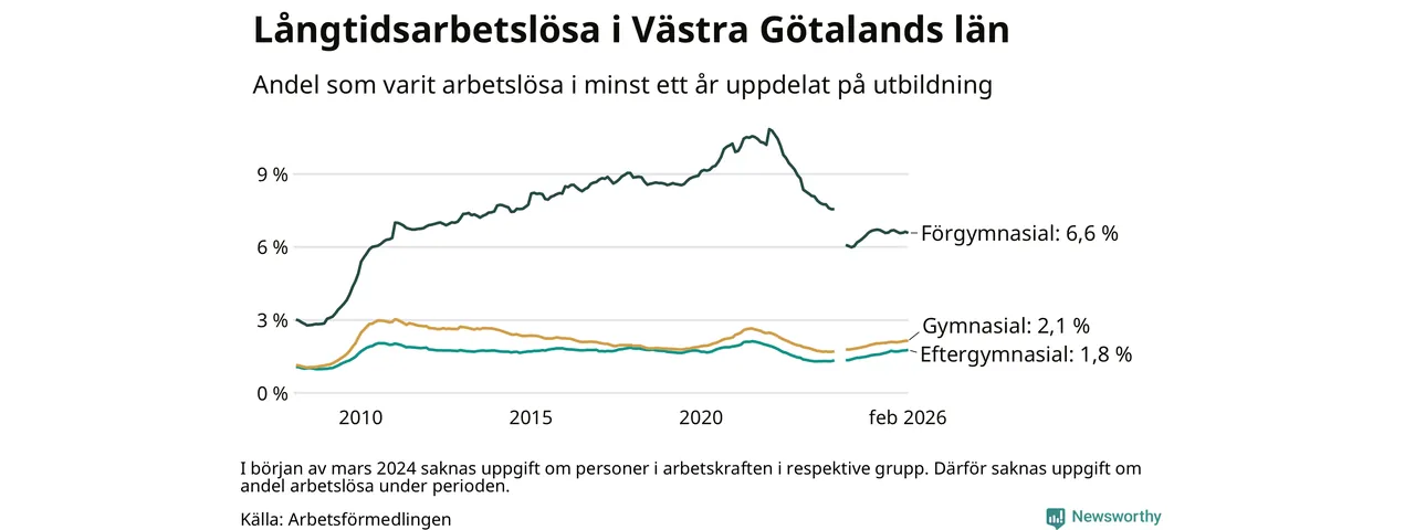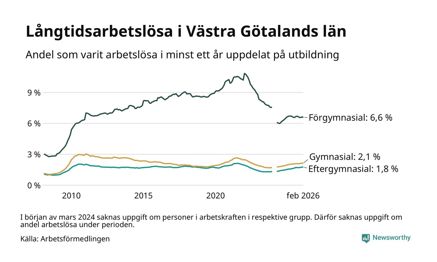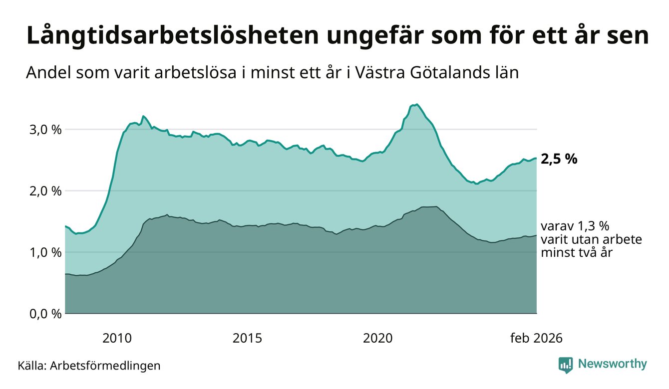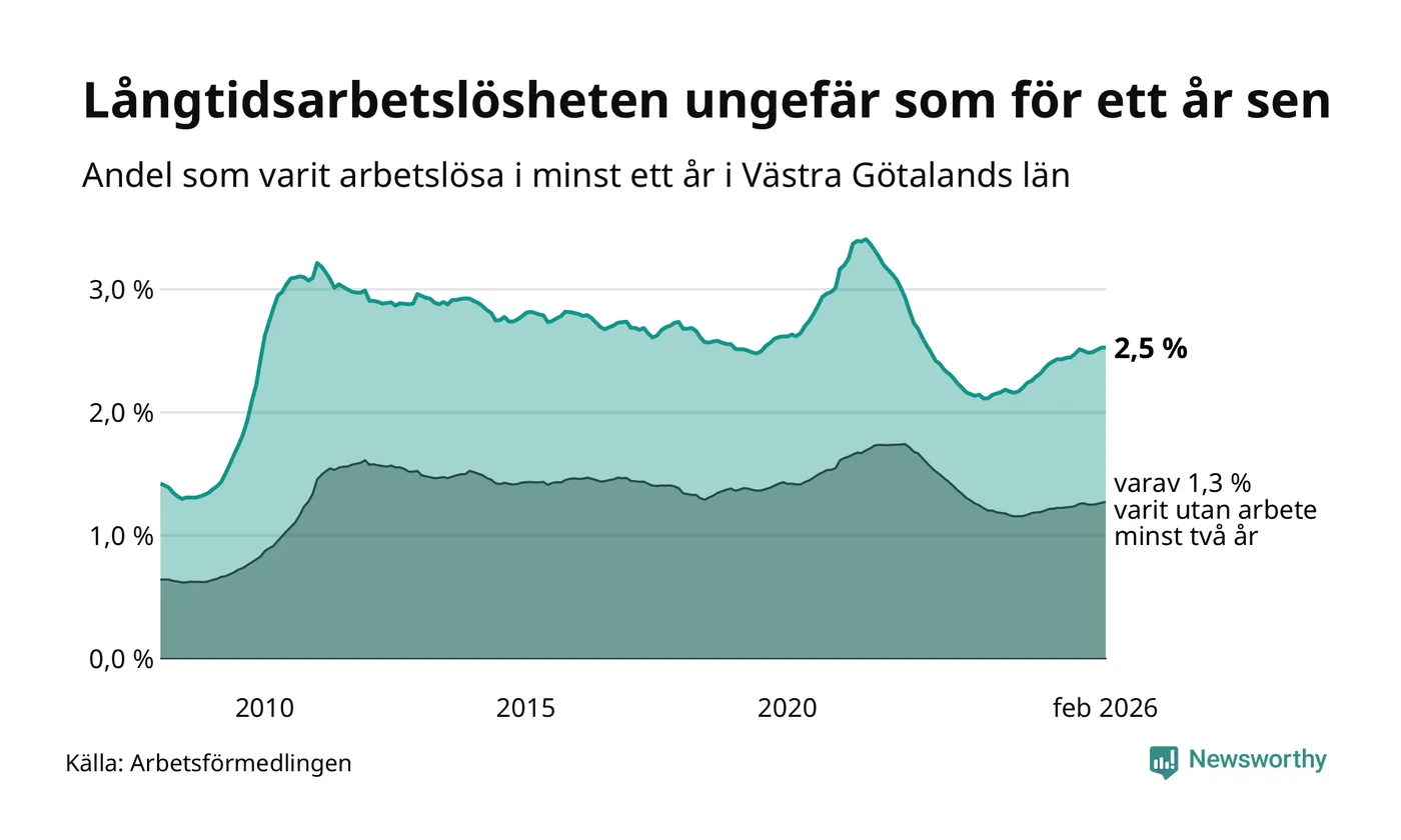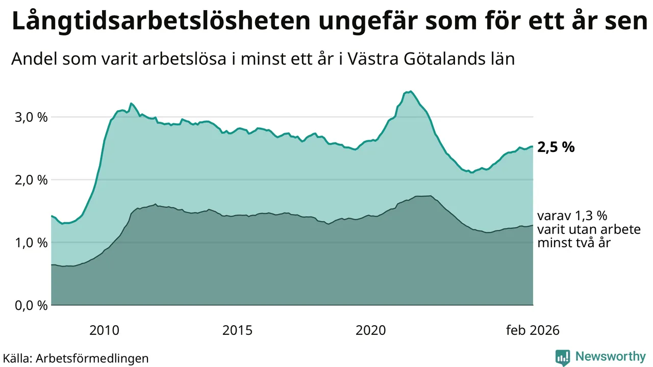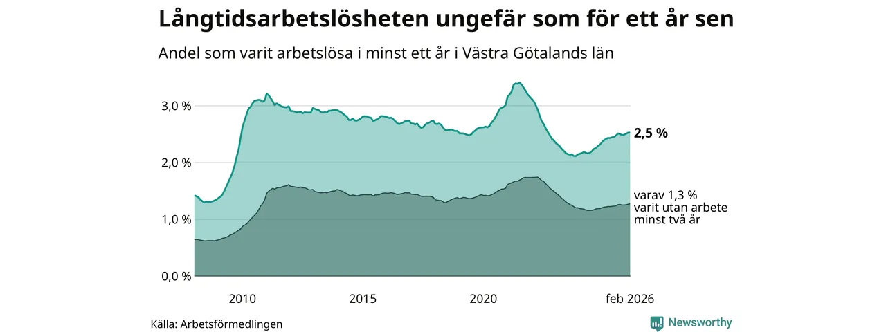 I februari hade 22 944 Västra Götalandsbor varit arbetslösa i minst ett år, vilket är 39 fler än månaden innan. Det är den fjärde månaden i rad med ökande antal långtidsarbetslösa. 22 944 personer motsvarar 2,5 procent av arbetskraften i länet – andelen långtidsarbetslösa är ungefär på samma nivå som för ett år sedan.