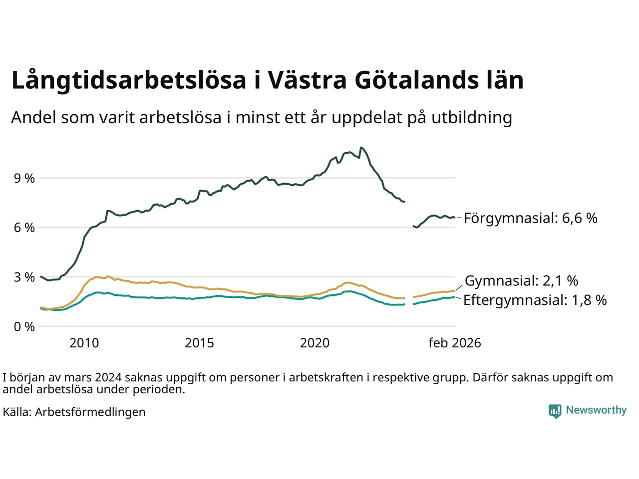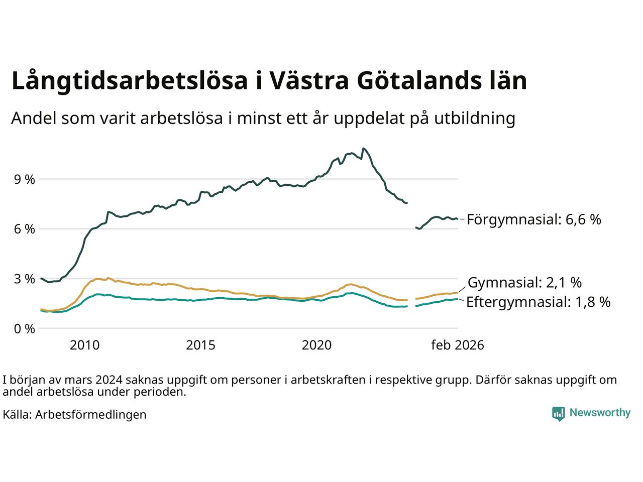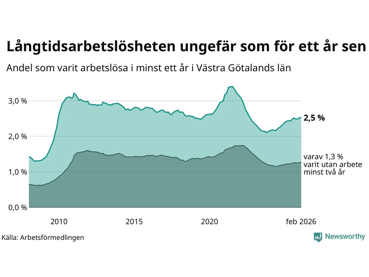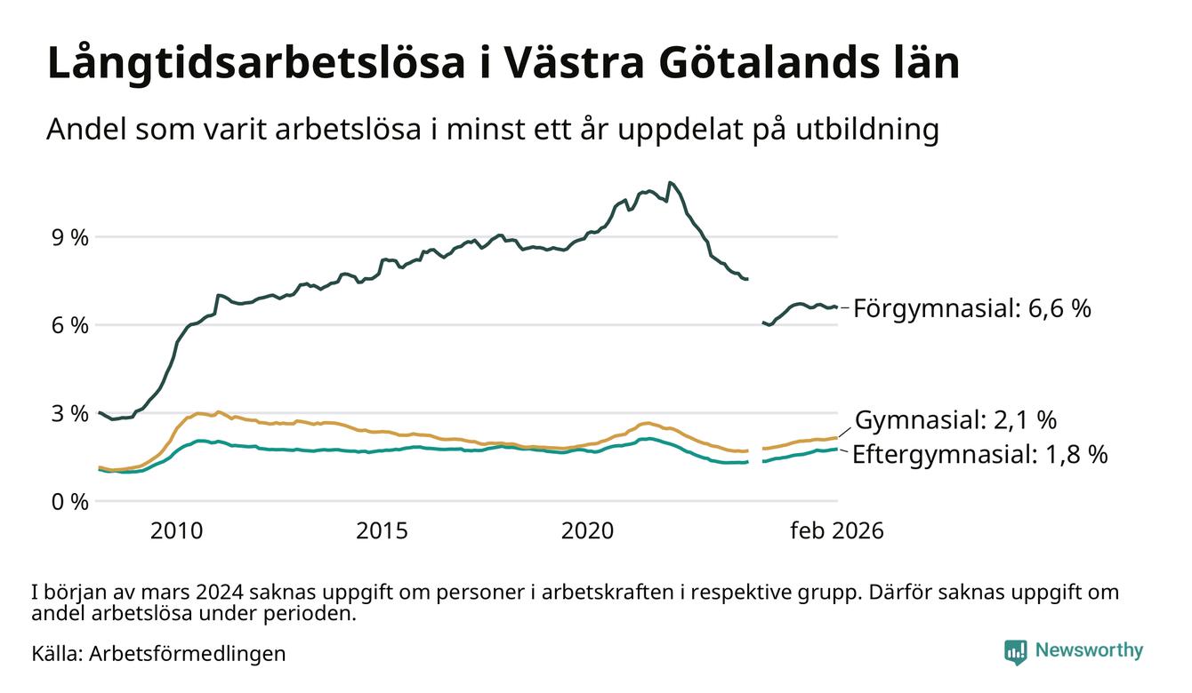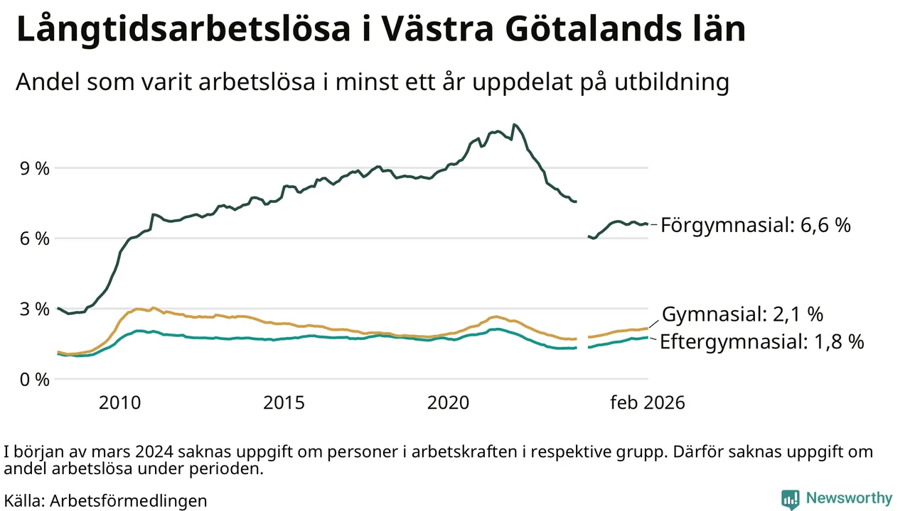 I februari hade 22 944 Västra Götalandsbor varit arbetslösa i minst ett år, vilket är 39 fler än månaden innan. Det är den fjärde månaden i rad med ökande antal långtidsarbetslösa. 22 944 personer motsvarar 2,5 procent av arbetskraften i länet – andelen långtidsarbetslösa är ungefär på samma nivå som för ett år sedan.