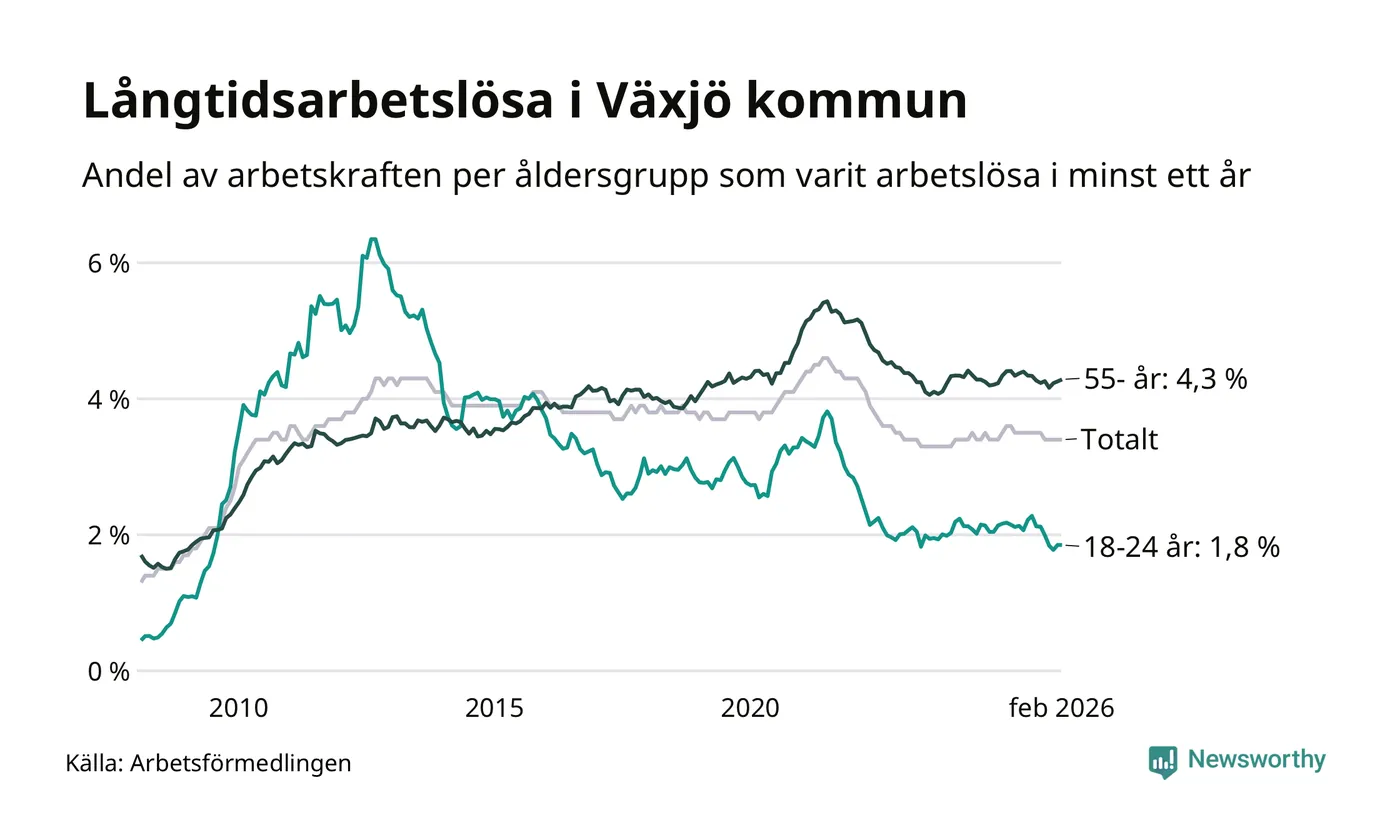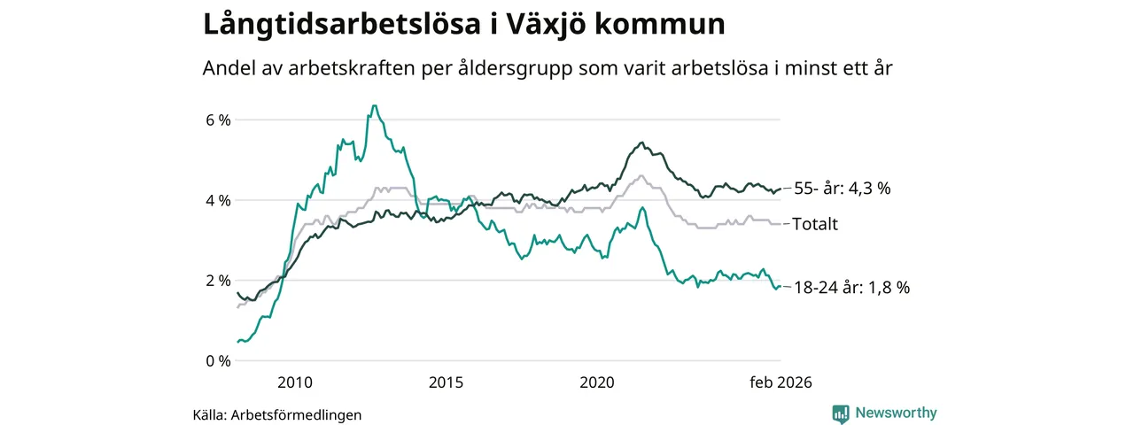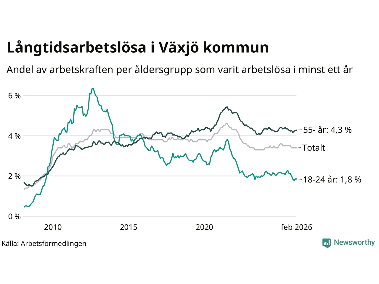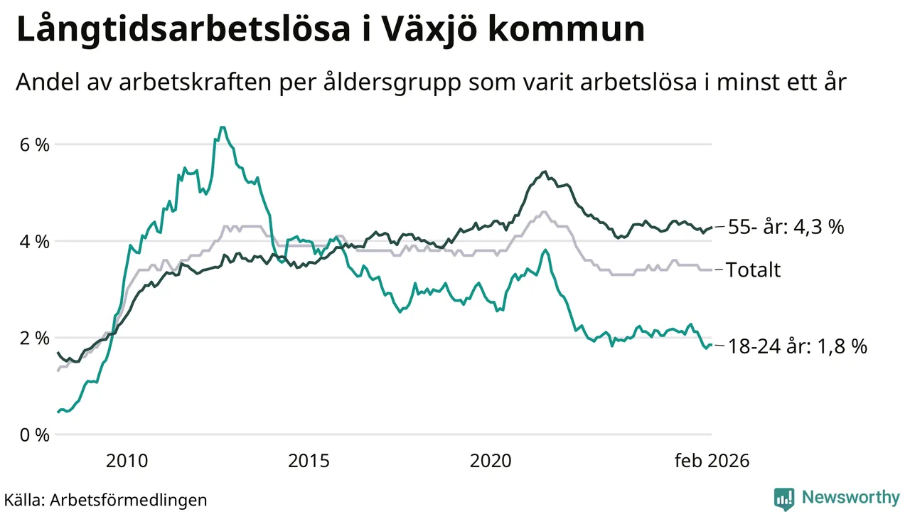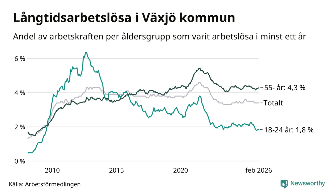 Av de 1 724 personerna som varit arbetslösa i mer än ett år i Växjö kommun är 411 personer mellan 55 och 661 år och 124 är mellan 18 och 24 år. För den äldre gruppen är andelen arbetslösa 4,3 procent medan den i den yngre gruppen är 1,8 procent. Även i riket som helhet är långtidsarbetslösheten högre i gruppen äldre.