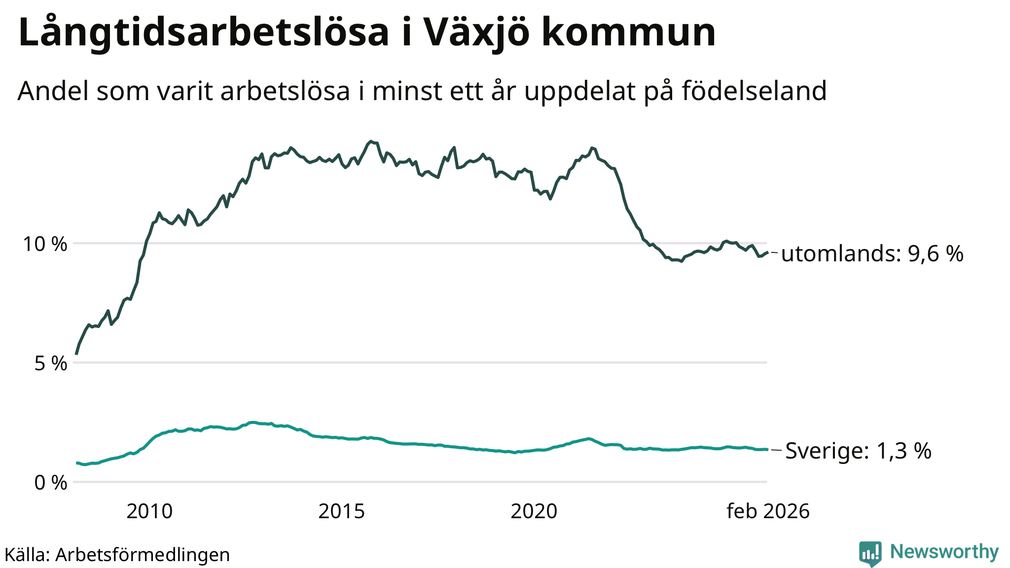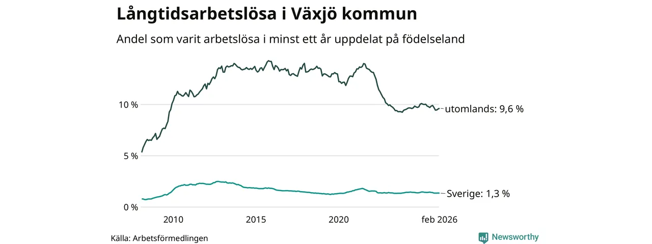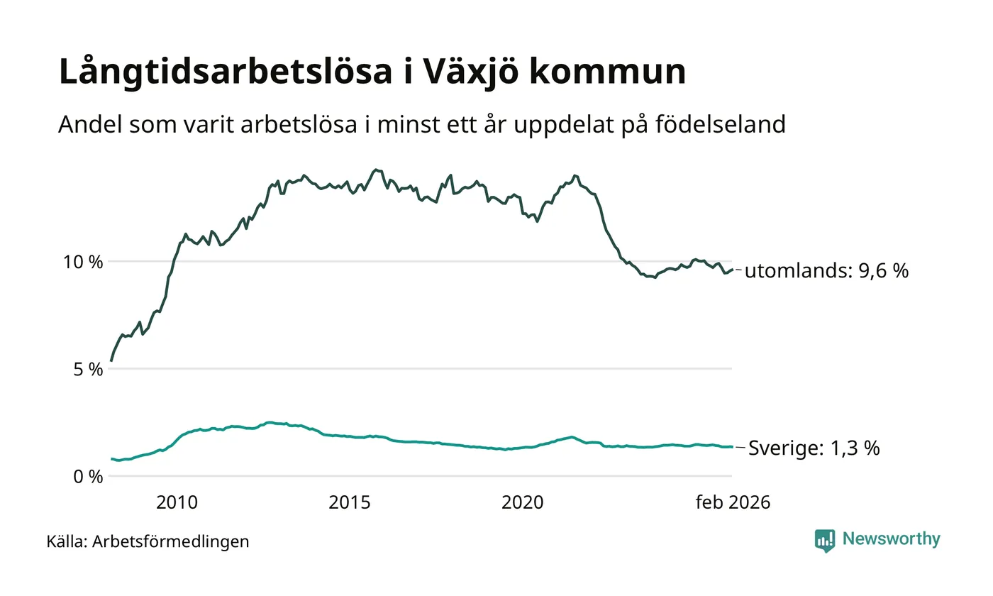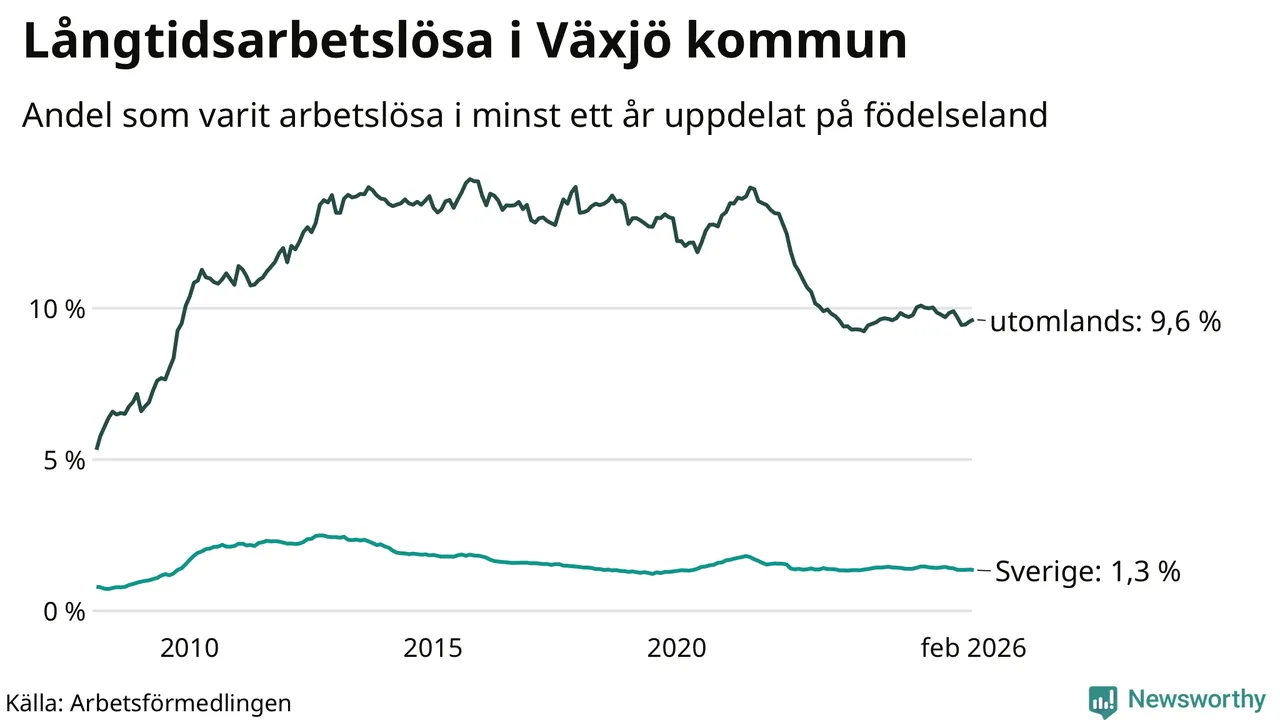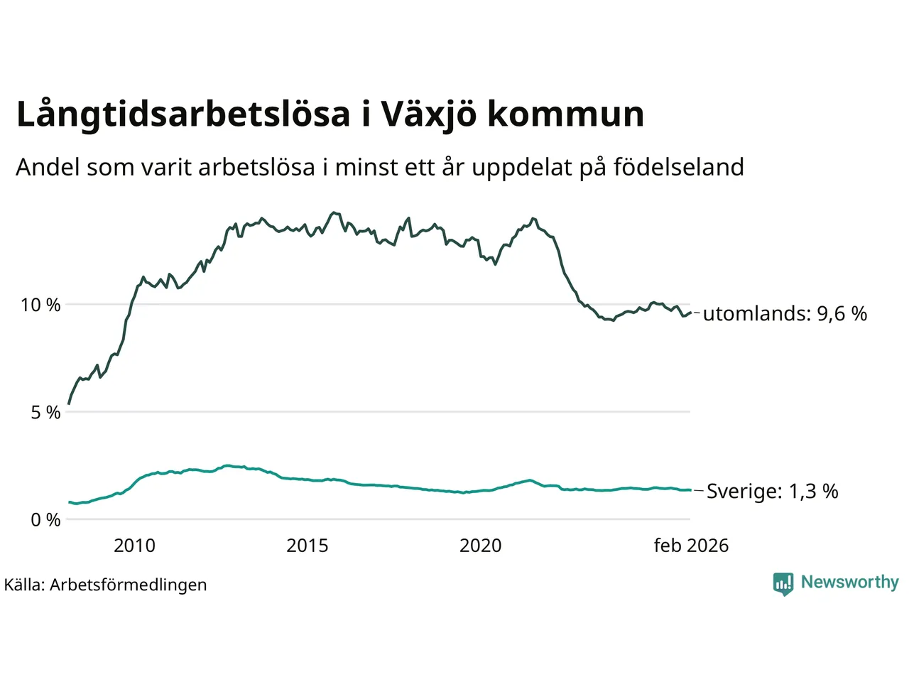 511 av de långtidsarbetslösa i Växjö är födda i Sverige, medan 1 213 är födda utomlands. Det innebär att långtidsarbetslösheten bland Sverigefödda är 1,3 procent, medan den är sju gånger så hög – 9,6 procent – bland födda utomlands. Även i riket som helhet är arbetslösheten högre bland utrikesfödda.