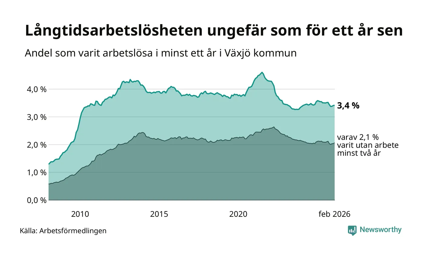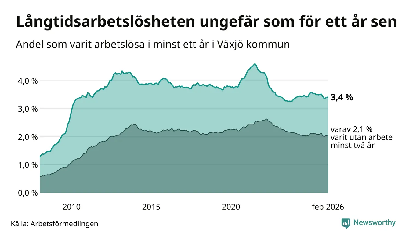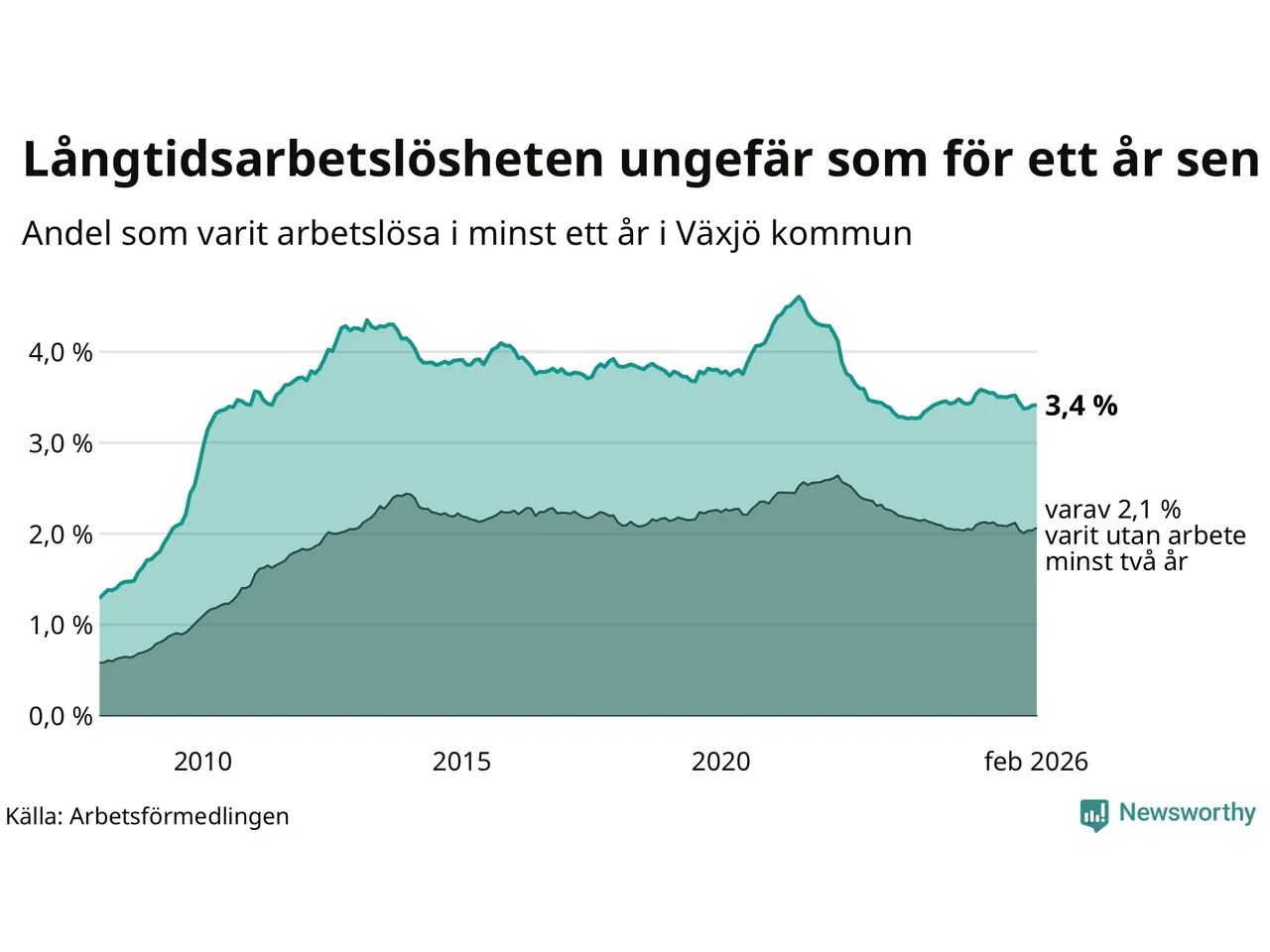 I februari hade 1 724 Växjöbor varit arbetslösa i minst ett år, vilket är fyra fler än månaden innan. 1 724 personer motsvarar 3,4 procent av arbetskraften i kommunen – andelen långtidsarbetslösa är ungefär på samma nivå som för ett år sedan.
