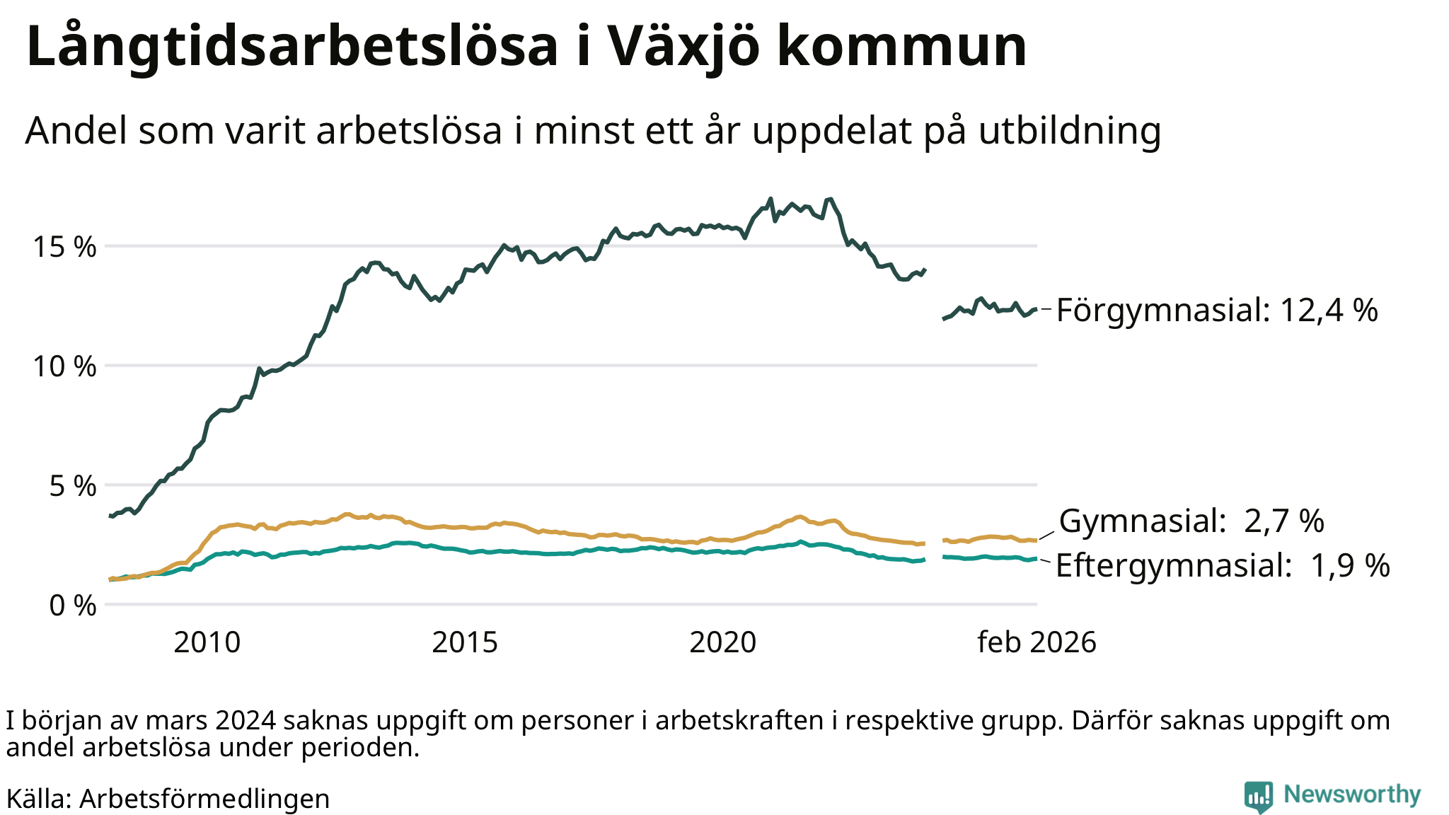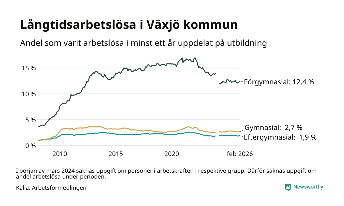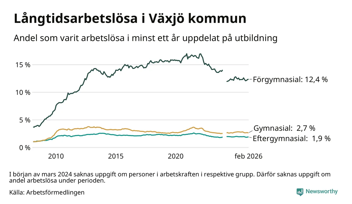I februari hade 1 724 Växjöbor varit arbetslösa i minst ett år, vilket är fyra fler än månaden innan. 1 724 personer motsvarar 3,4 procent av arbetskraften i kommunen – andelen långtidsarbetslösa är ungefär på samma nivå som för ett år sedan.