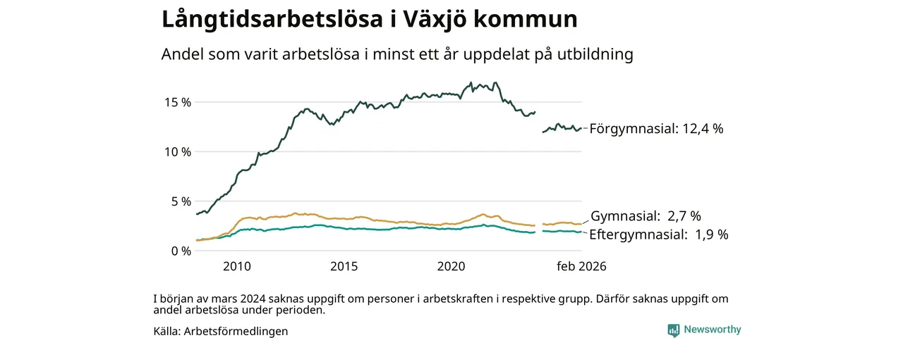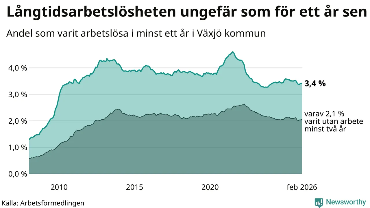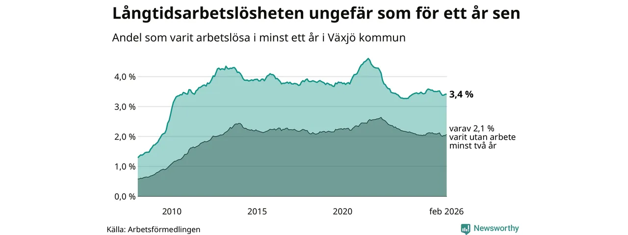 Andelen som varit utan arbete i minst ett år i Växjö var ungefär lika stor i februari jämfört med samma månad för ett år sedan. Det visar Arbetsfömedlingens senaste månadsstatistik.