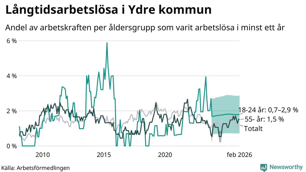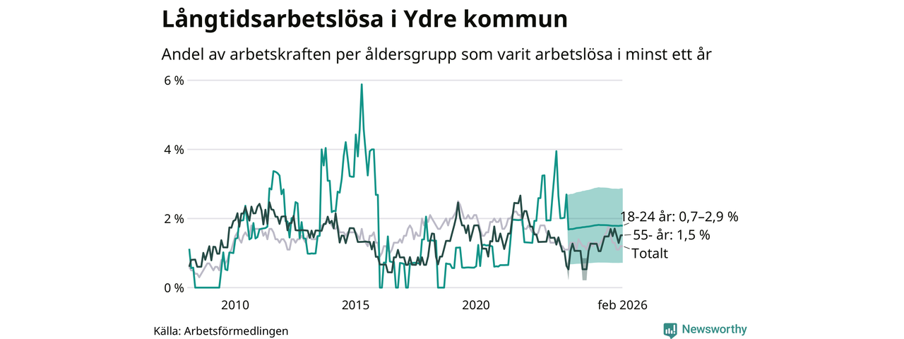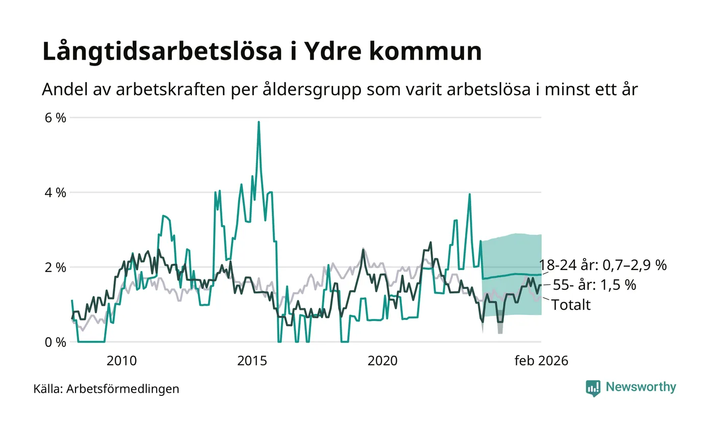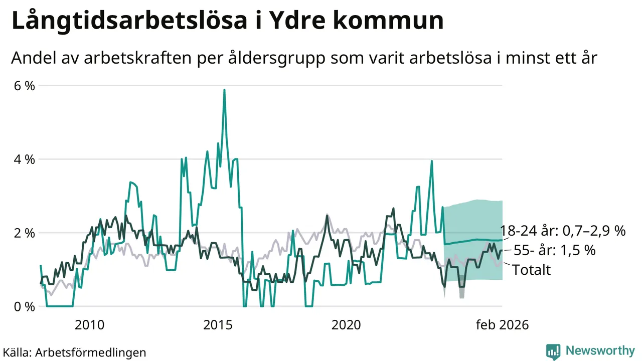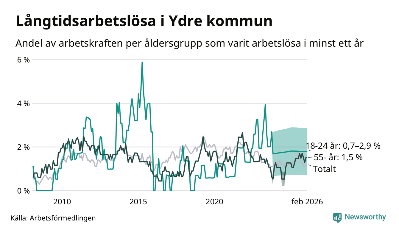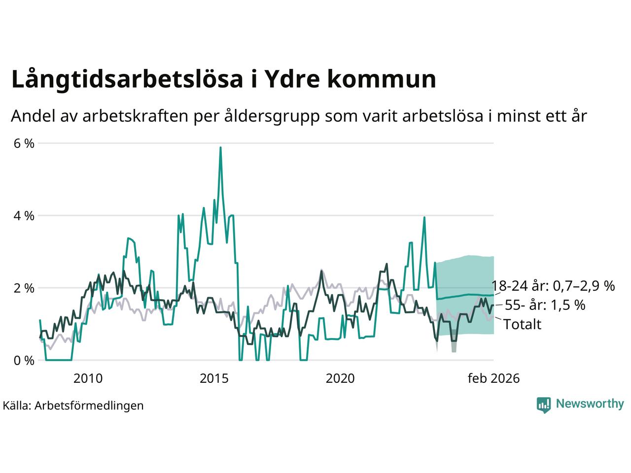 Av de 20 personerna som varit arbetslösa i mer än ett år i Ydre kommun är sju personer mellan 55 och 661 år och mellan en och fyra är mellan 18 och 24 år. För den äldre gruppen är andelen arbetslösa 1,5 procent medan den i den yngre gruppen är mellan 0,7 och 2,9 procent. Även i riket som helhet är långtidsarbetslösheten högre i gruppen äldre.