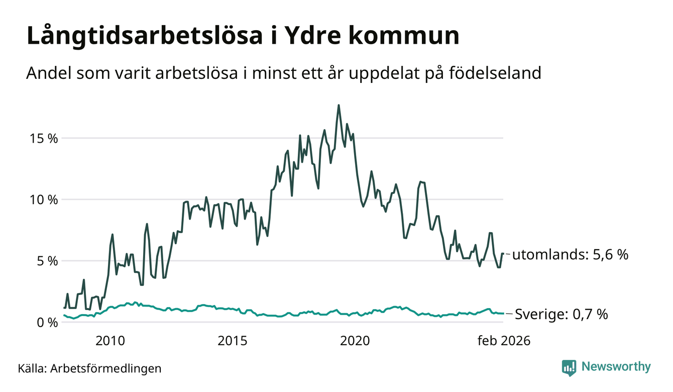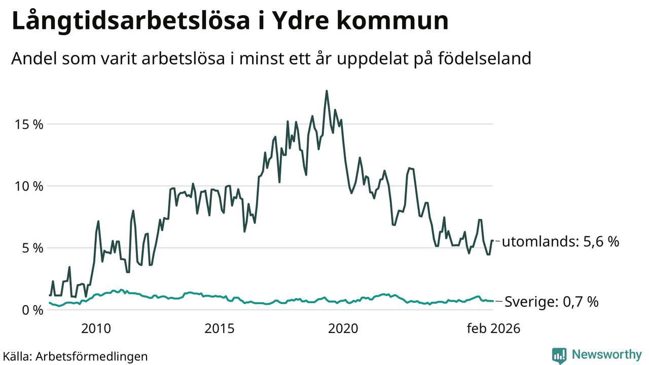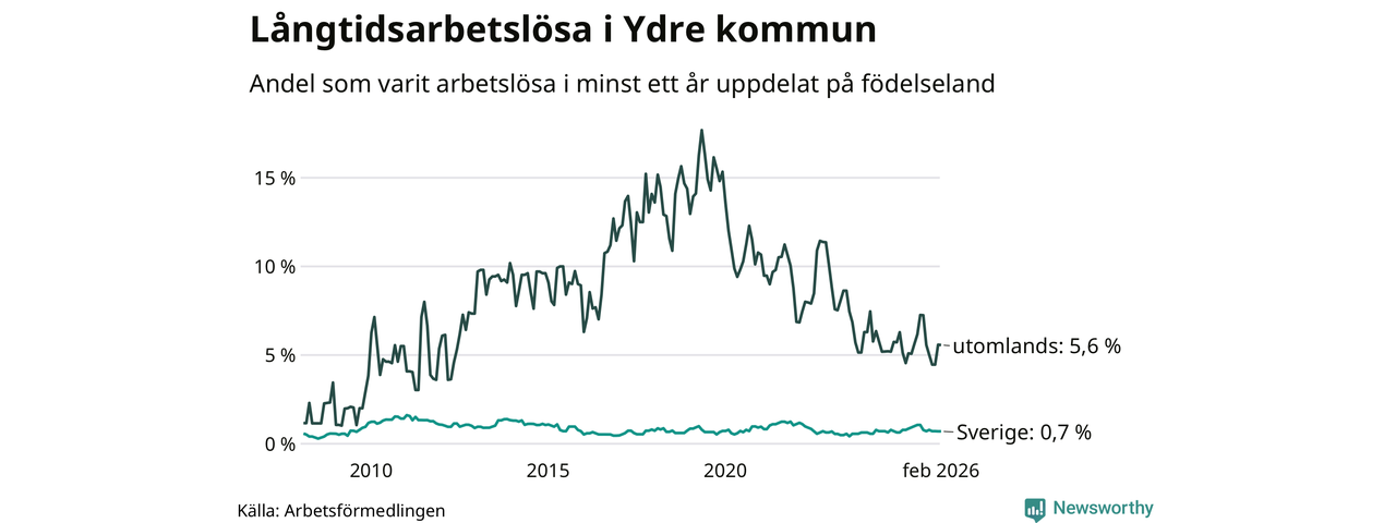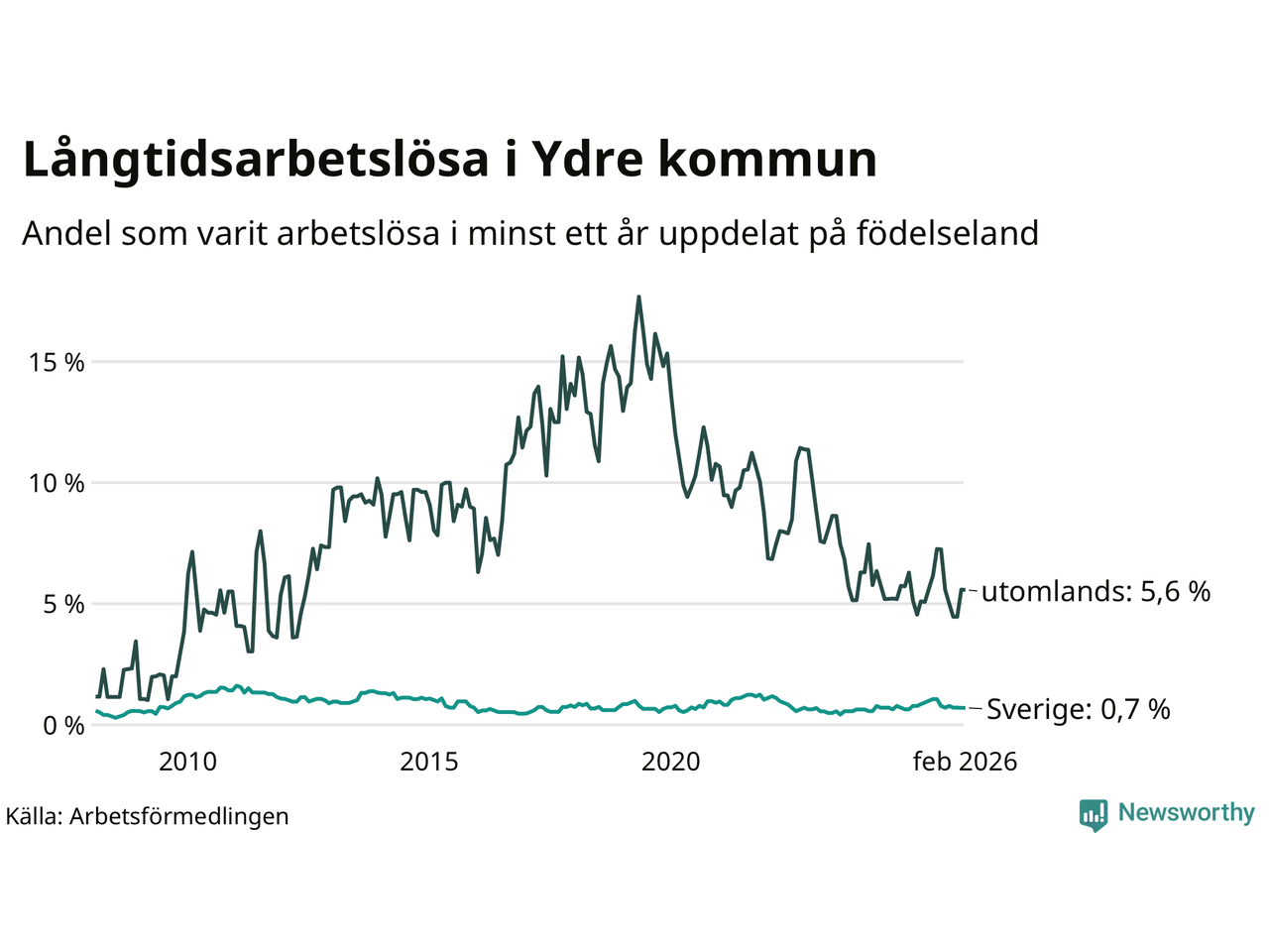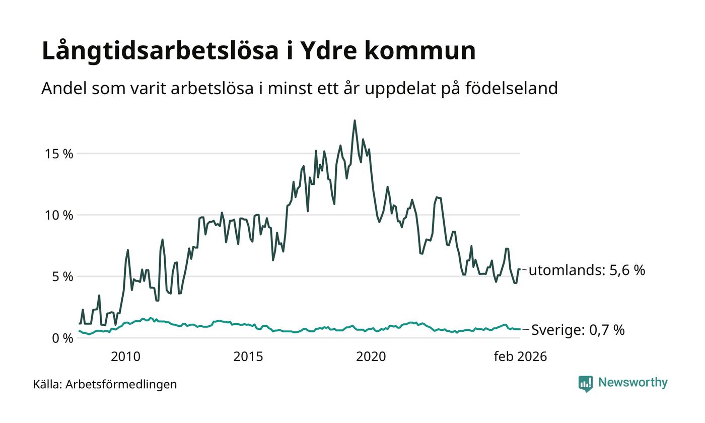 Tio av de långtidsarbetslösa i Ydre är födda i Sverige, medan tio är födda utomlands. Det innebär att långtidsarbetslösheten bland Sverigefödda är 0,7 procent, medan den är 5,6 procent bland födda utomlands. Även i riket som helhet är arbetslösheten högre bland utrikesfödda.