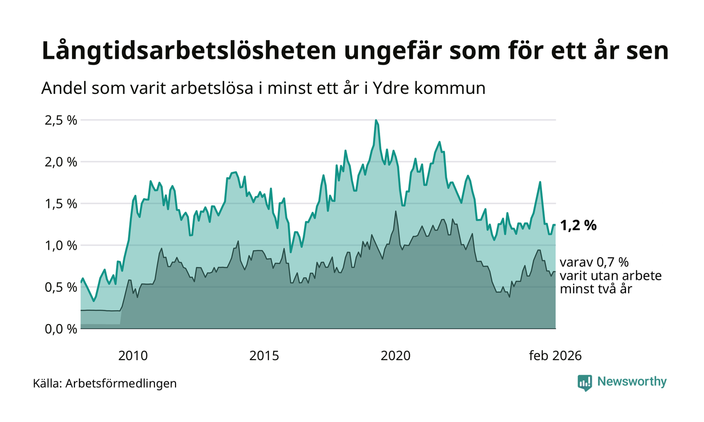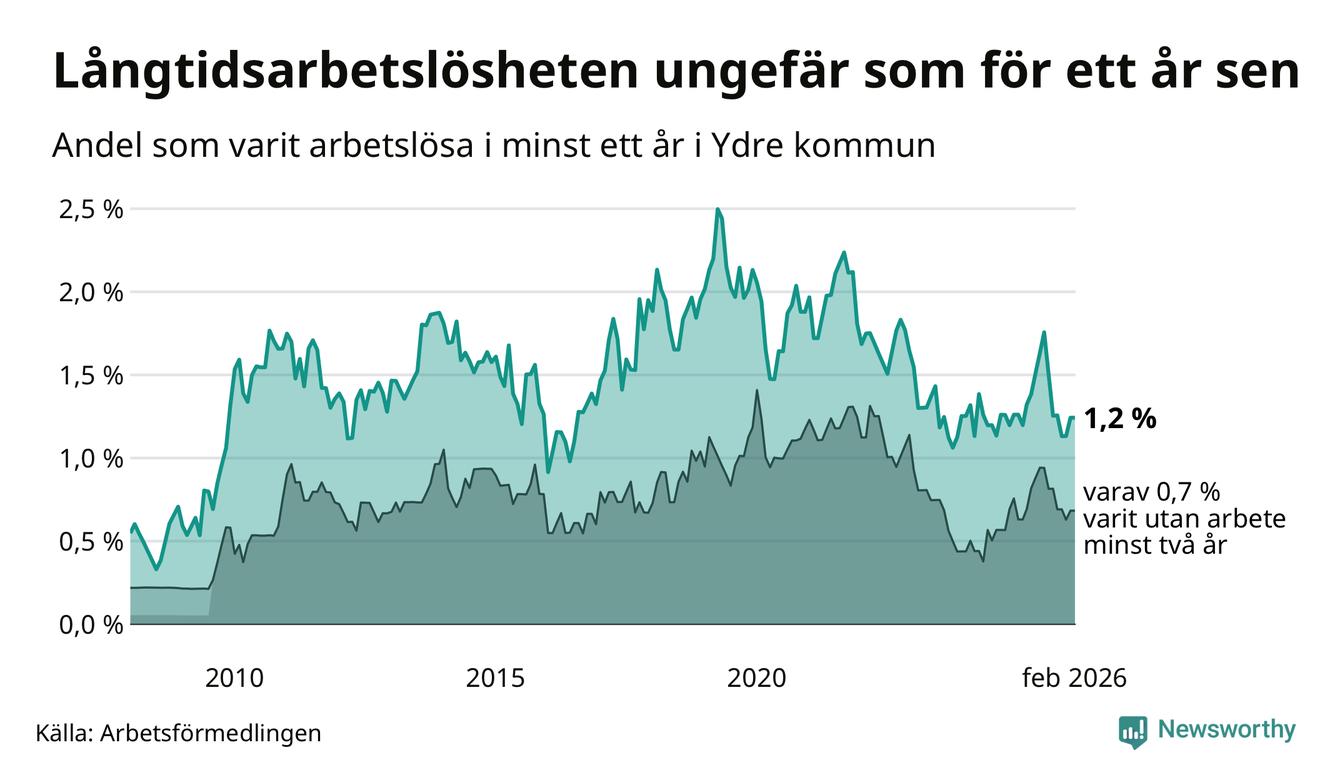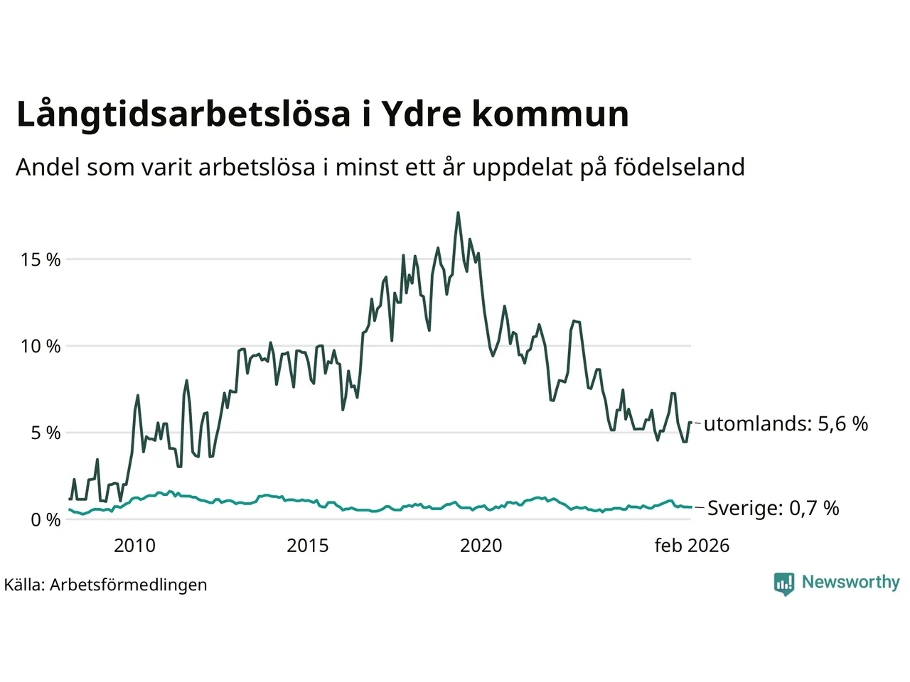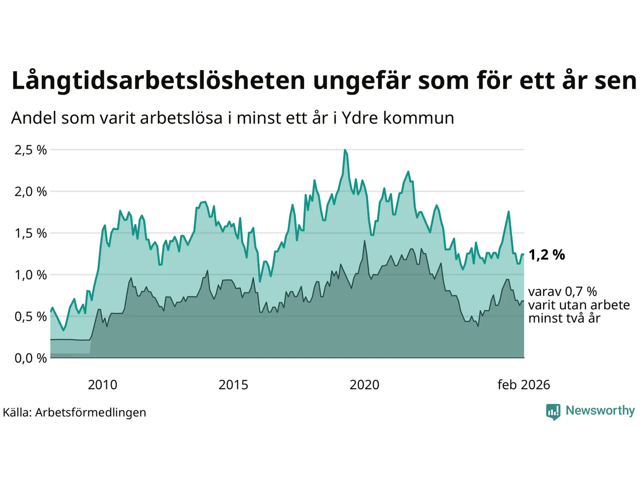I februari hade 20 Ydrebor varit arbetslösa i minst ett år, vilket är lika många som månaden innan. 20 personer motsvarar 1,2 procent av arbetskraften i kommunen – andelen långtidsarbetslösa är ungefär på samma nivå som för ett år sedan. Ydre tillhör de kommuner som har lägst andel långtidsarbetslösa i hela landet just nu.