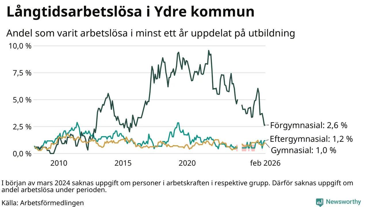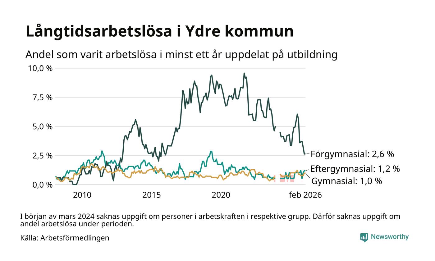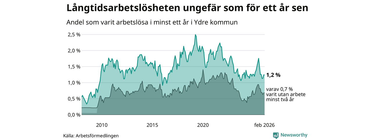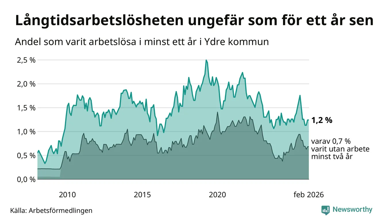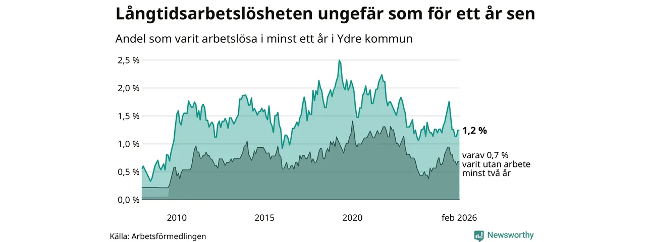 Andelen som varit utan arbete i minst ett år i Ydre var ungefär lika stor i februari jämfört med samma månad för ett år sedan. Det visar Arbetsfömedlingens senaste månadsstatistik.