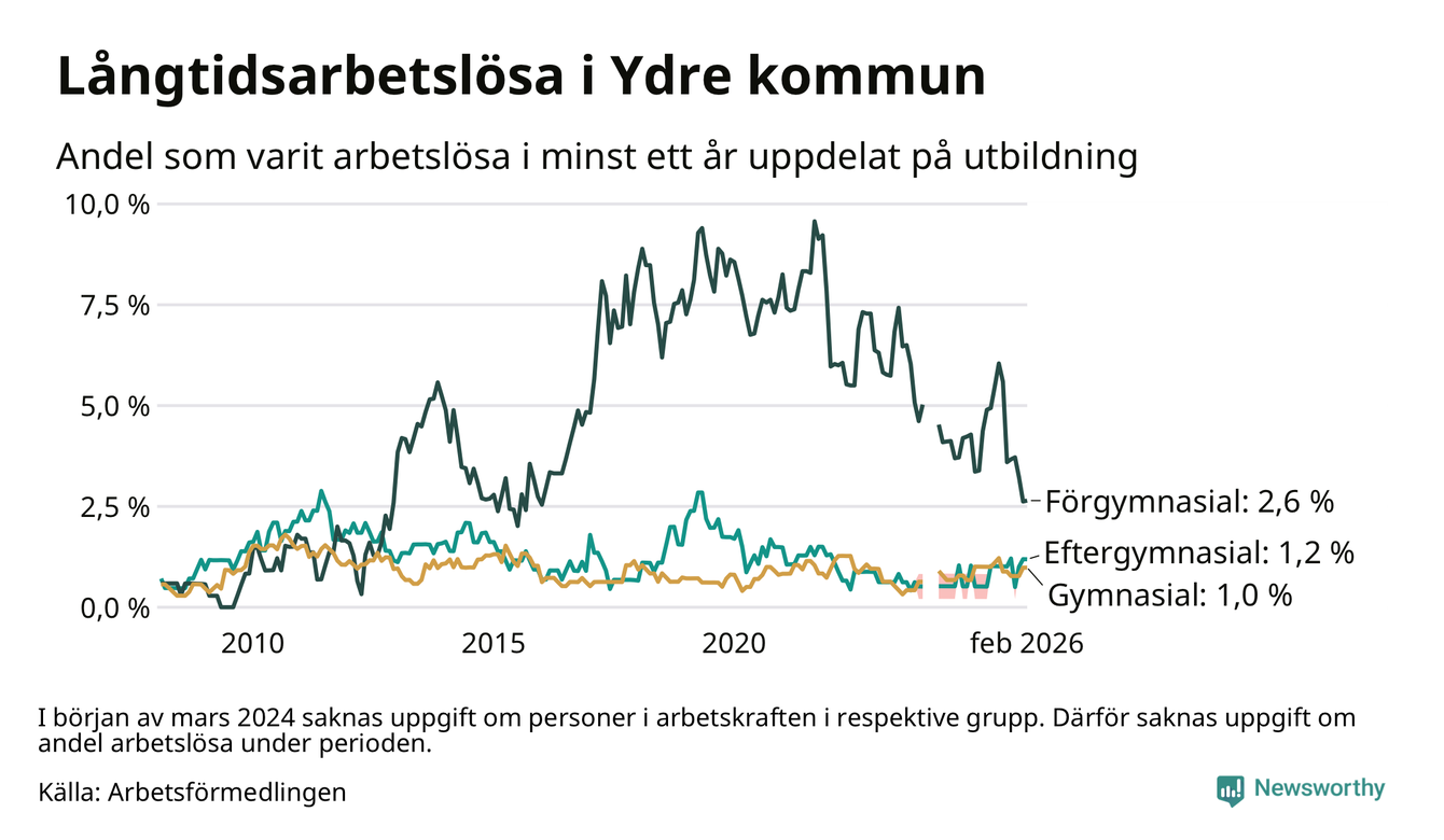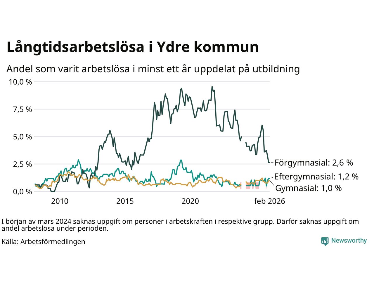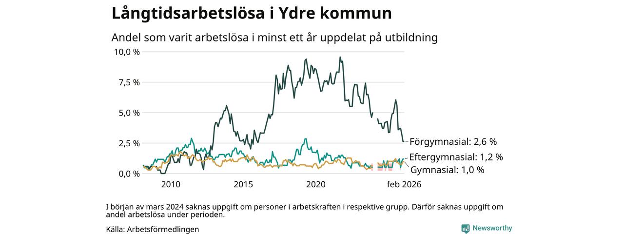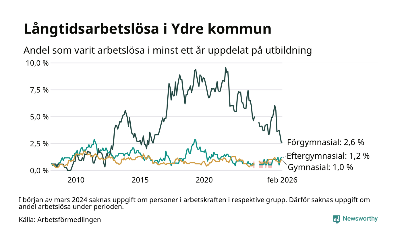 Andelen som varit utan arbete i minst ett år i Ydre var ungefär lika stor i februari jämfört med samma månad för ett år sedan. Det visar Arbetsfömedlingens senaste månadsstatistik.