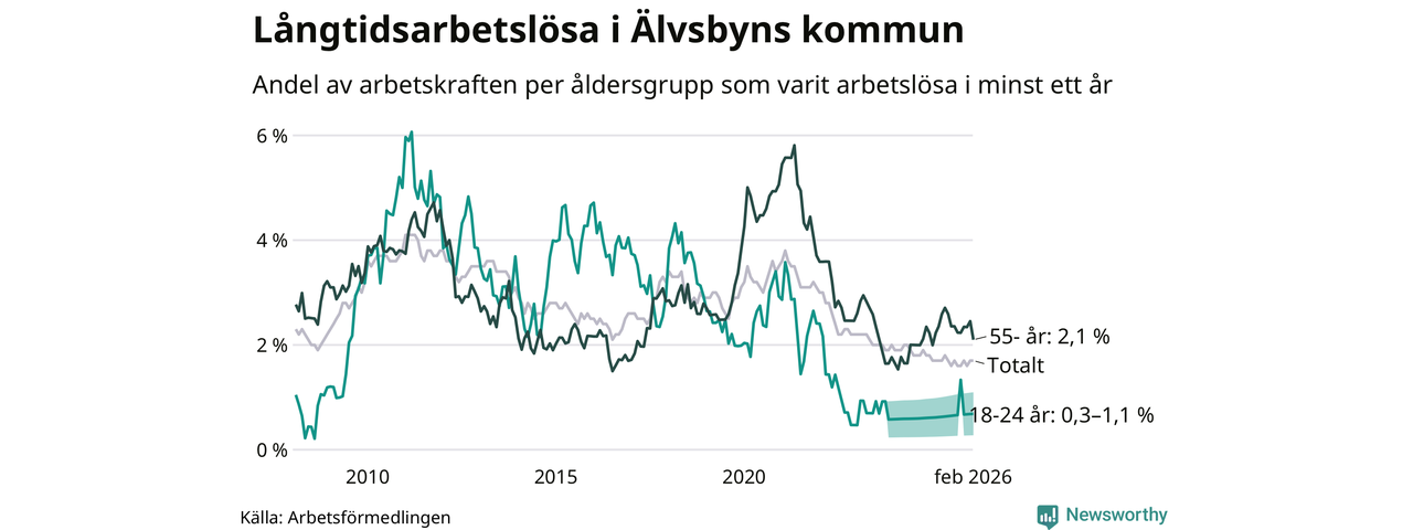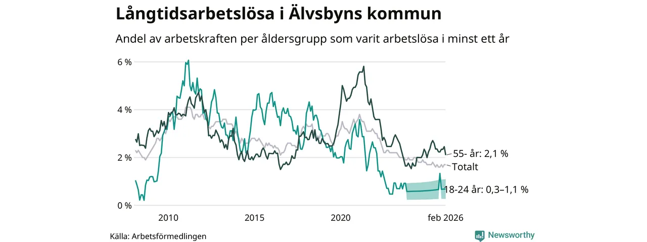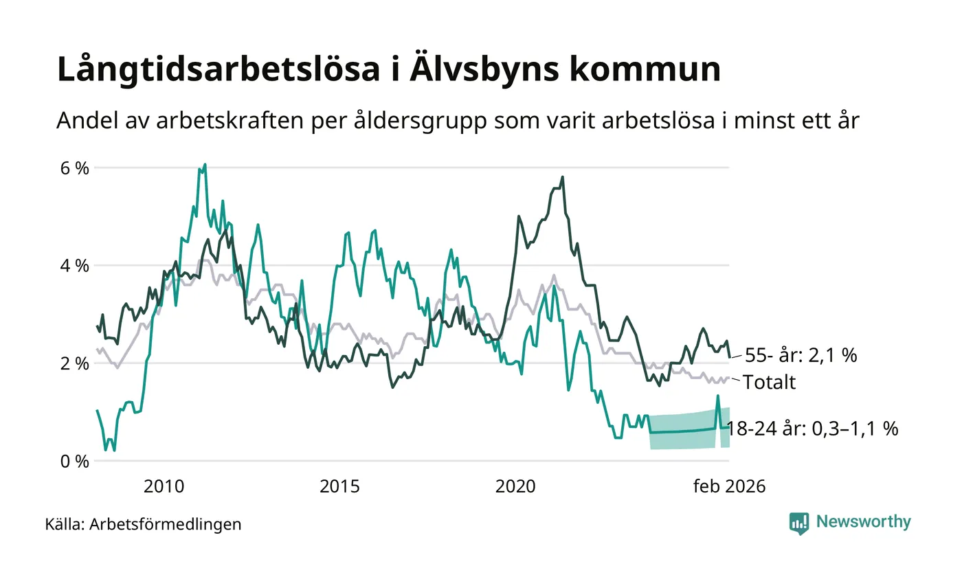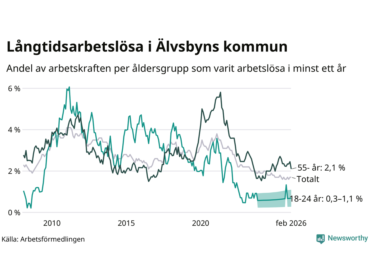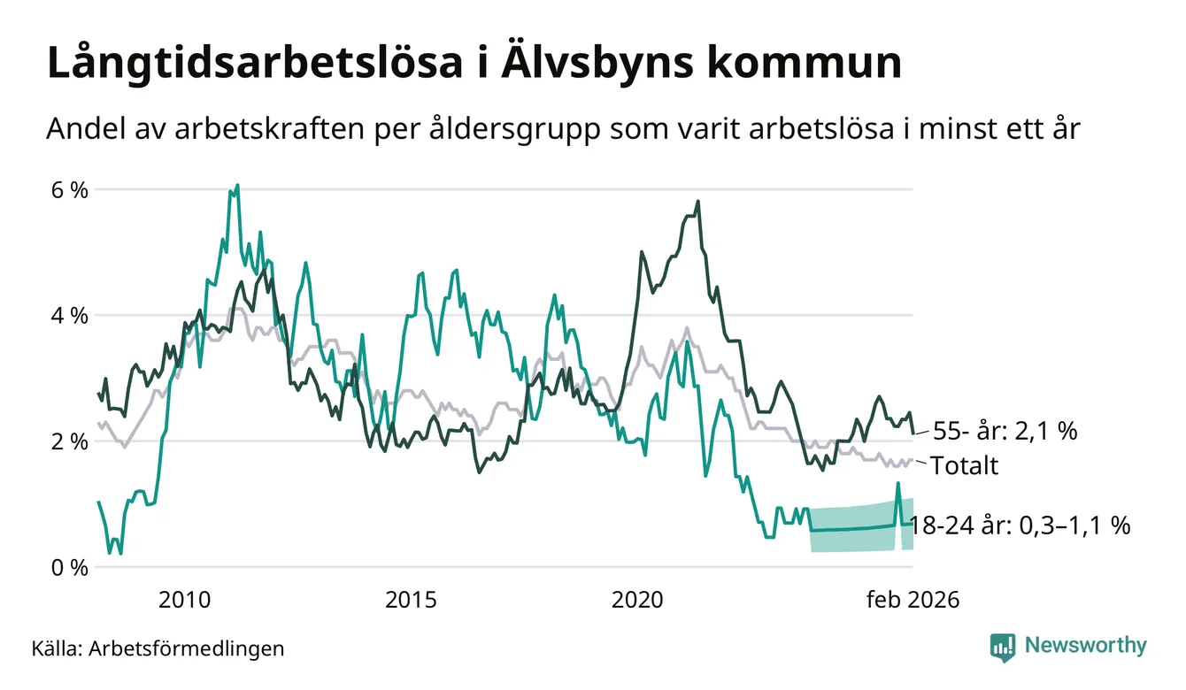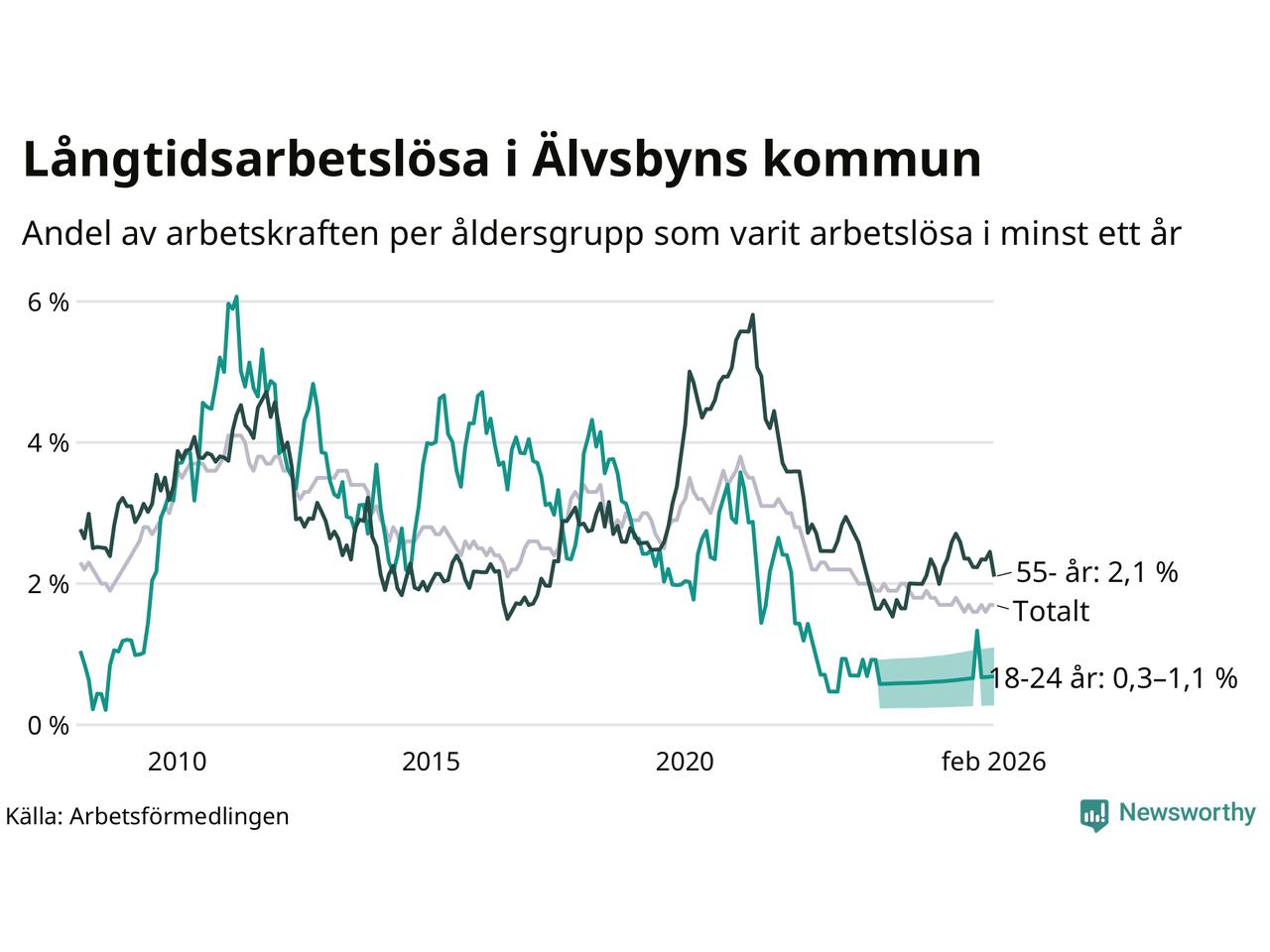 Av de 60 personerna som varit arbetslösa i mer än ett år i Älvsbyns kommun är 18 personer mellan 55 och 661 år och mellan en och fyra är mellan 18 och 24 år. För den äldre gruppen är andelen arbetslösa 2,1 procent medan den i den yngre gruppen är mellan 0,3 och 1,1 procent. Även i riket som helhet är långtidsarbetslösheten högre i gruppen äldre.